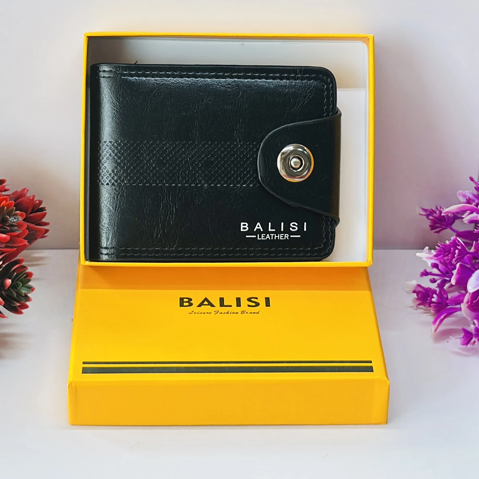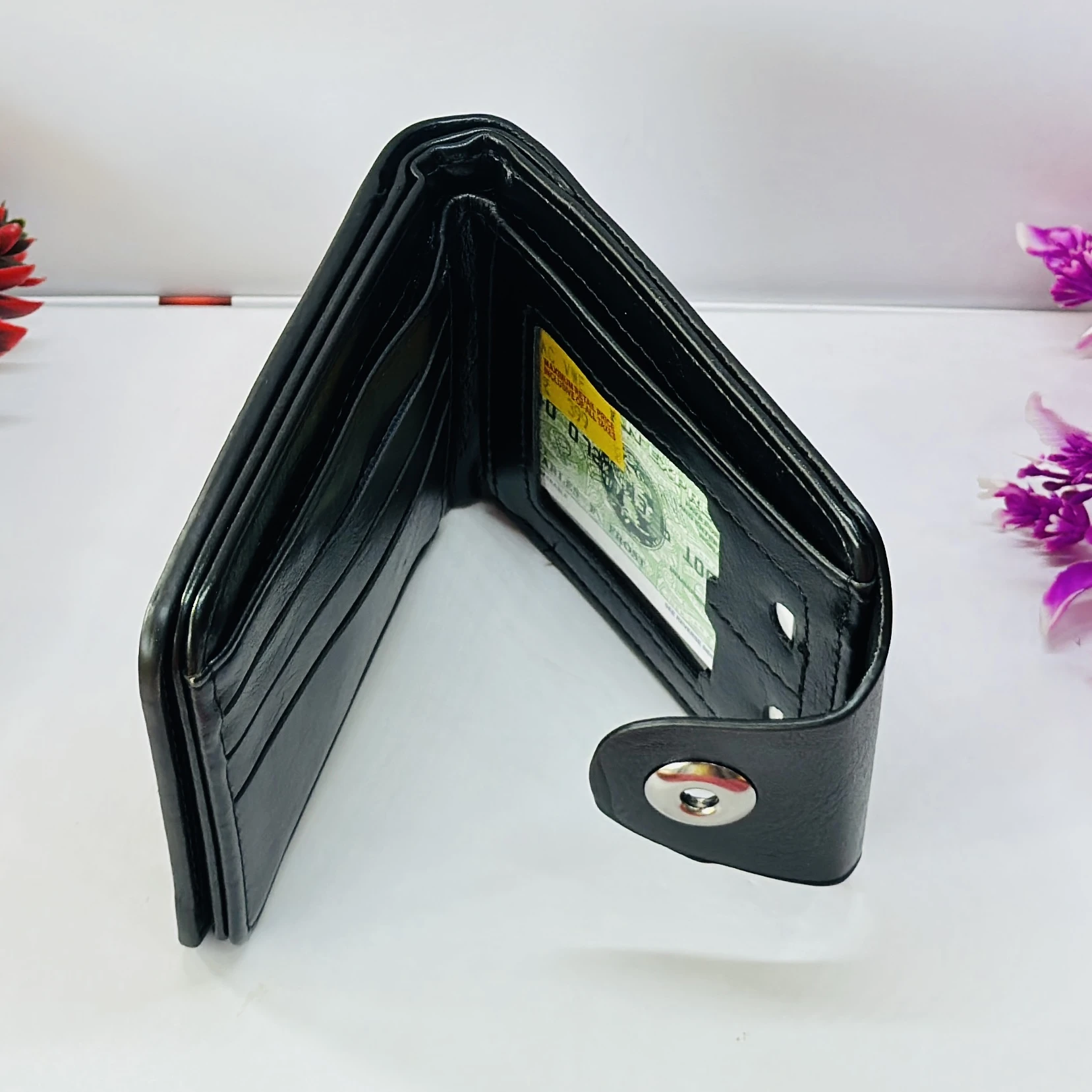 👉 Theme :- Black leather bi-fold wallet with a button closure.