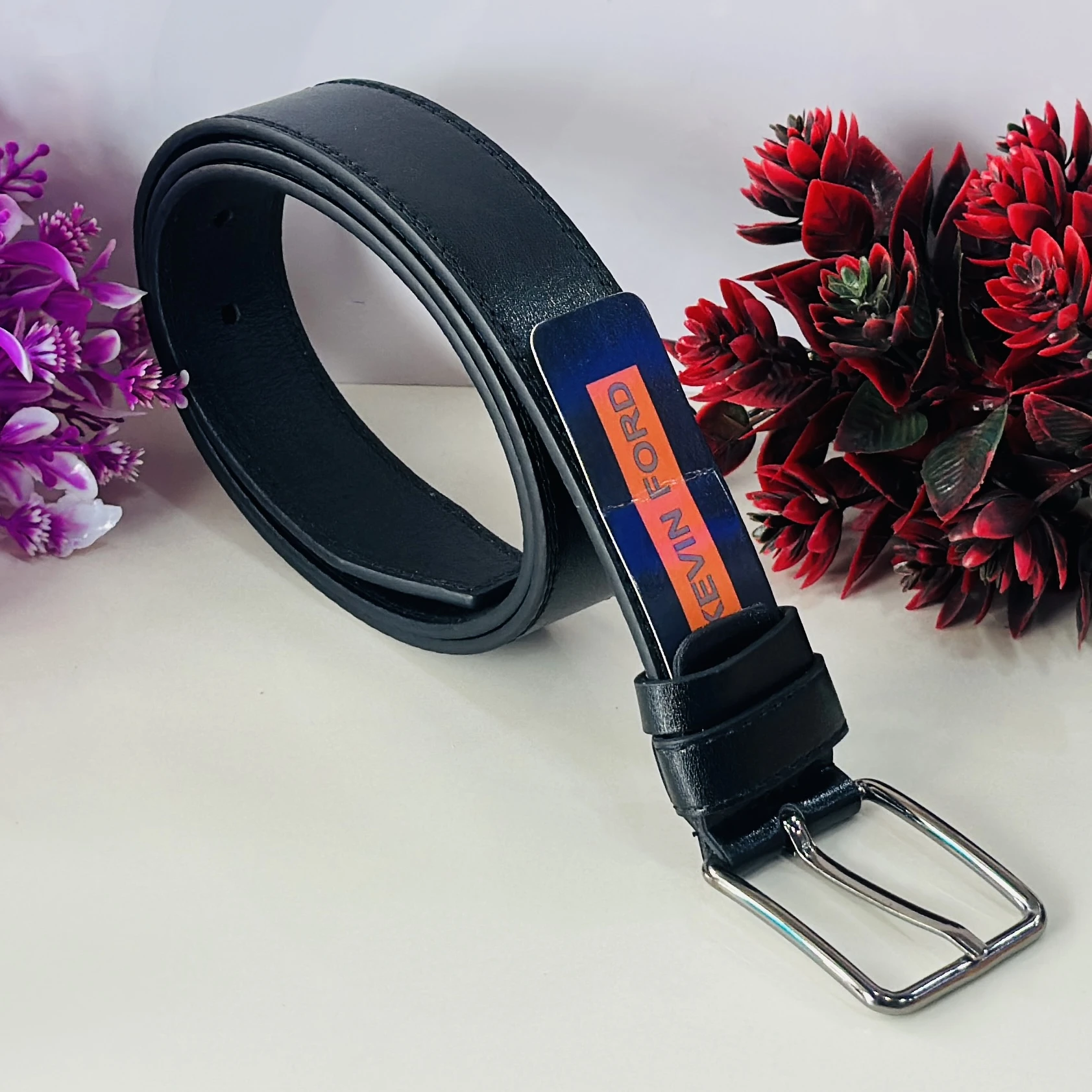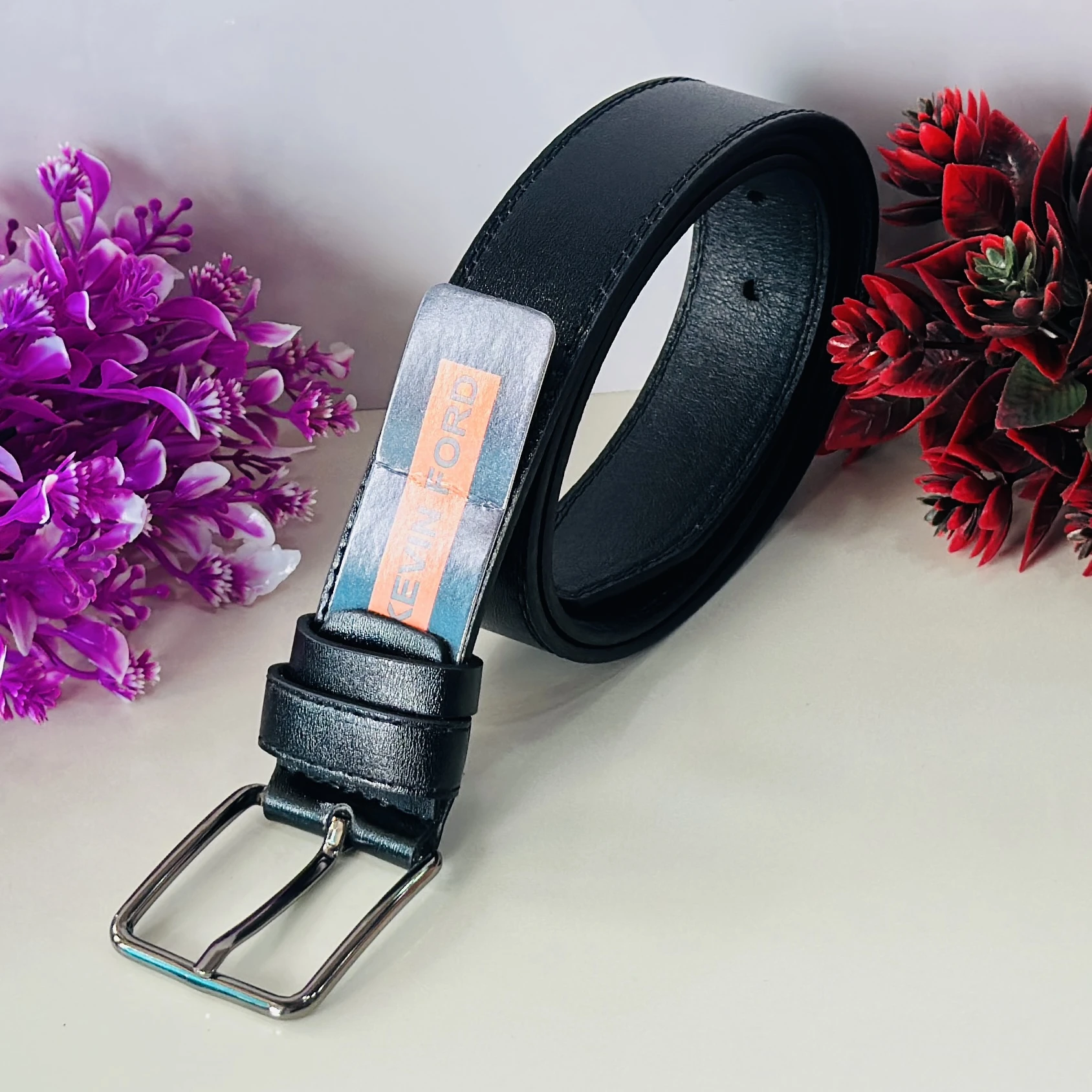 👉 Theme :- Black belt with a silver-tone buckle and a "KEVIN FORD" label.
