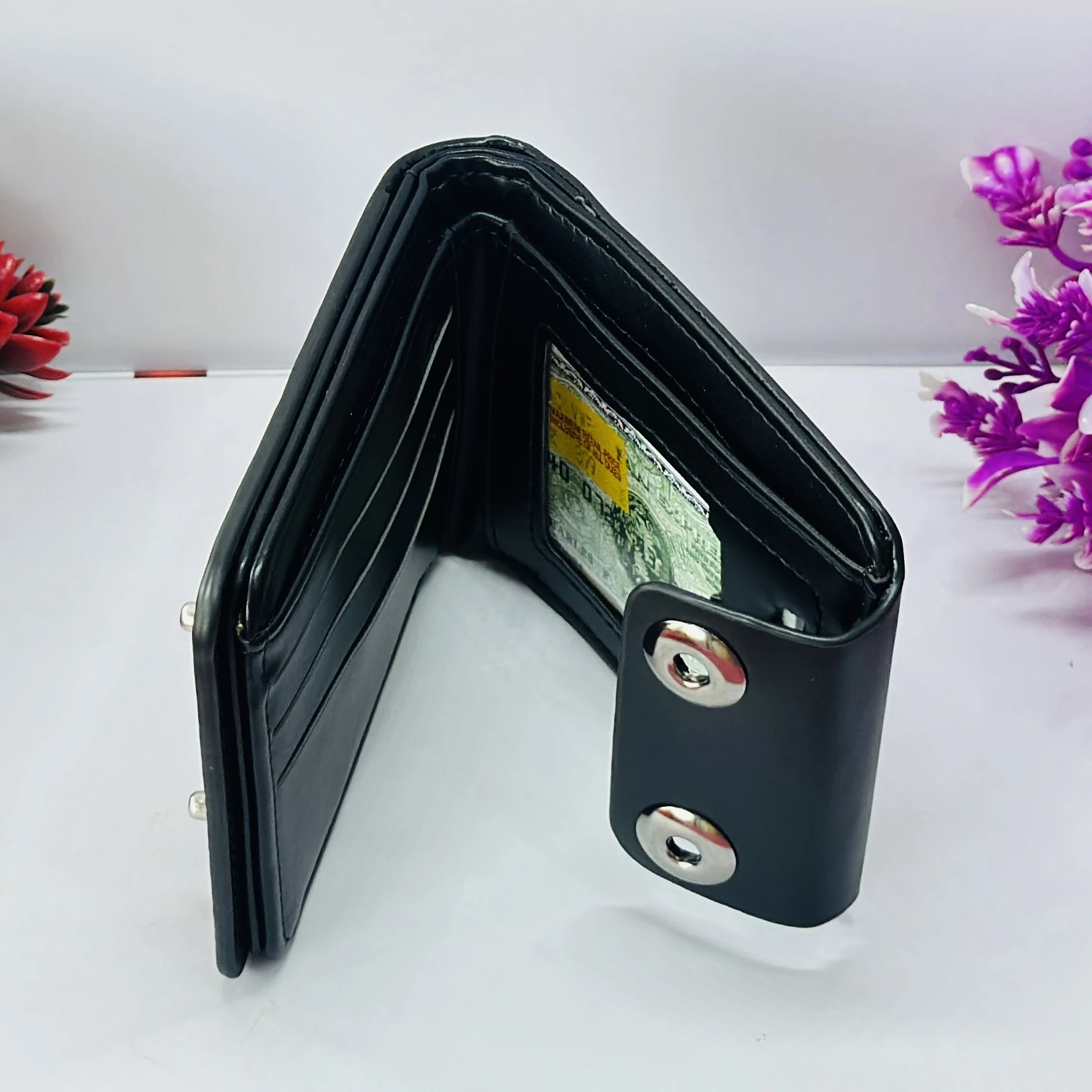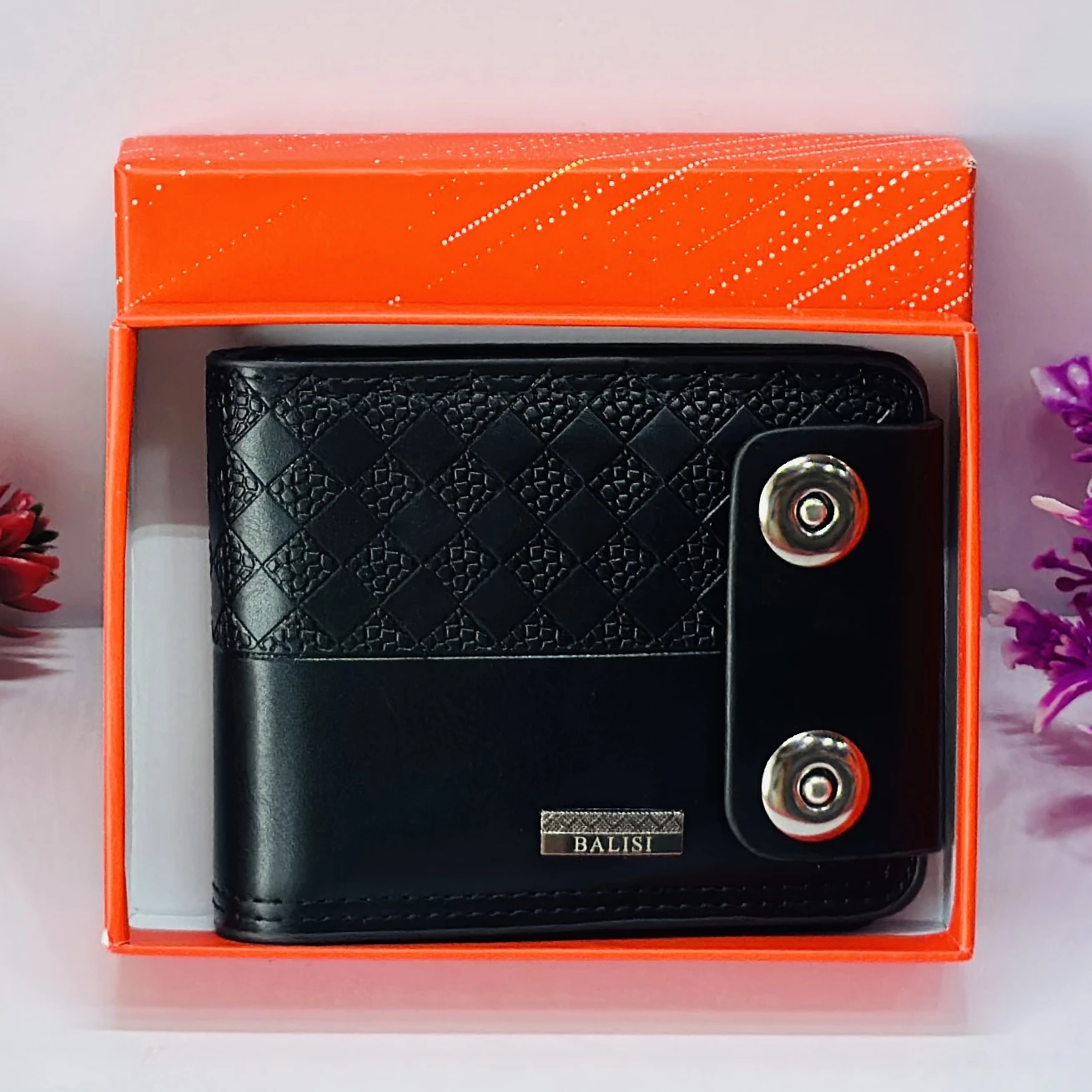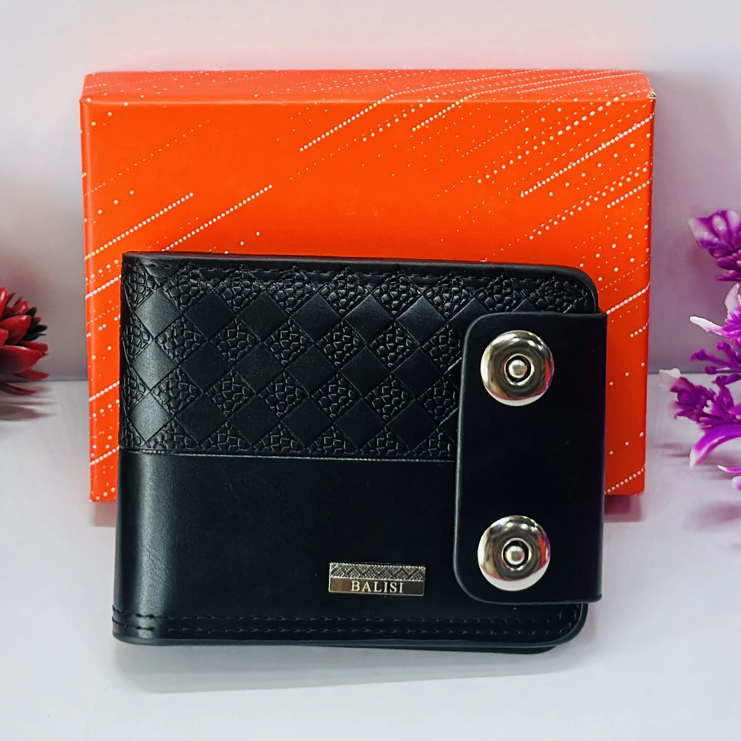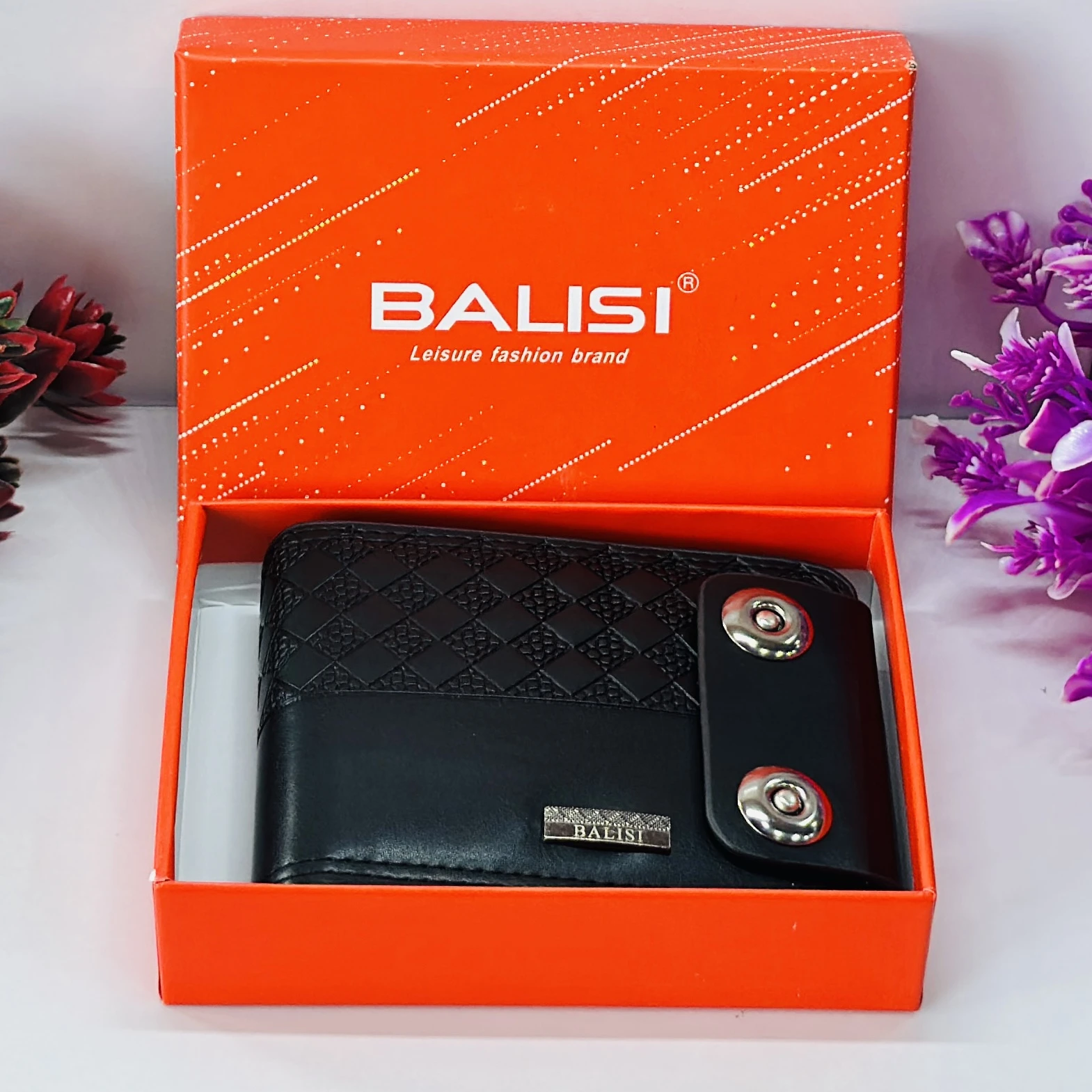 👉 Theme :- Black bi-fold men's wallet with a snap closure, branded as "Balisi".