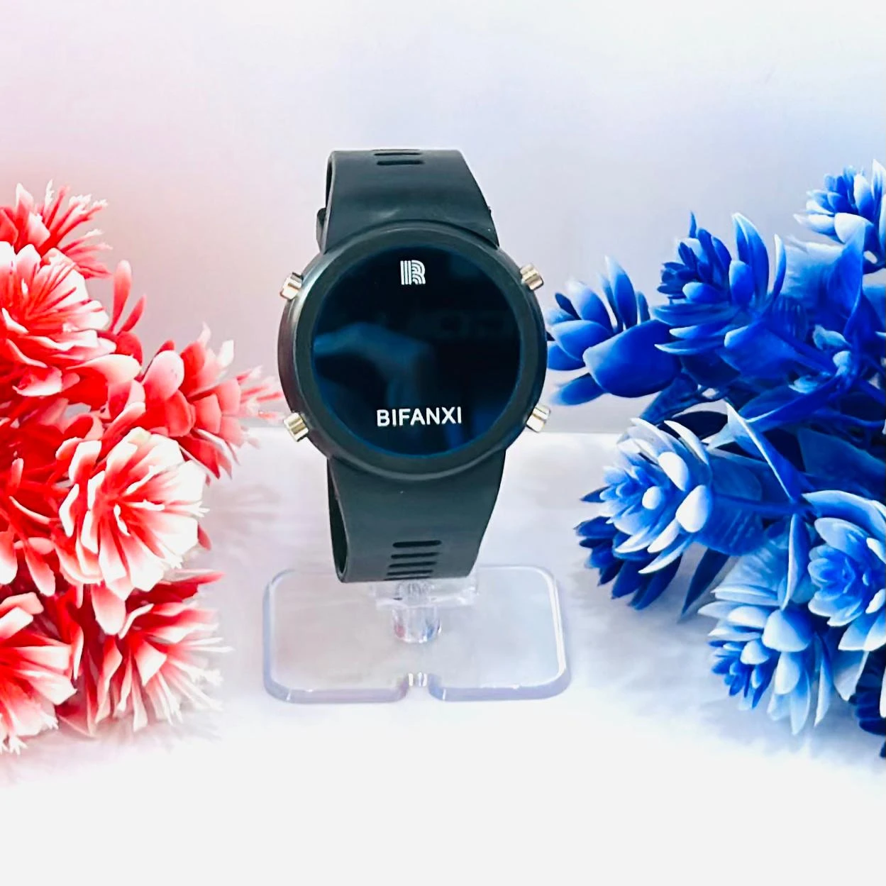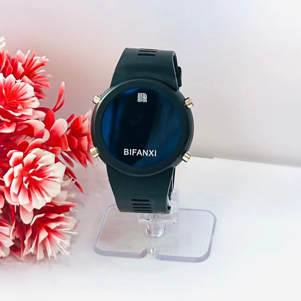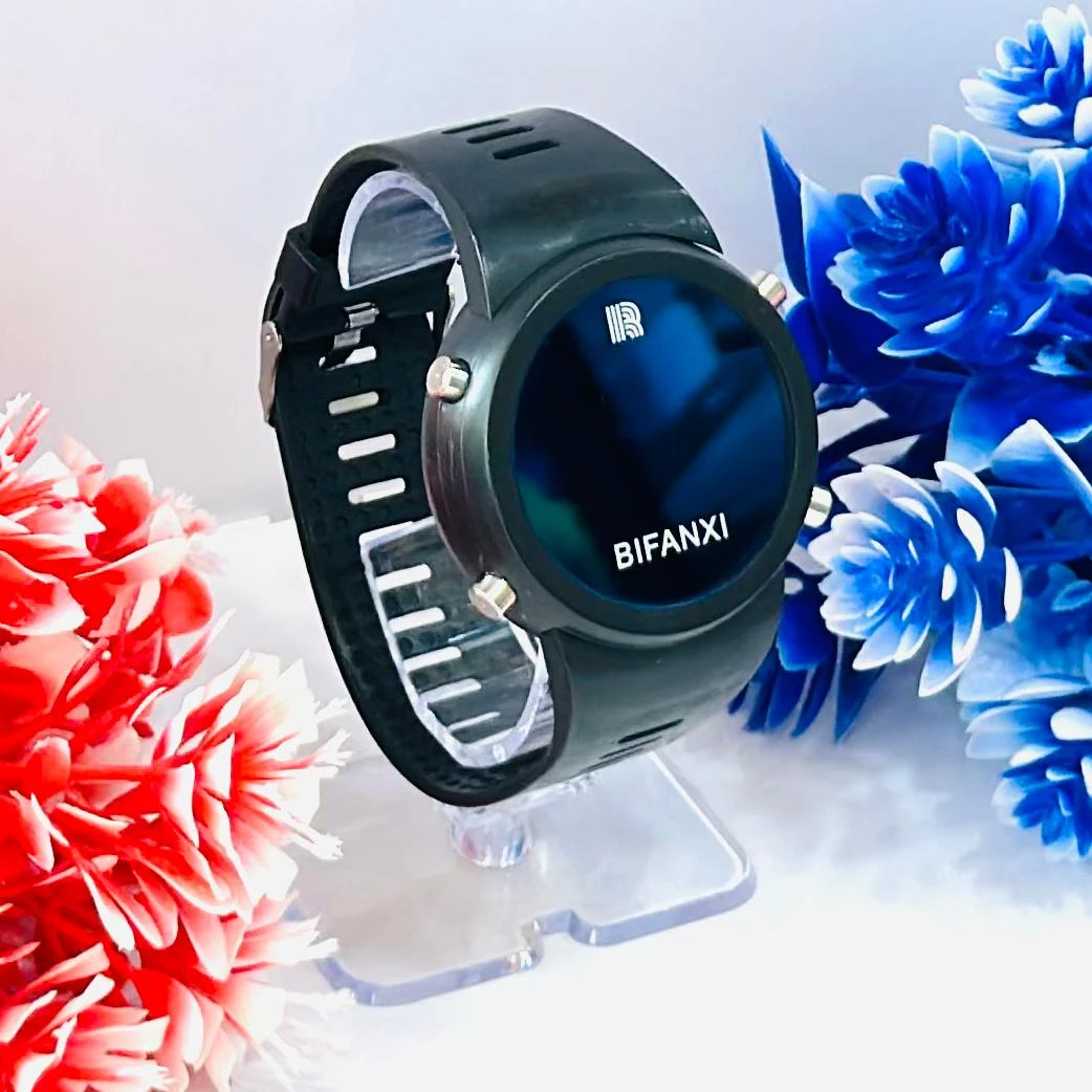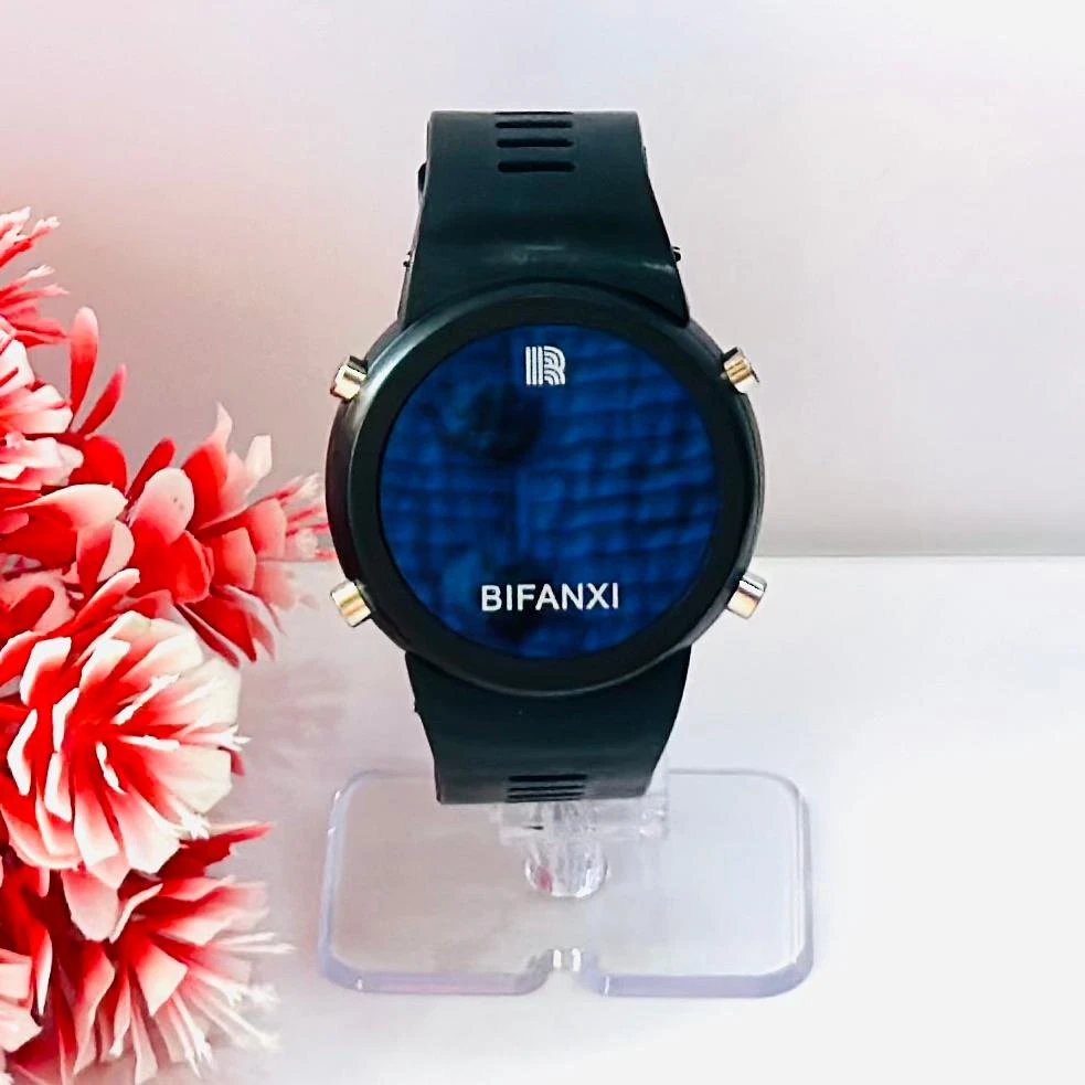 👉 Theme :- black BIFANXI digital sports watch with a round dial and a black silicone or TPU strap.
