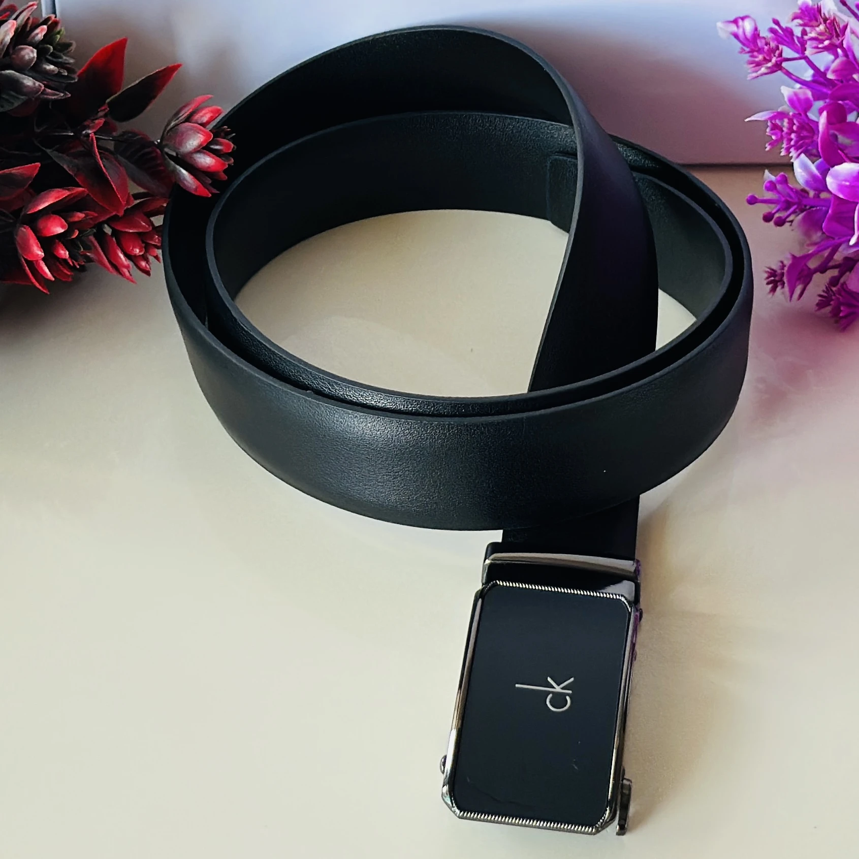 black Calvin Klein leather belt with a metal plaque buckle.