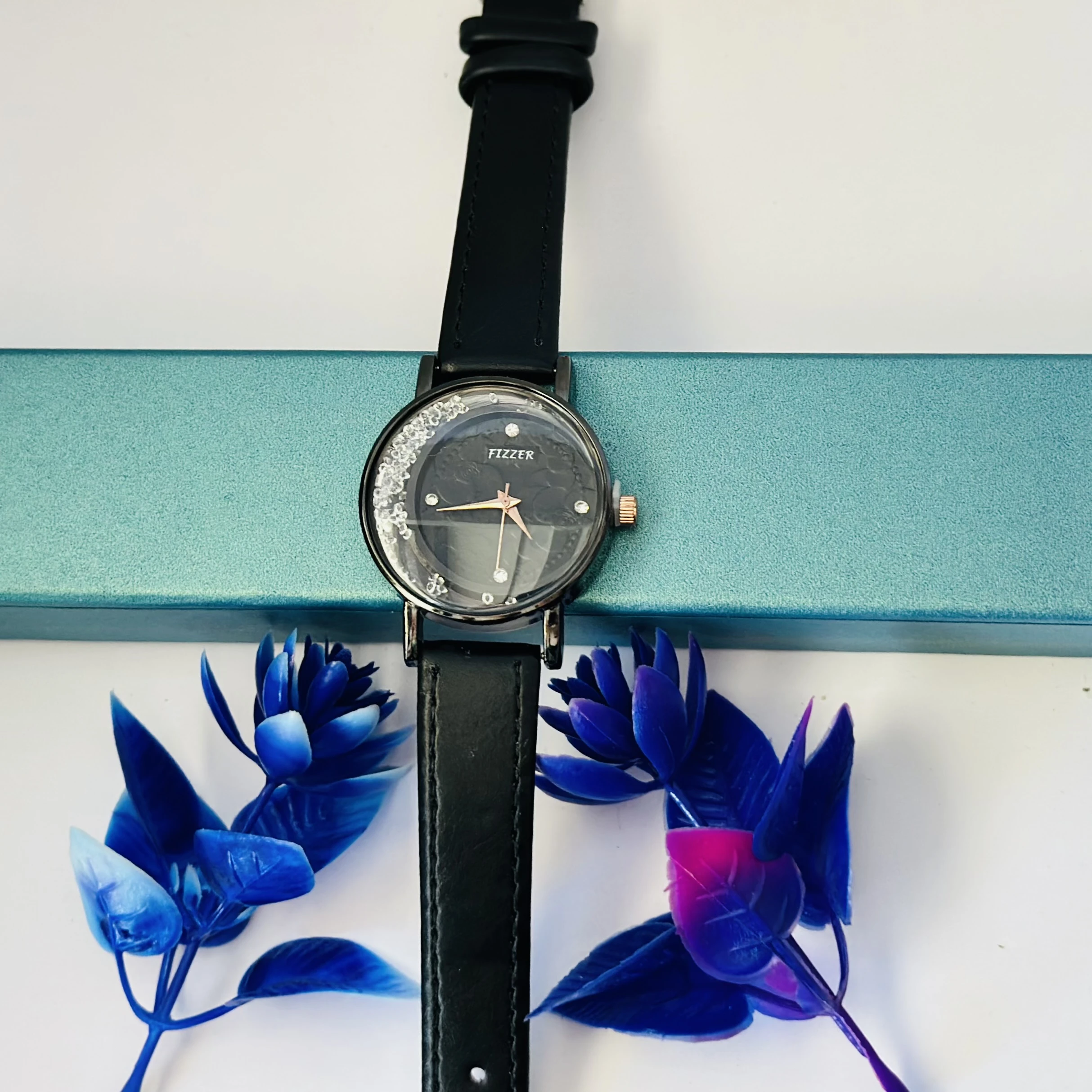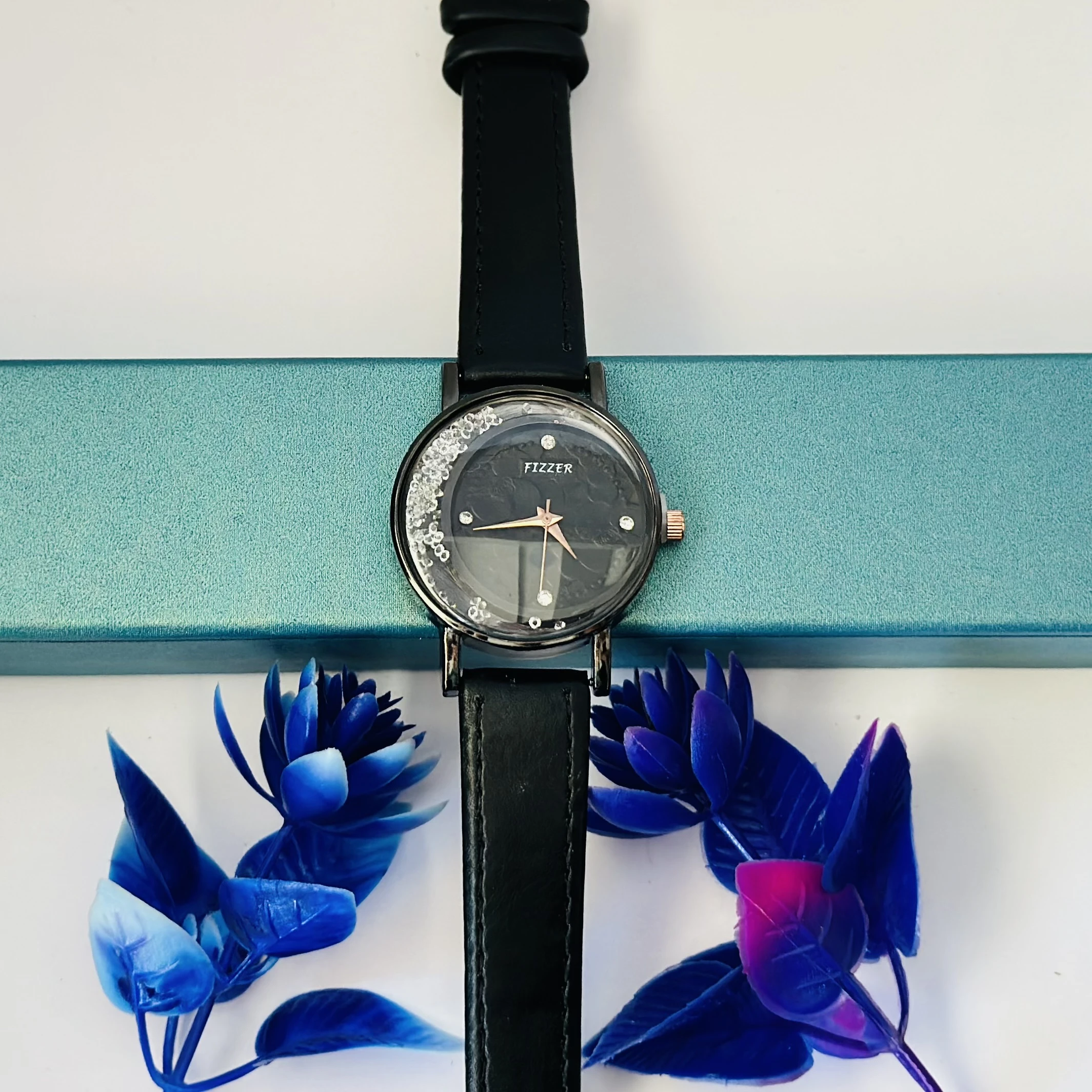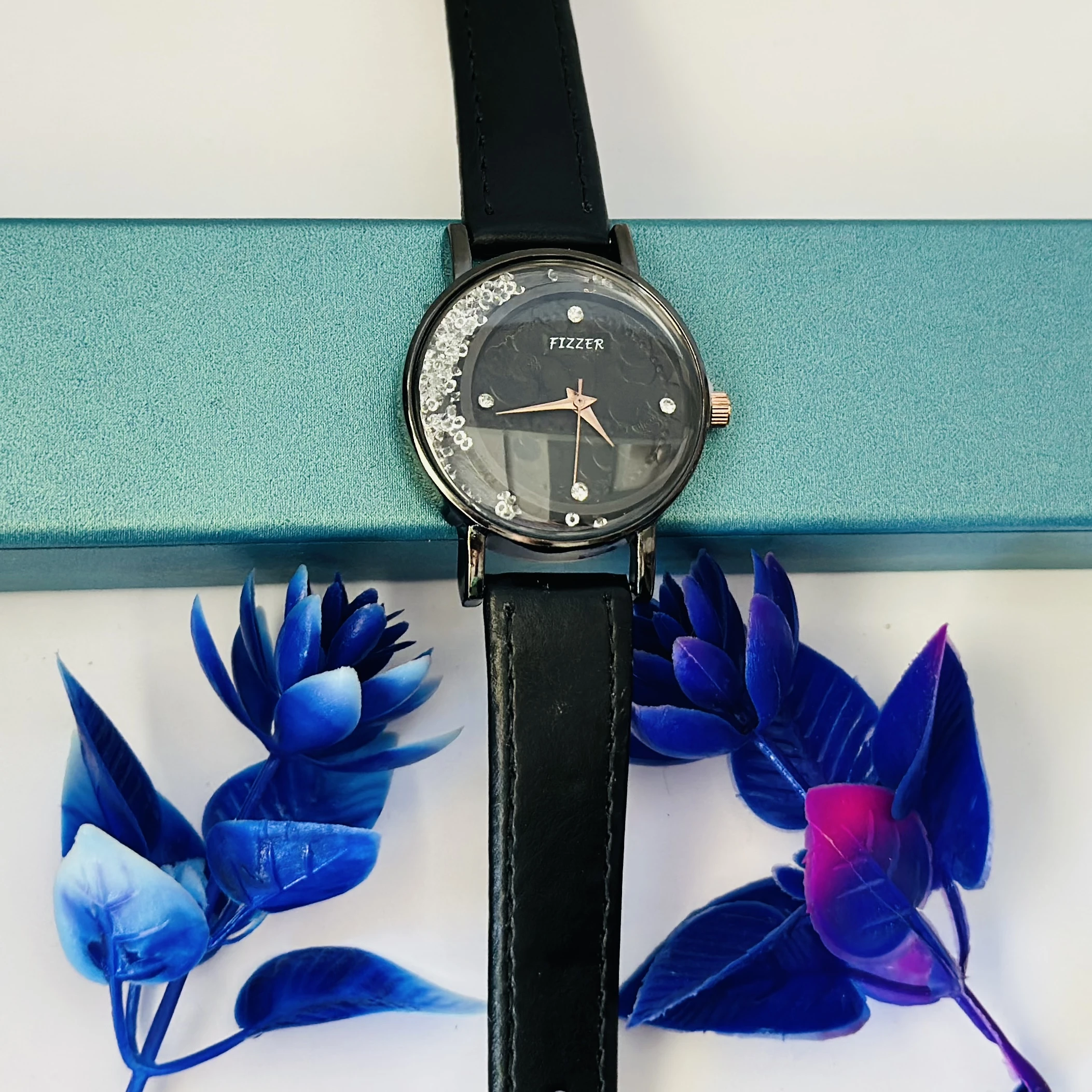 👉 Theme :- Black Fizer analog watch with a leather strap and a crystal-accented dial.