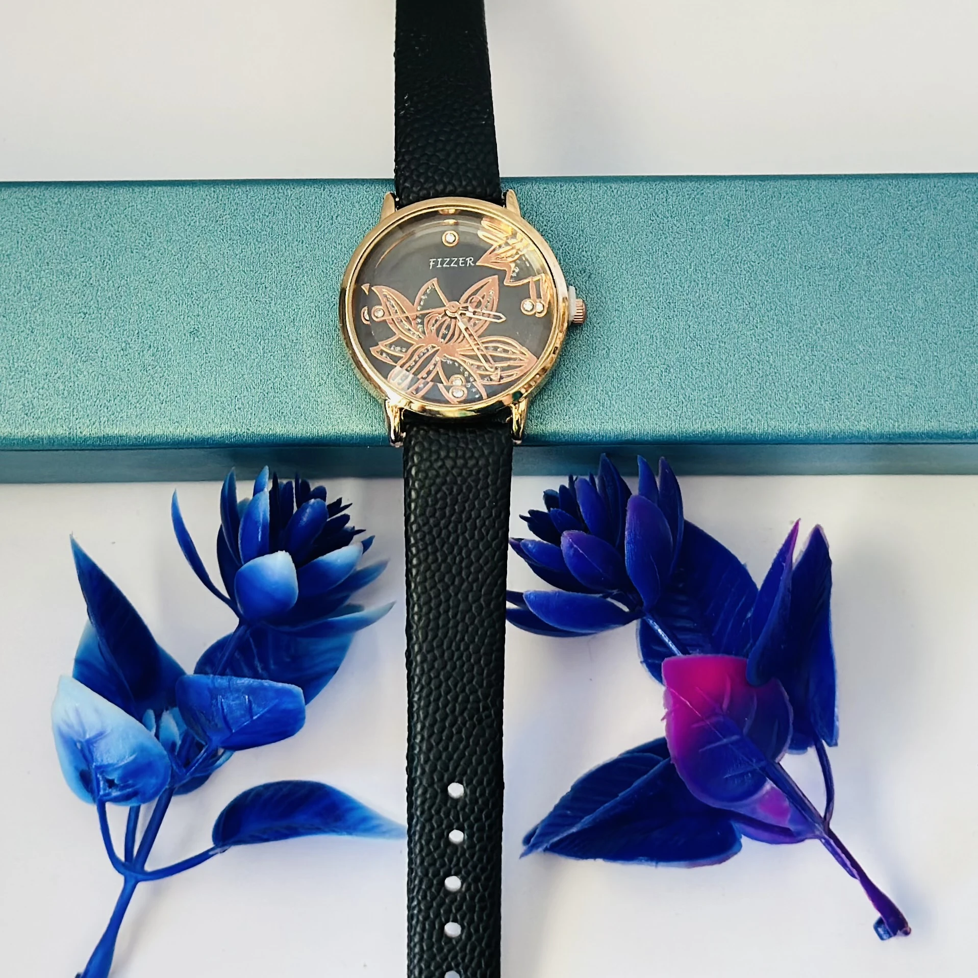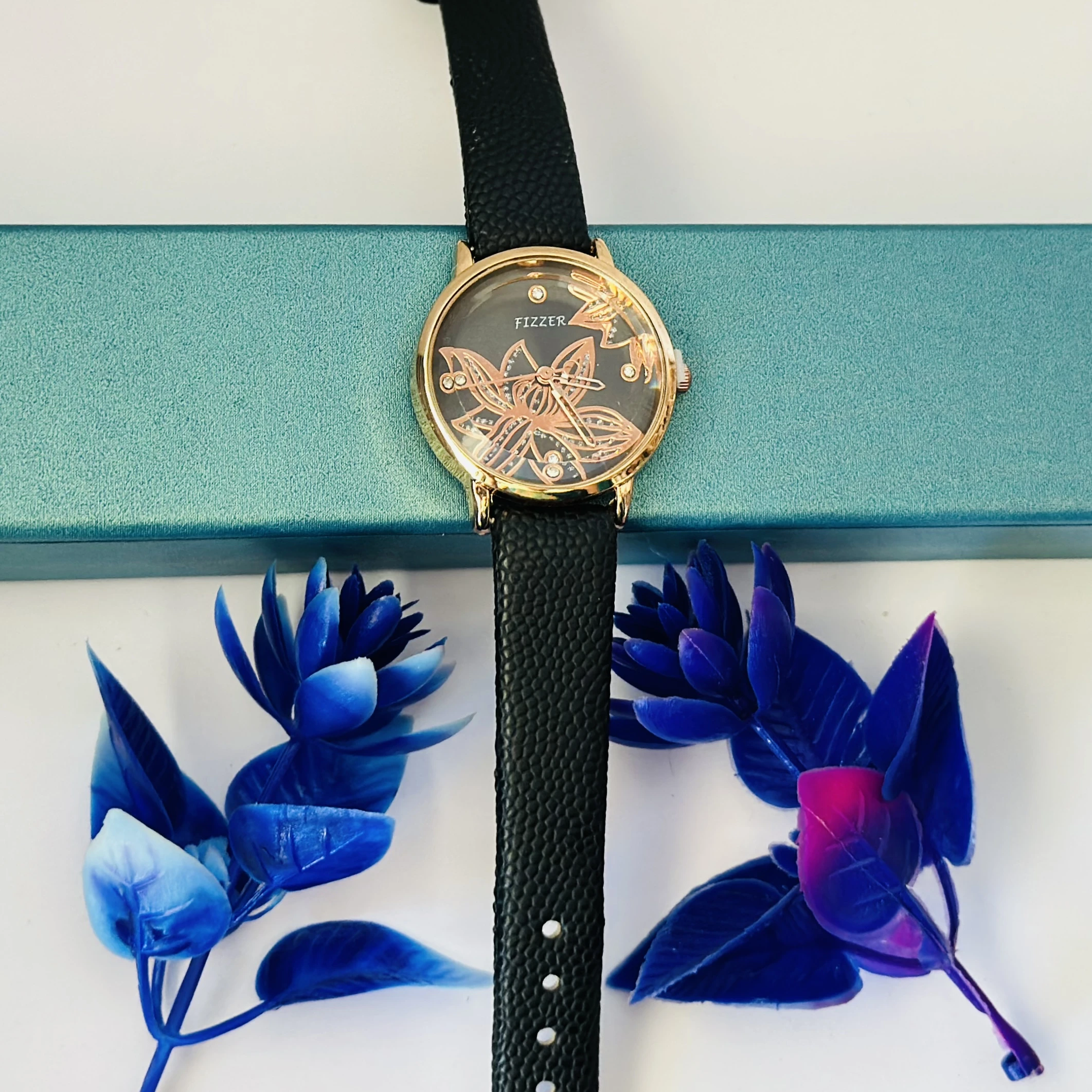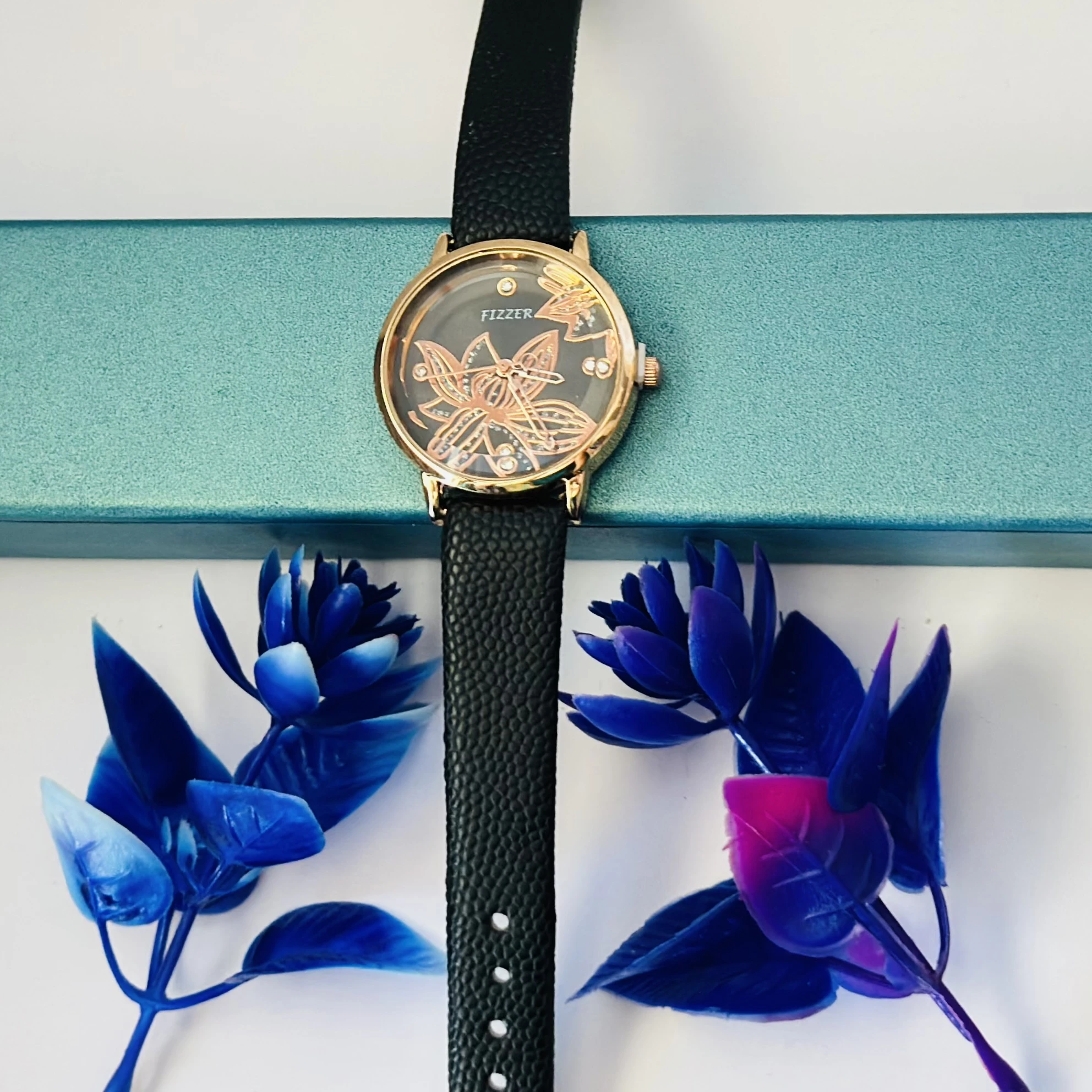 👉 Theme :- Black Fizer analog watch with a leather strap and a crystal-accented dial.
