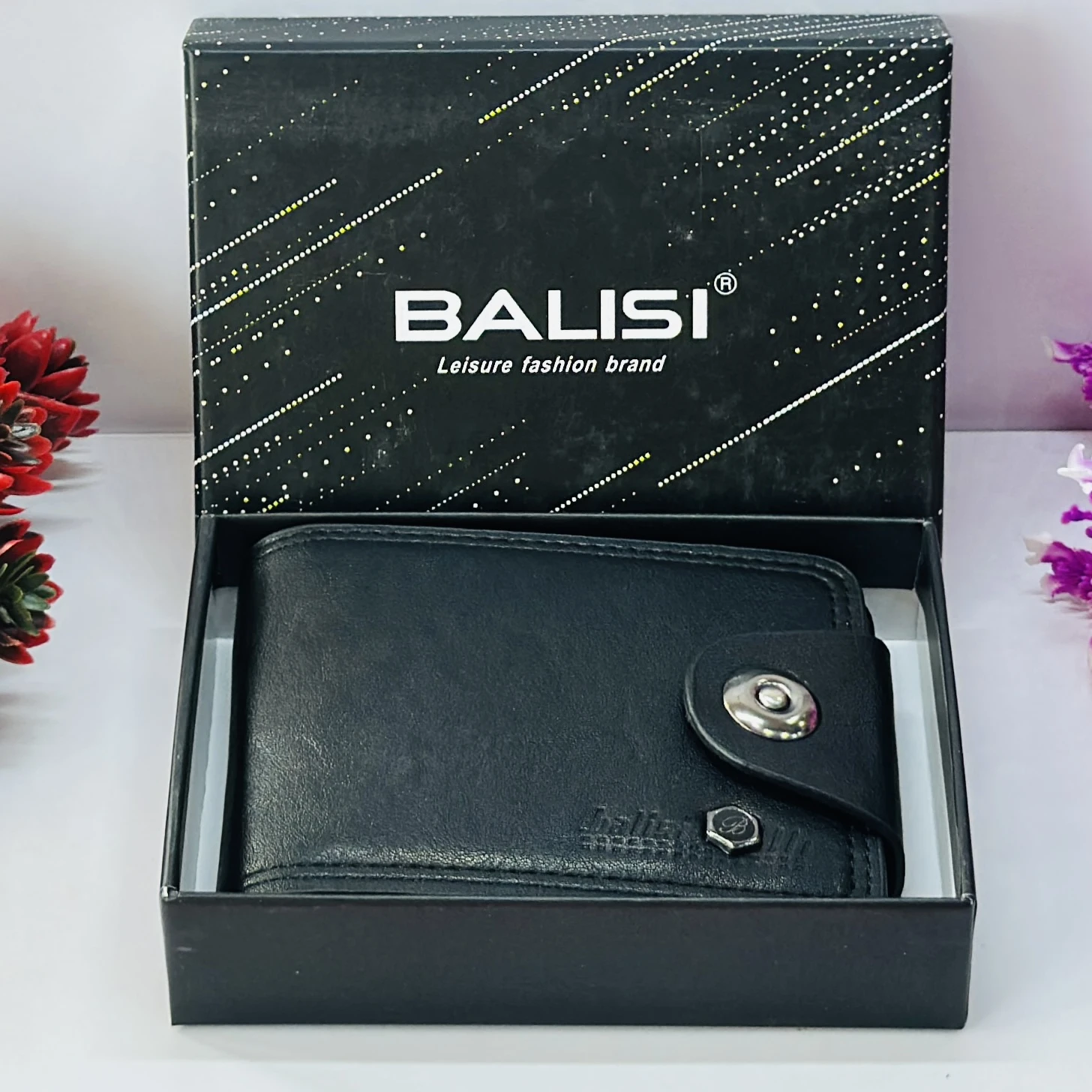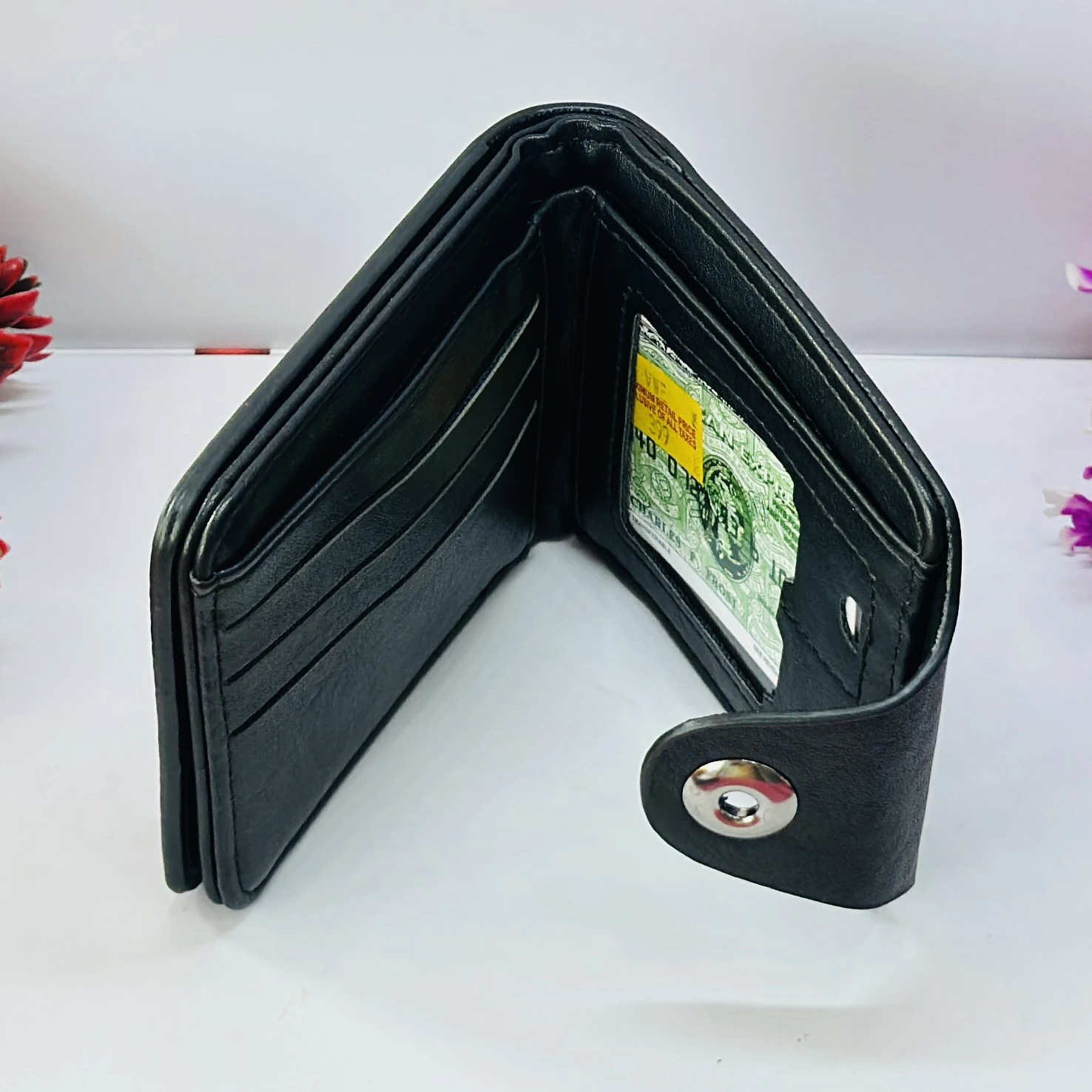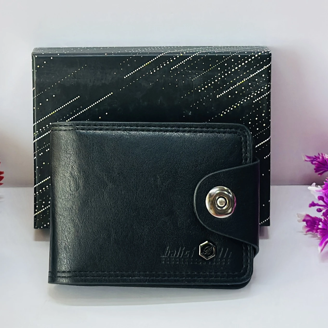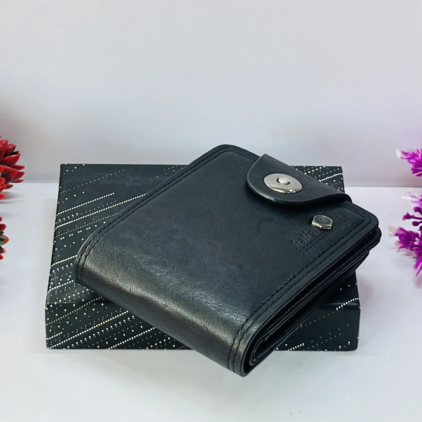 👉 Theme :- Black leather bi-fold wallet with a button closure.