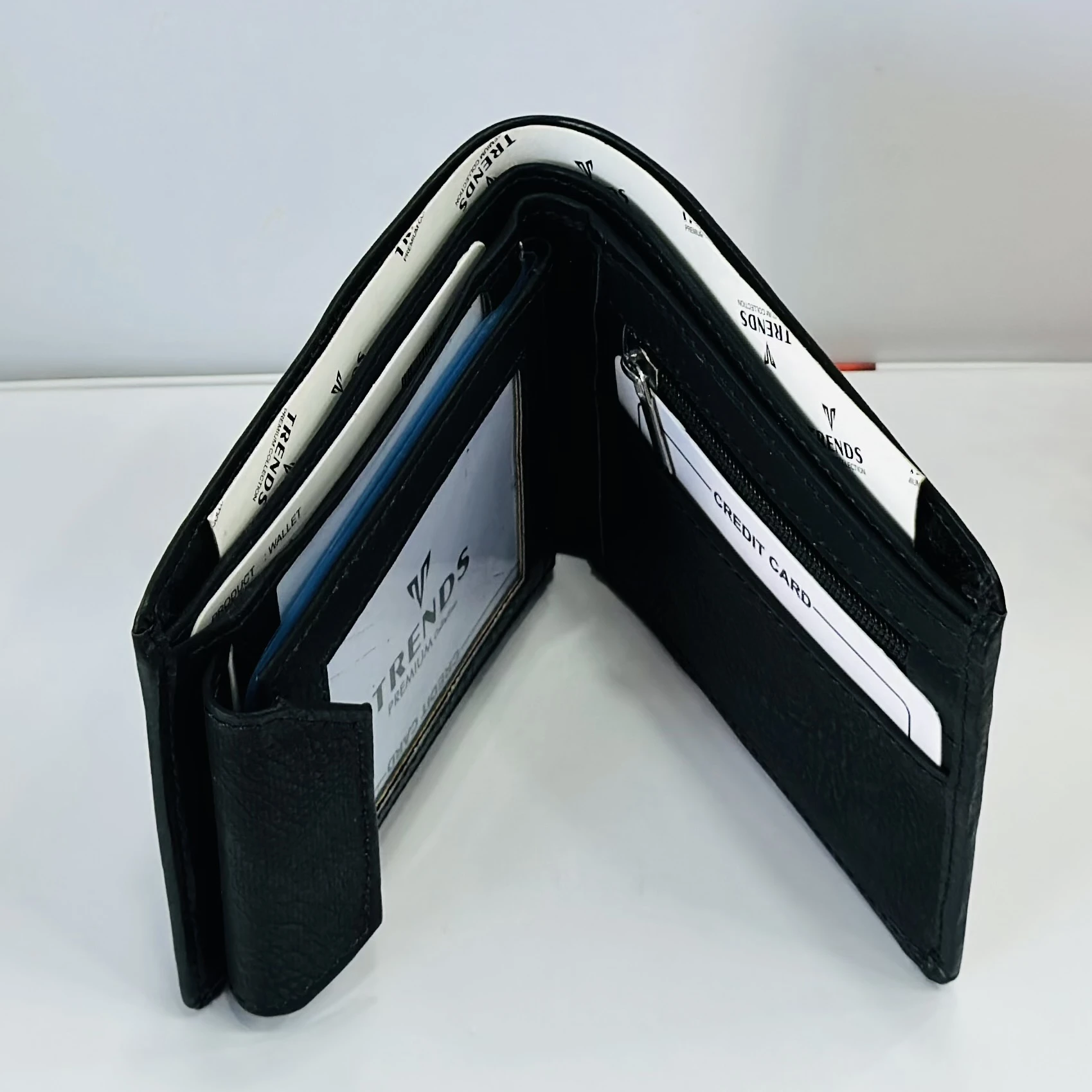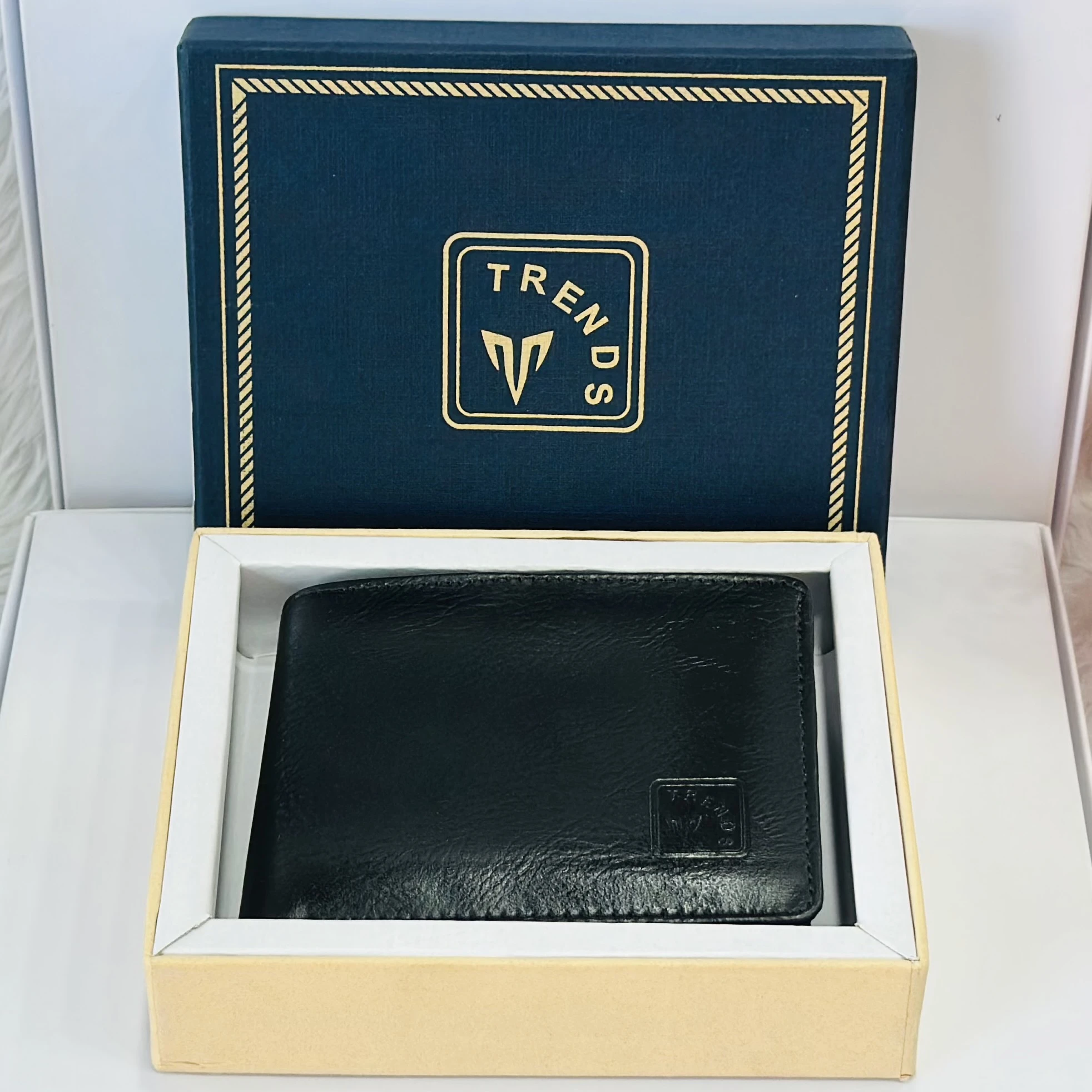 👉 Theme :- Black leather bifold wallet by the brand Trends.