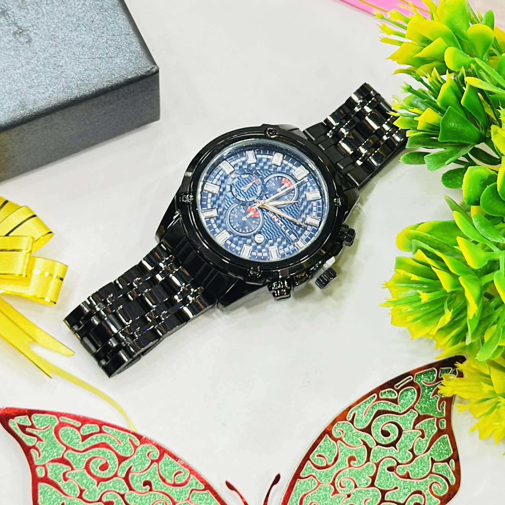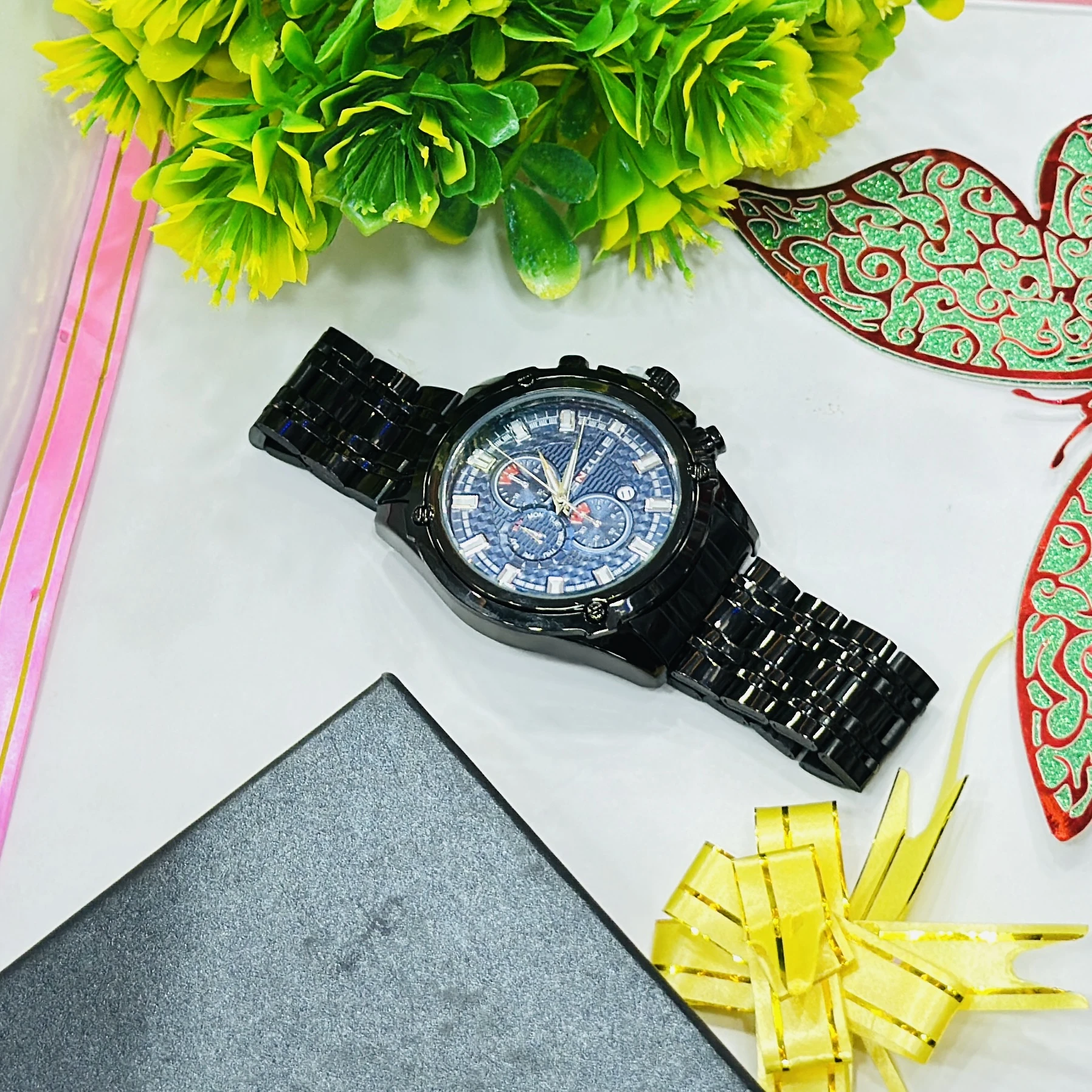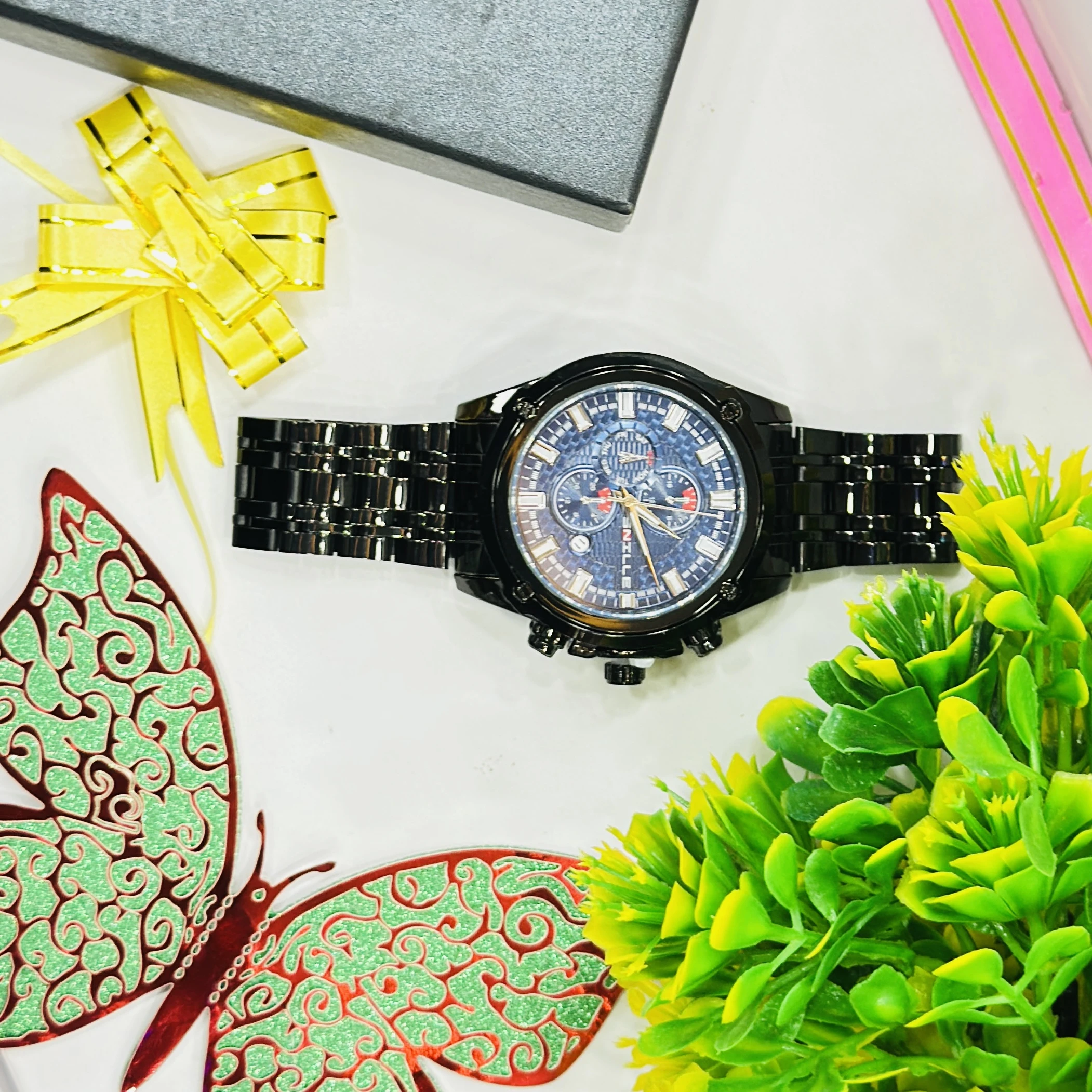 Black metal analog chronograph wristwatch