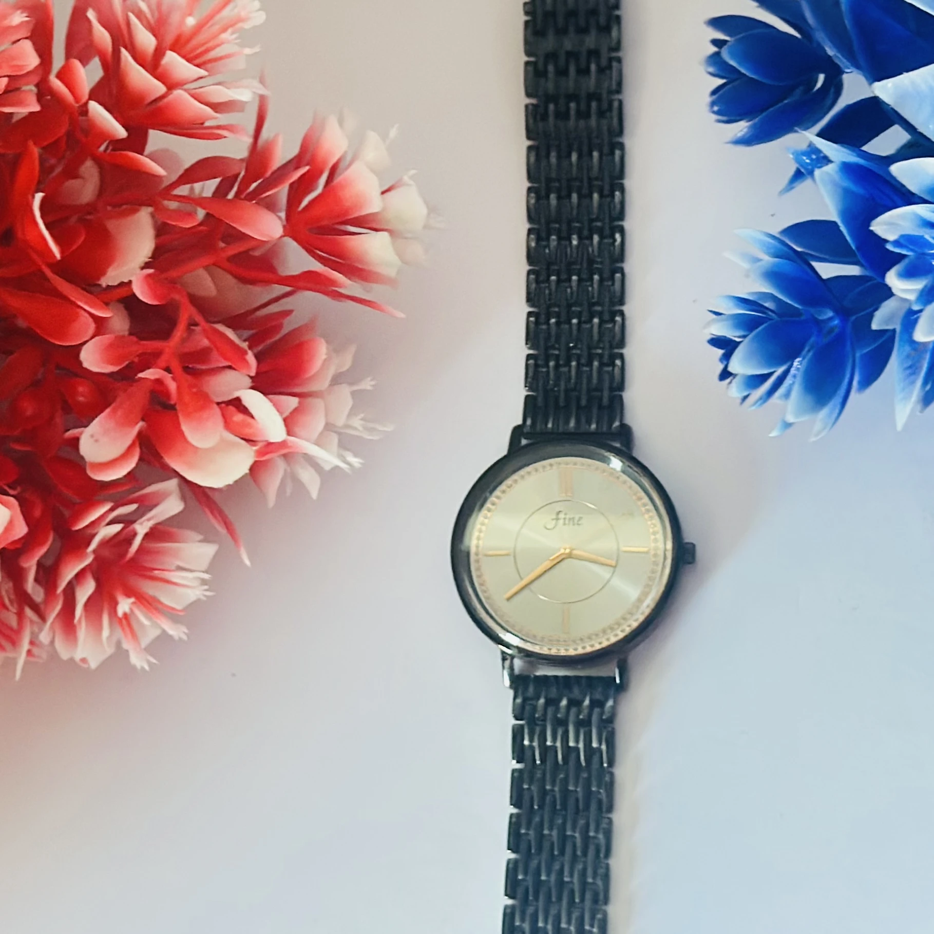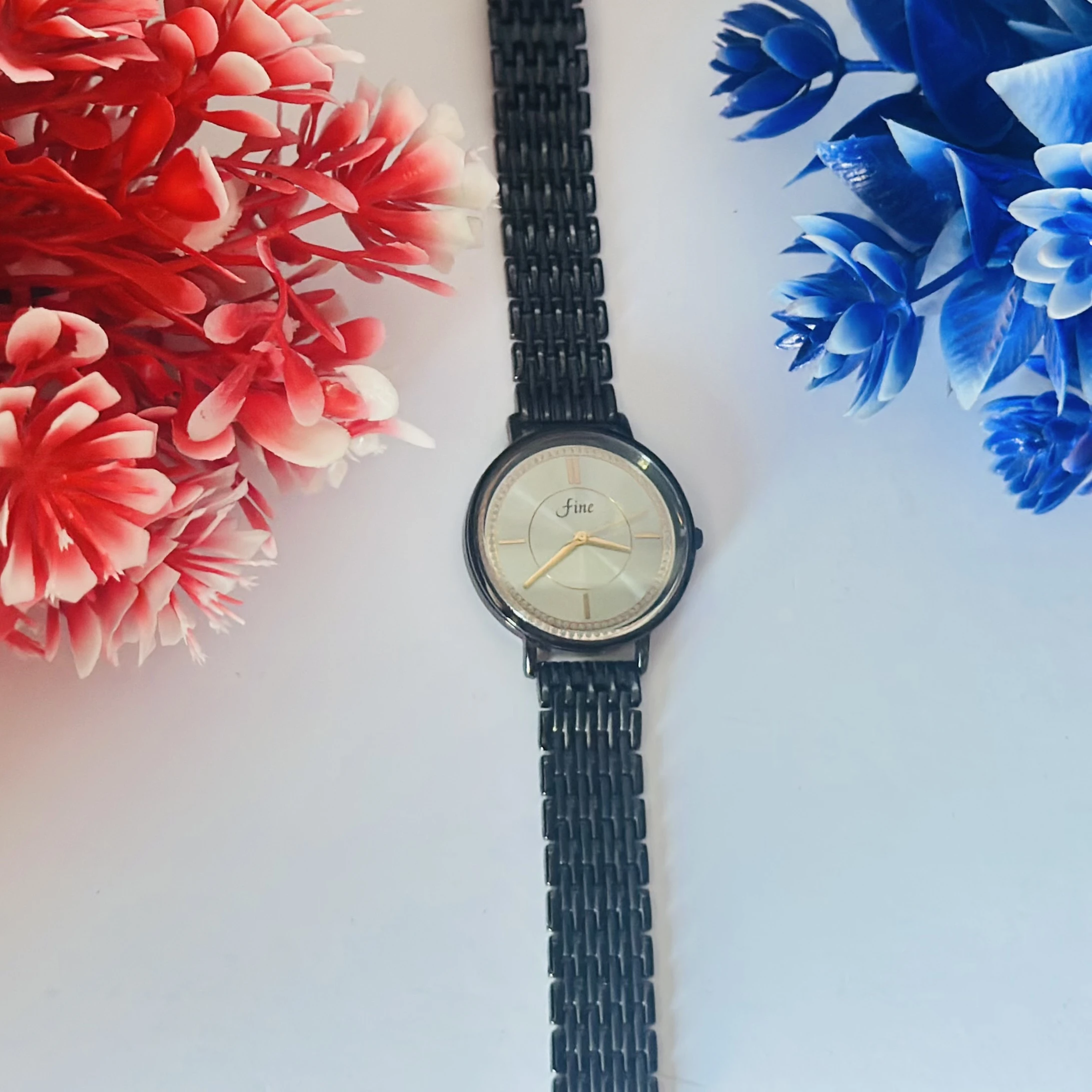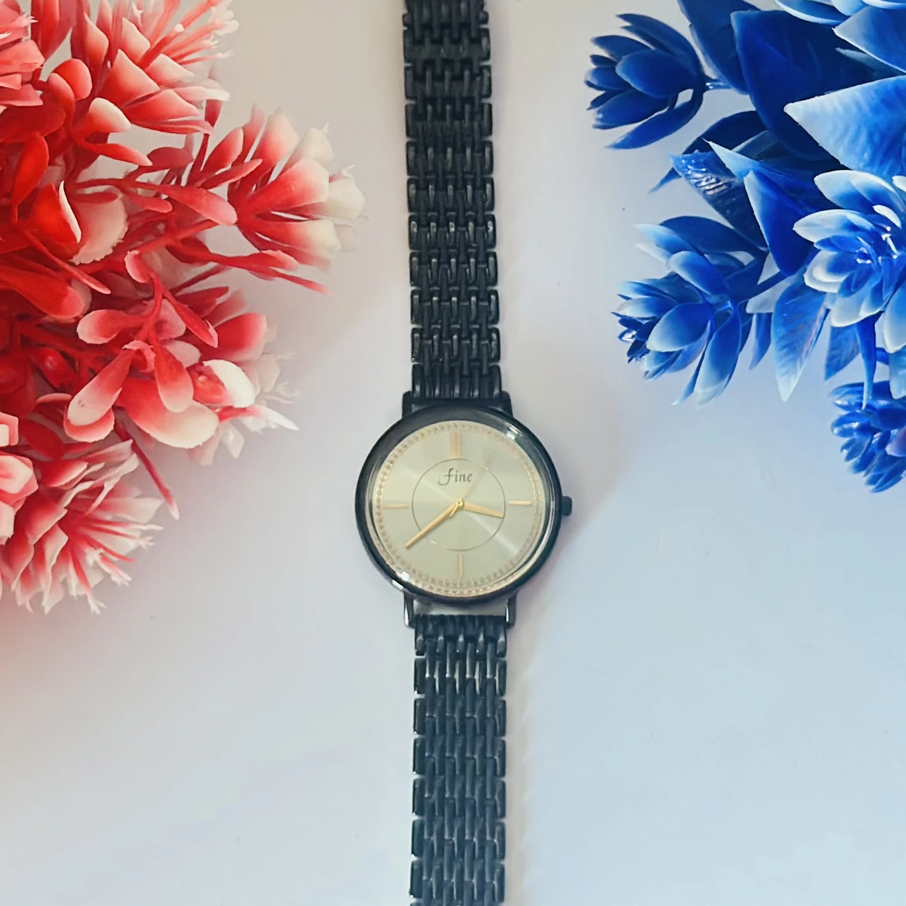 👉 Theme :- Black metal analogue women's watch with a silver dial.