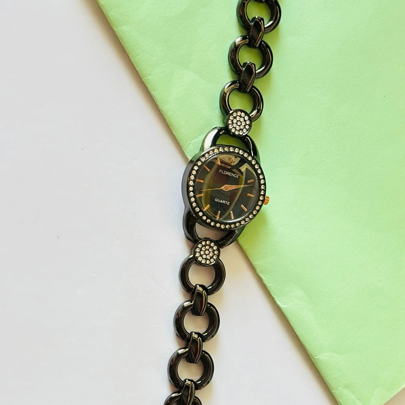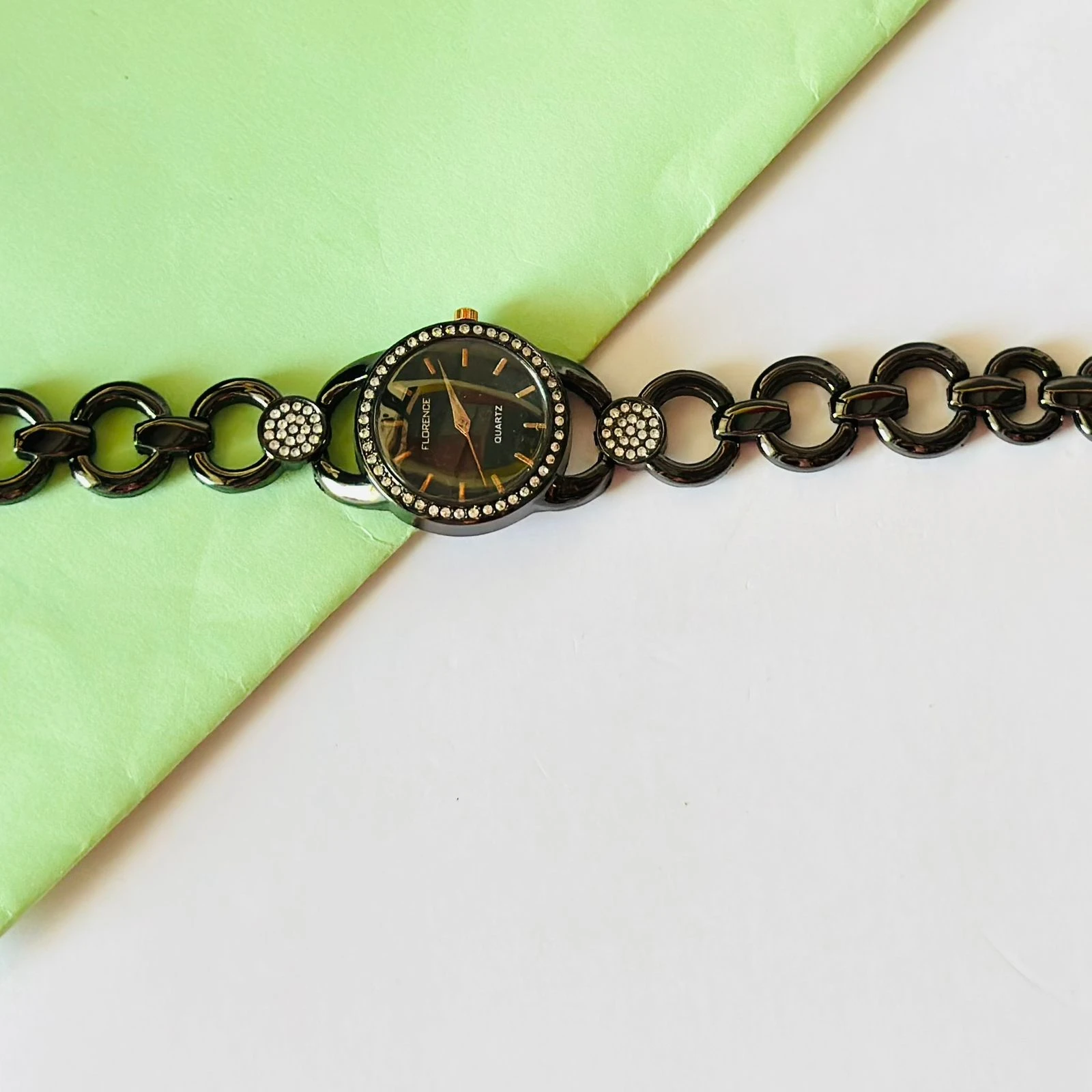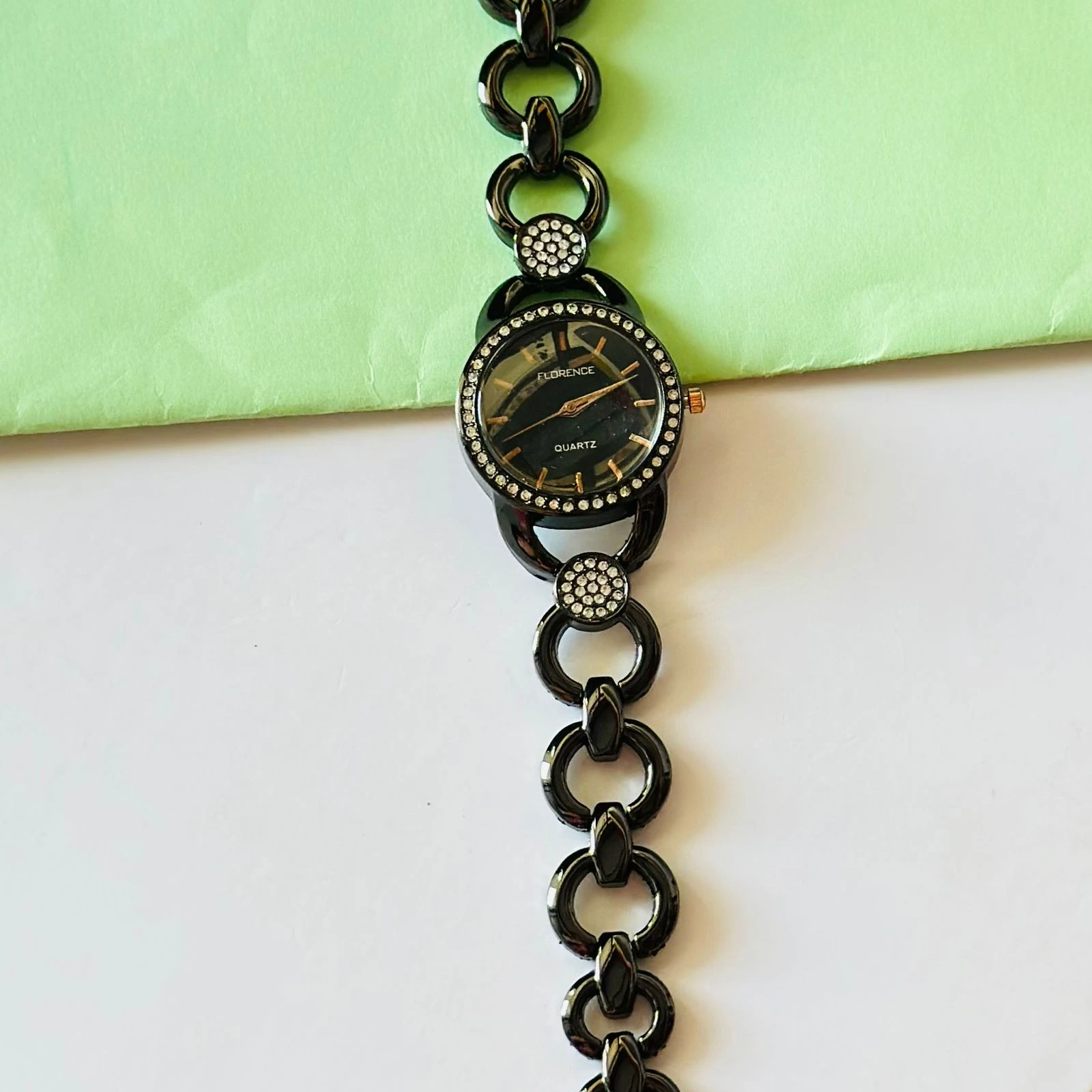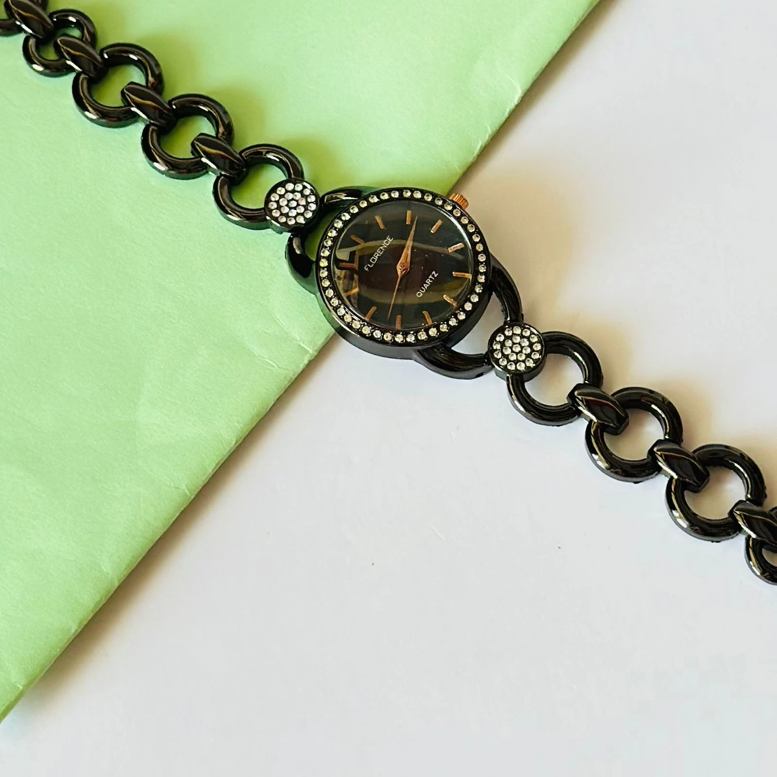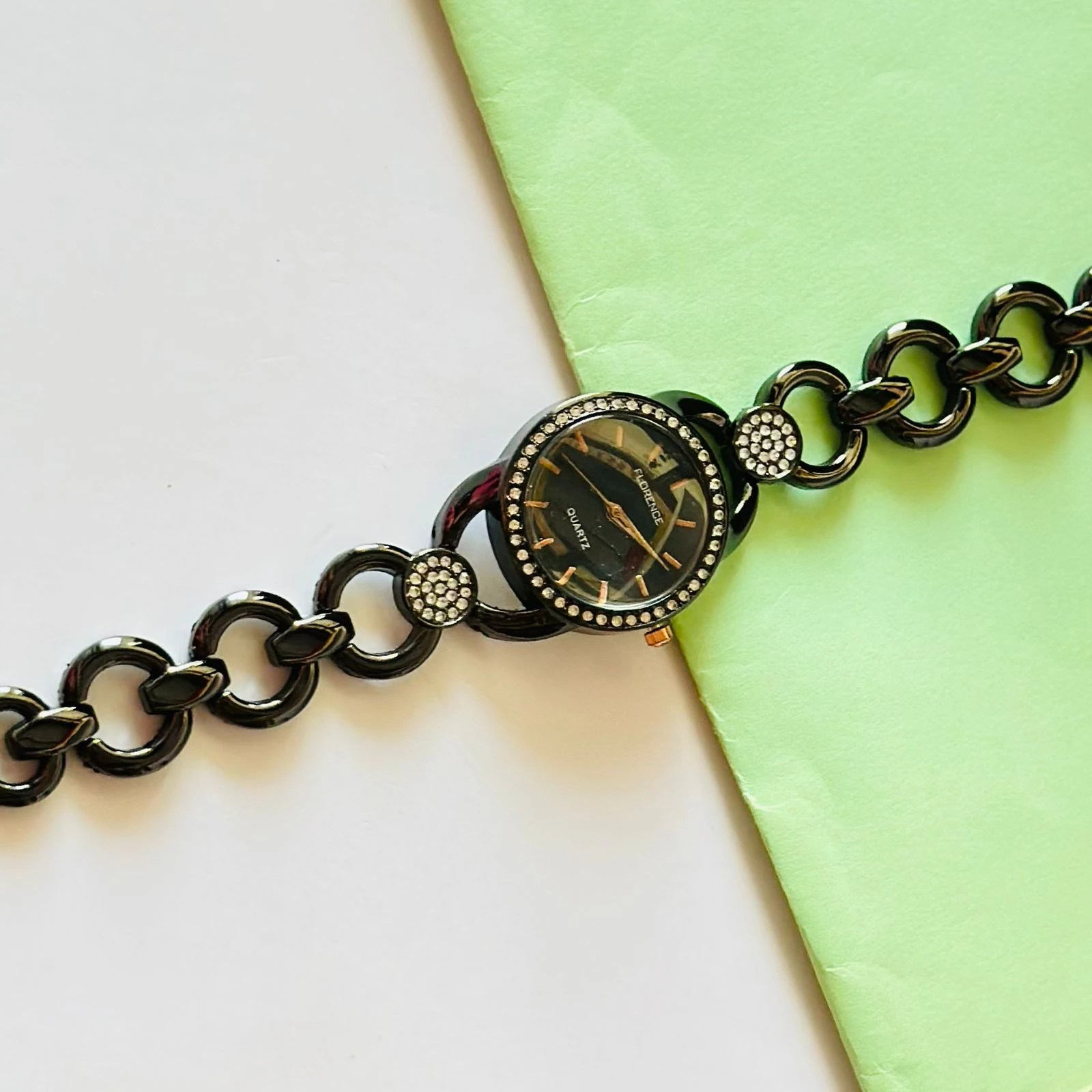 👉 Theme :- black NYC brand quartz watch with a jeweled bezel and a link-style bracelet.