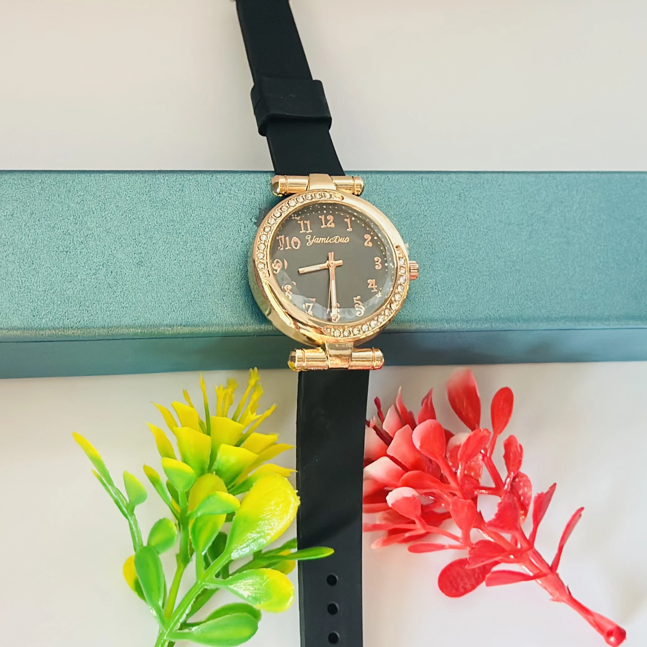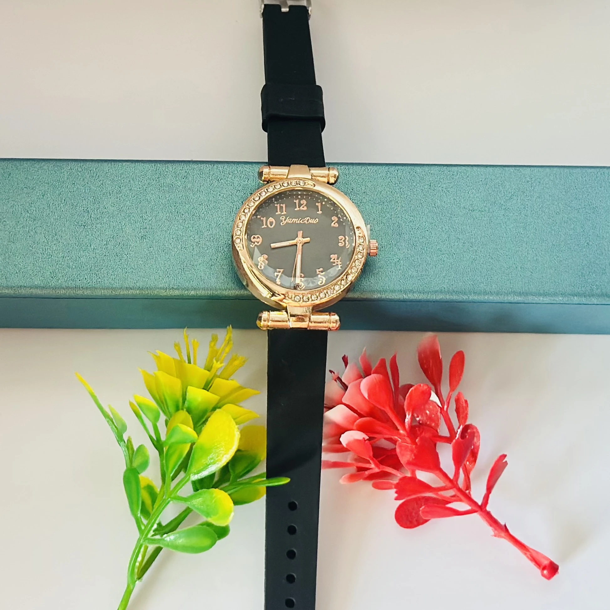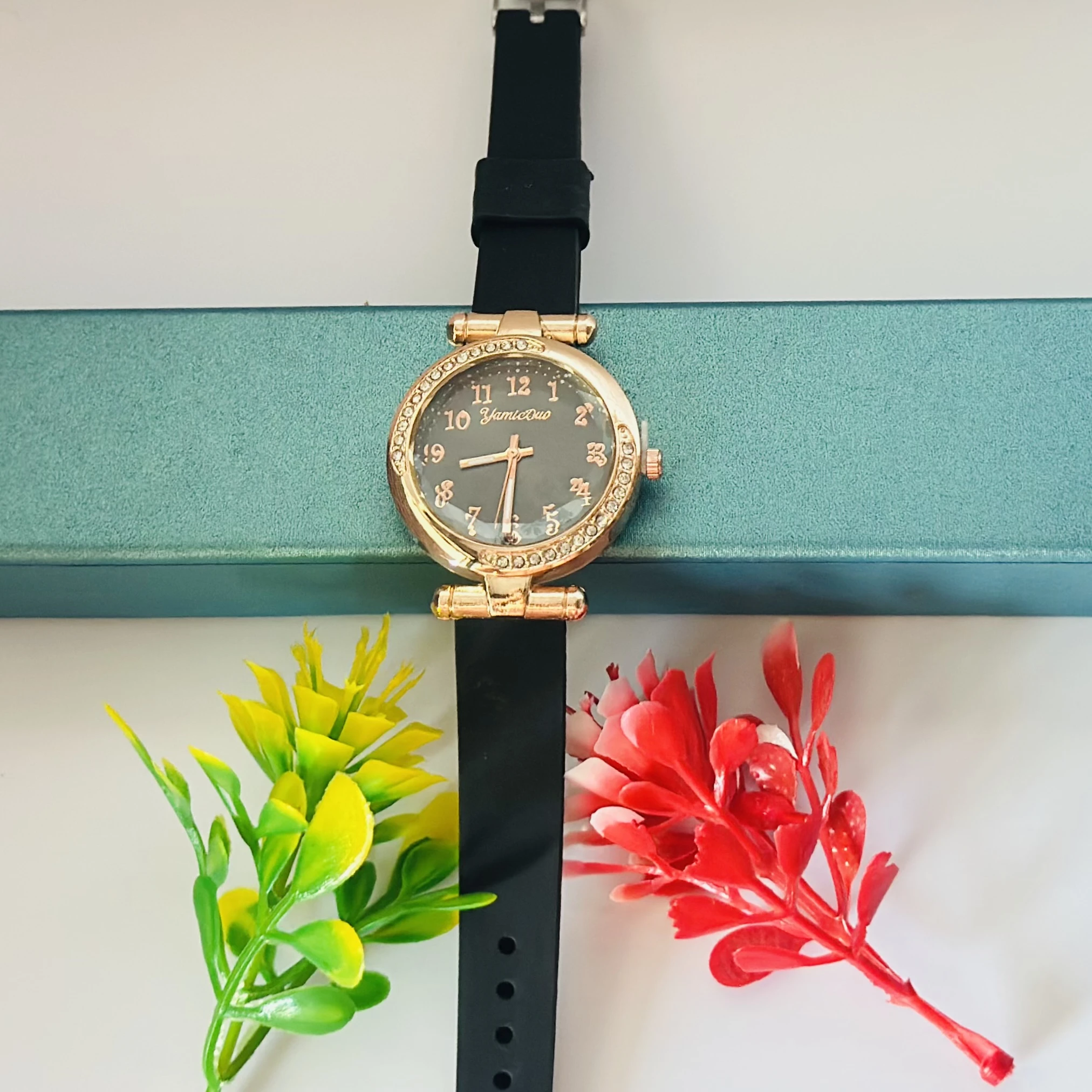 👉 Theme :- black women's analog watch with a rose gold-toned case and a black silicone