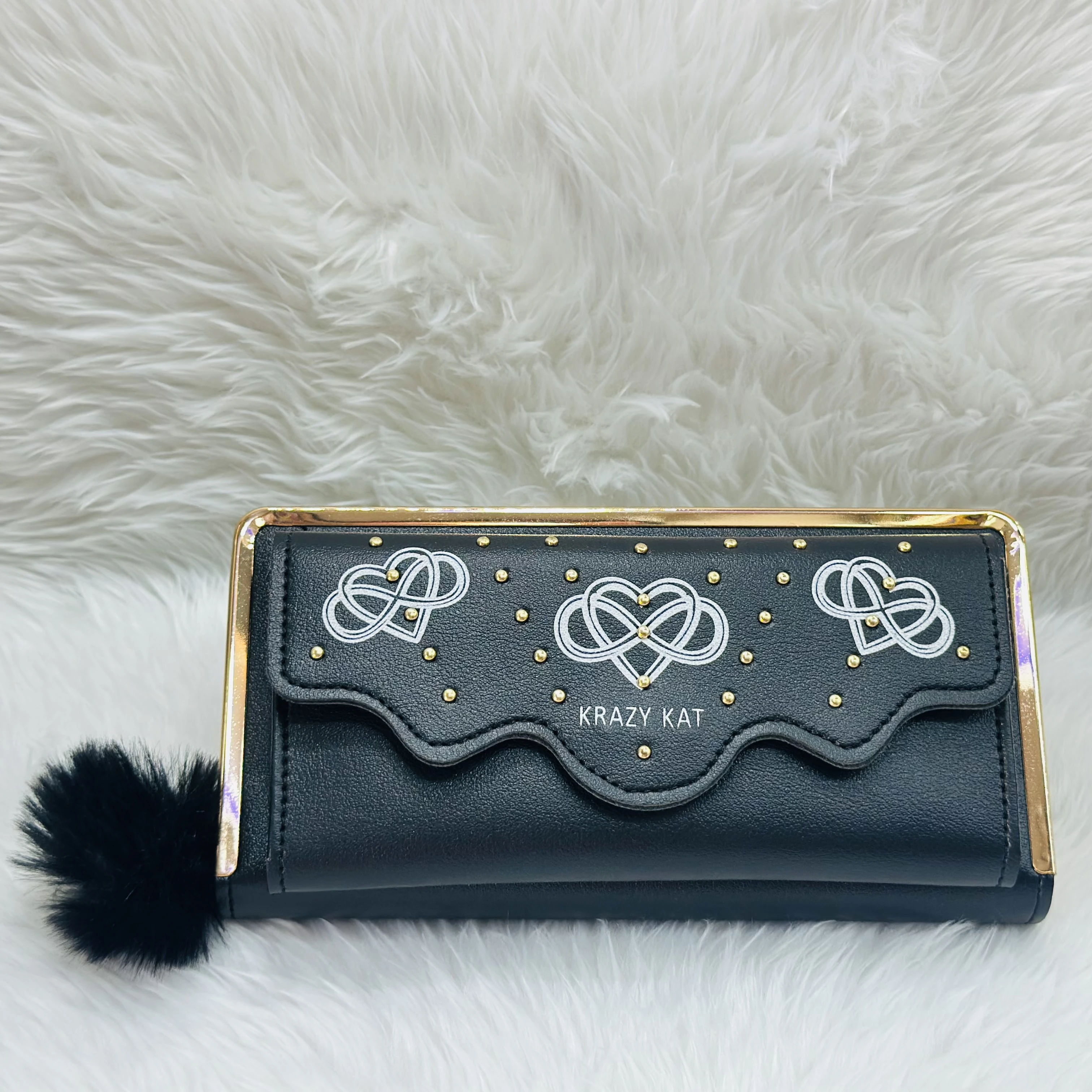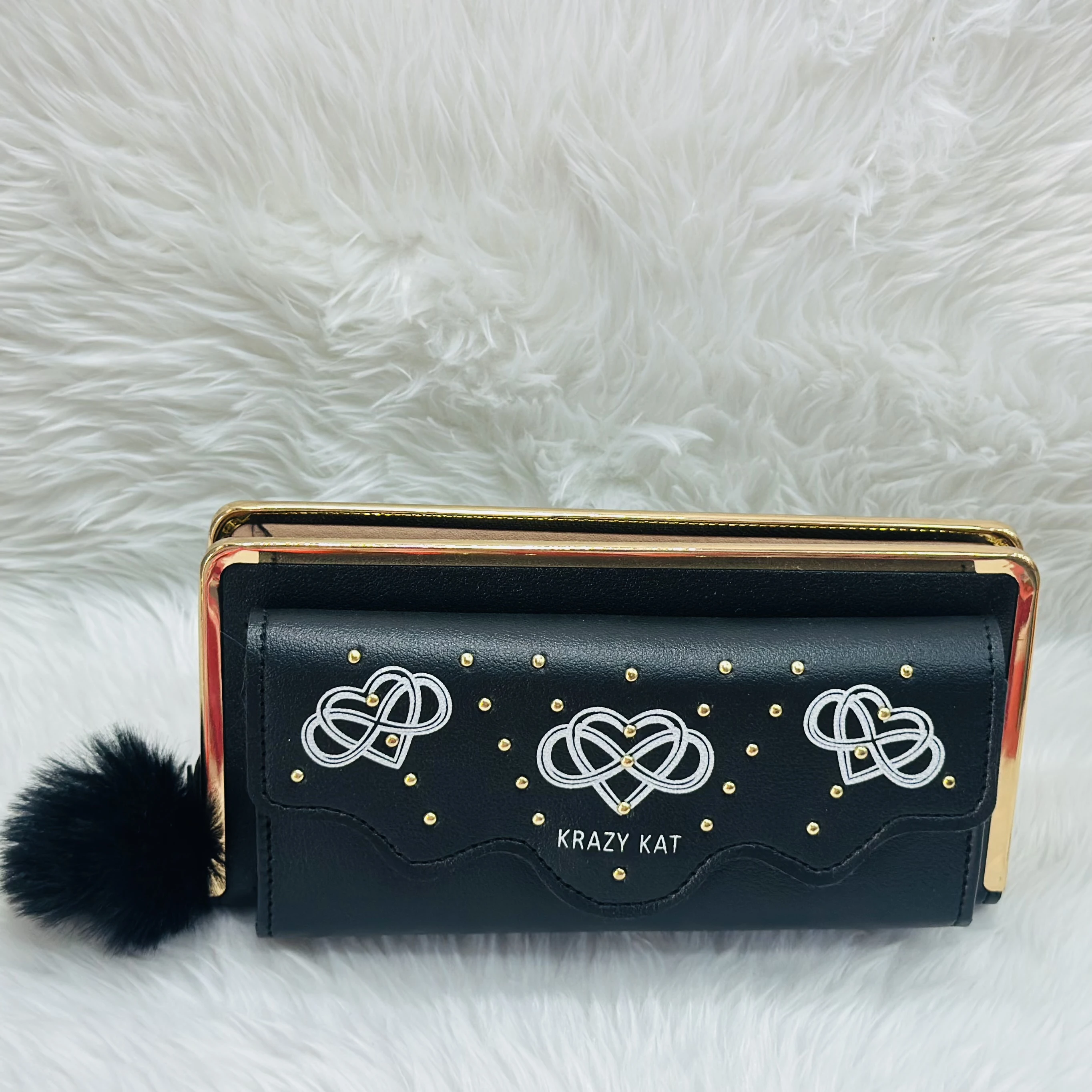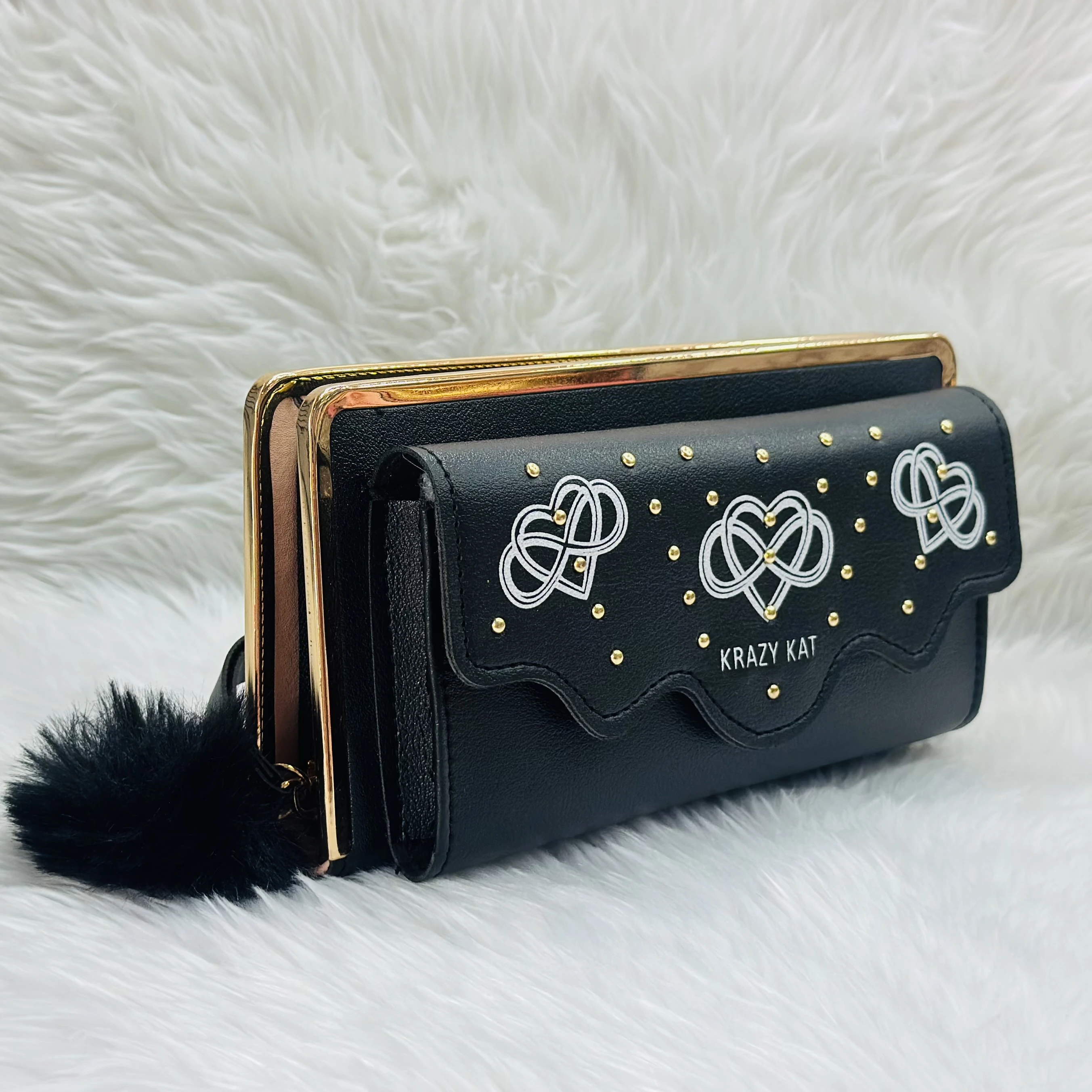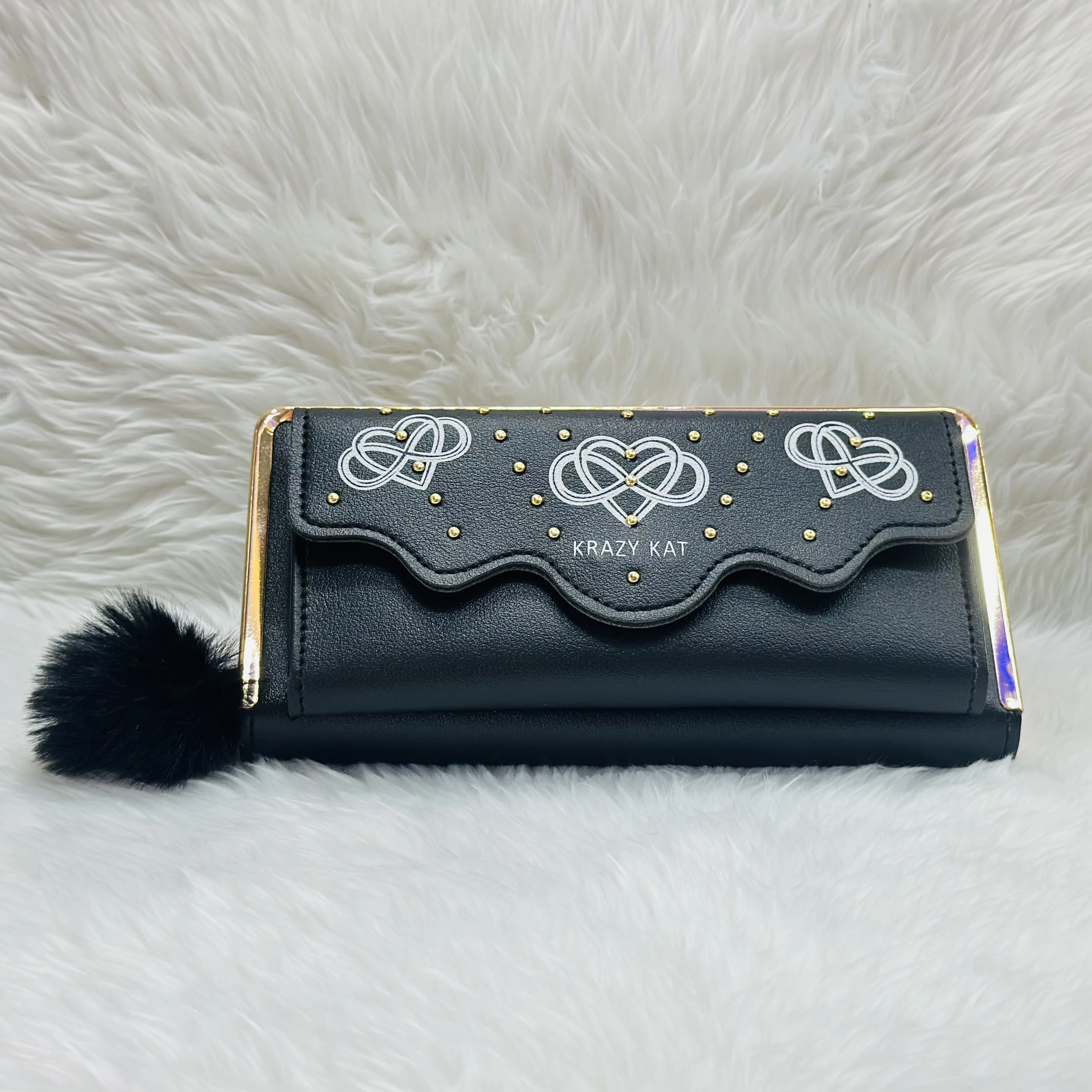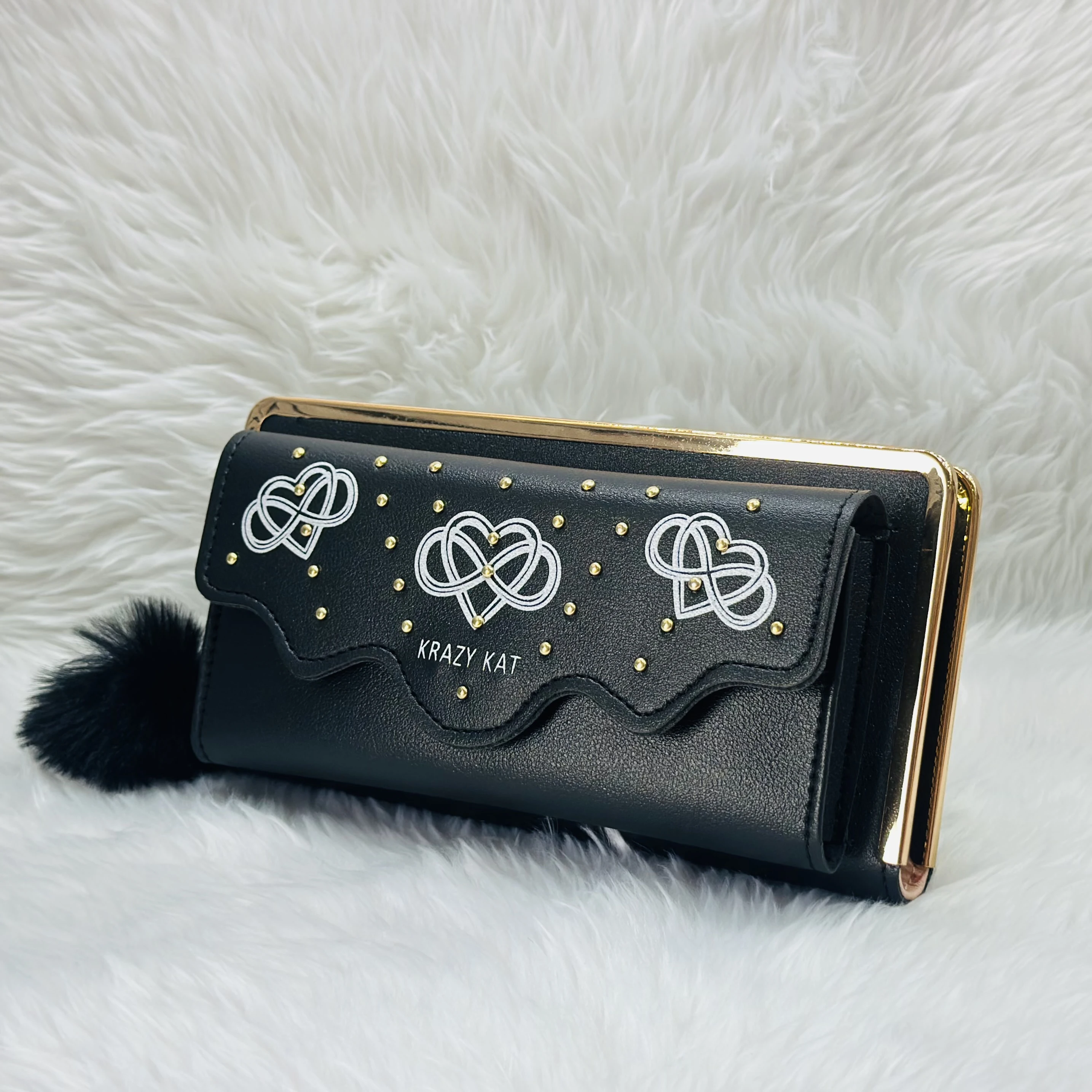 👉 Theme :- black women's wallet with a gold frame and a flap decorated with white knot-style heart patterns and small gold studs.