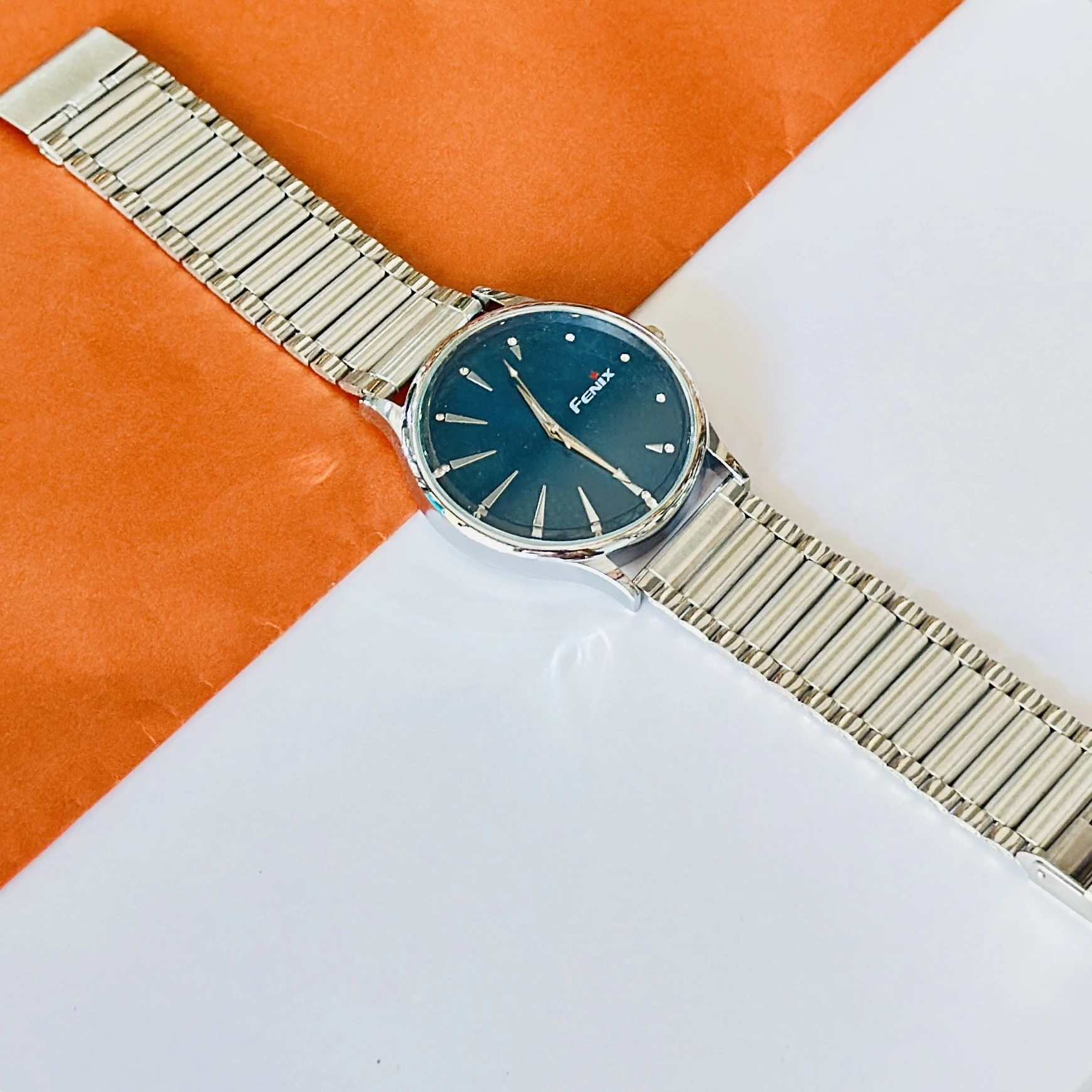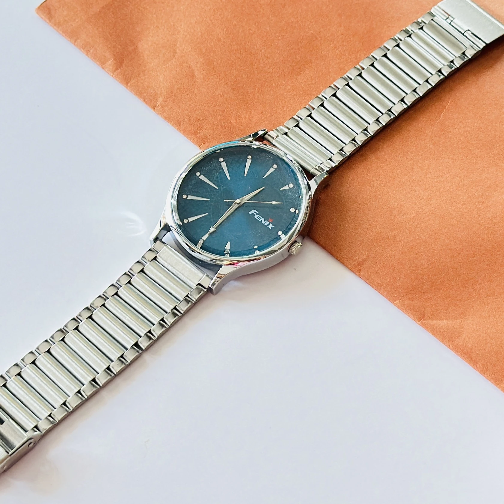 Blue dial with stick indices and a silver-toned stainless steel strap