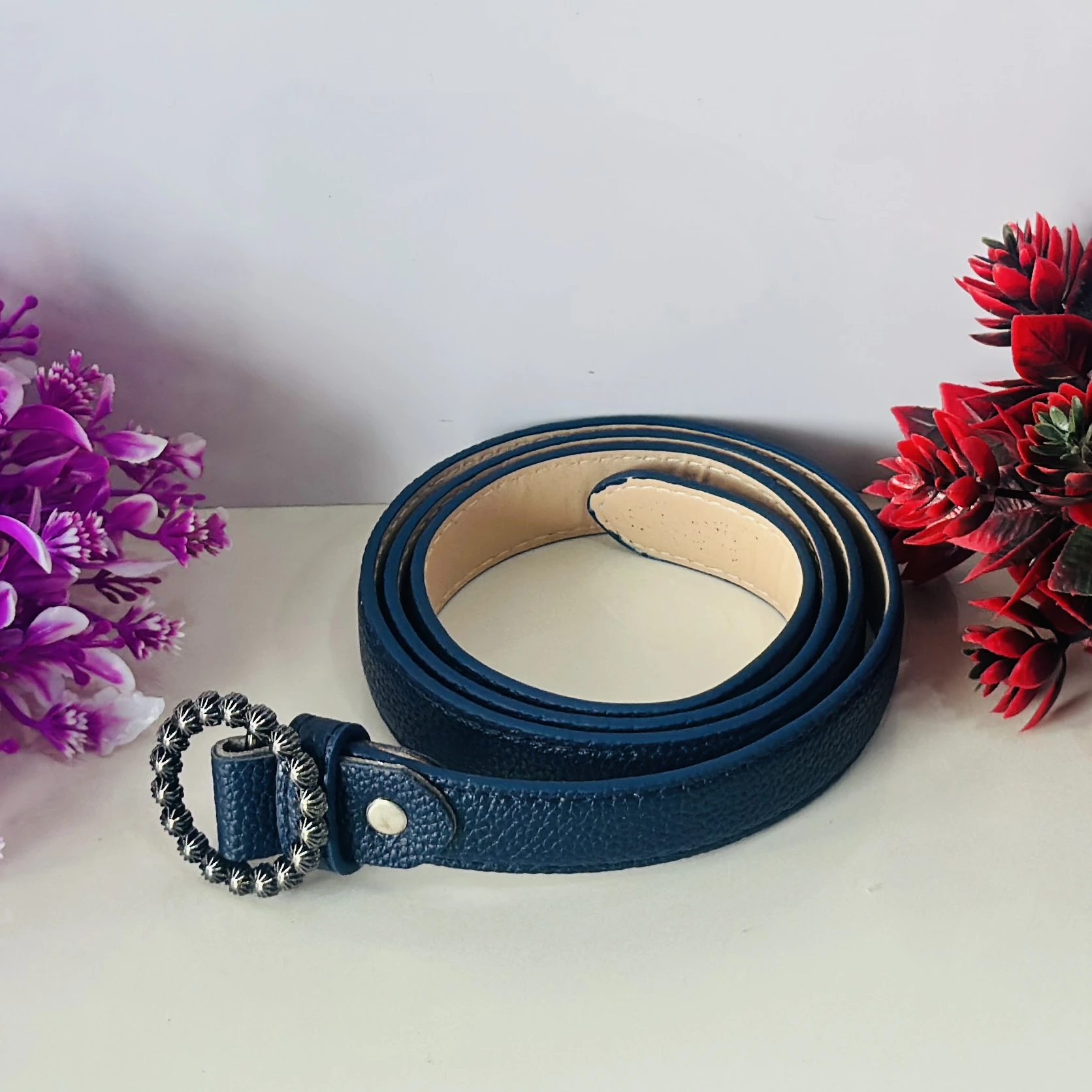 👉 Theme :- Blue Togo leather belt strap with a decorative buckle.