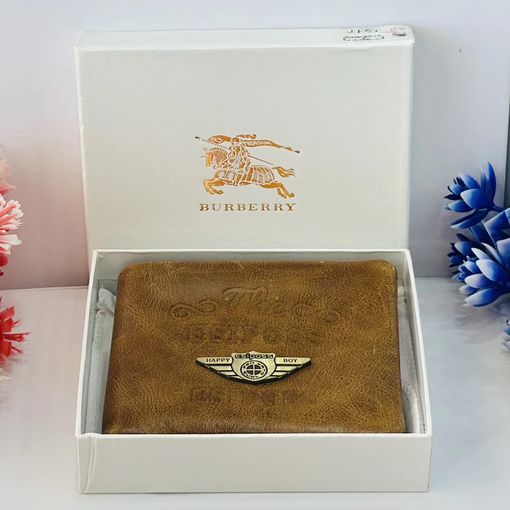 👉 Theme :- Brown leather bifold wallet presented in a Burberry gift box.