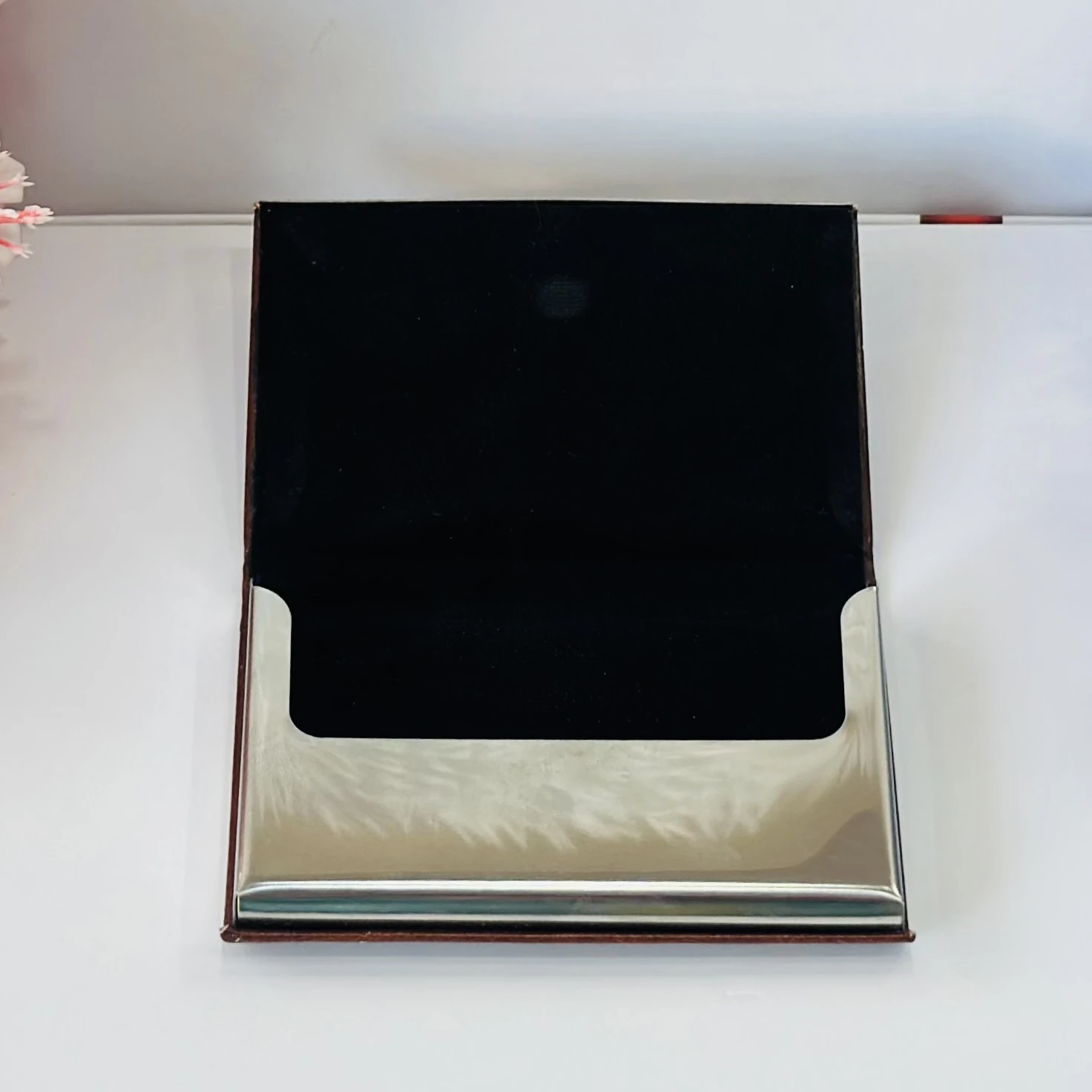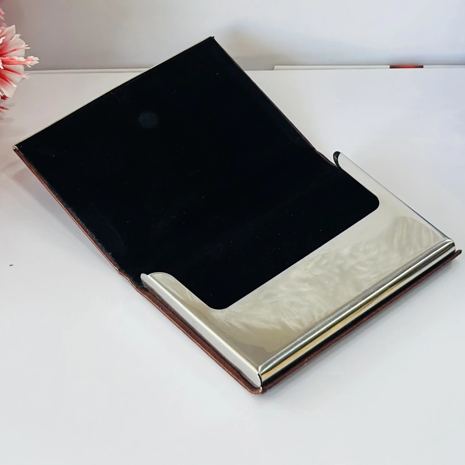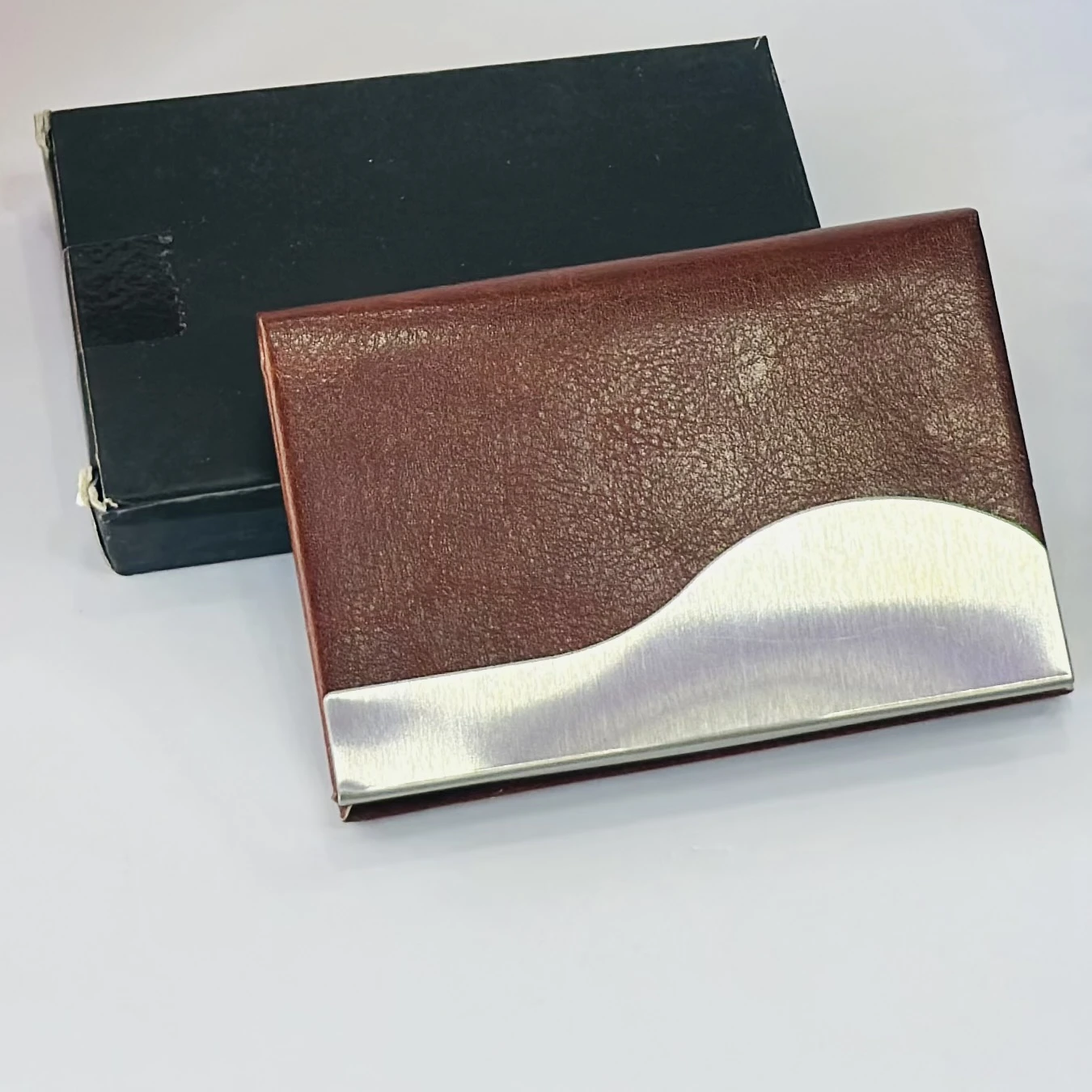 π Theme :- business card holder or card case, likely made of PU leather and stainless steel.