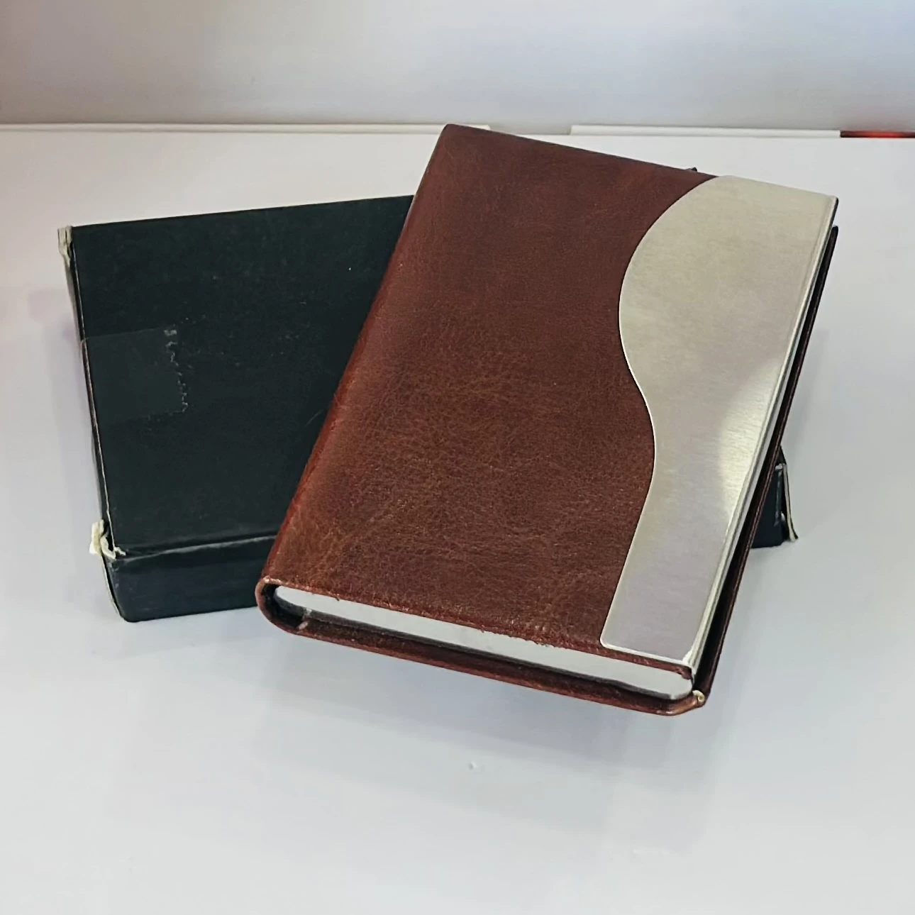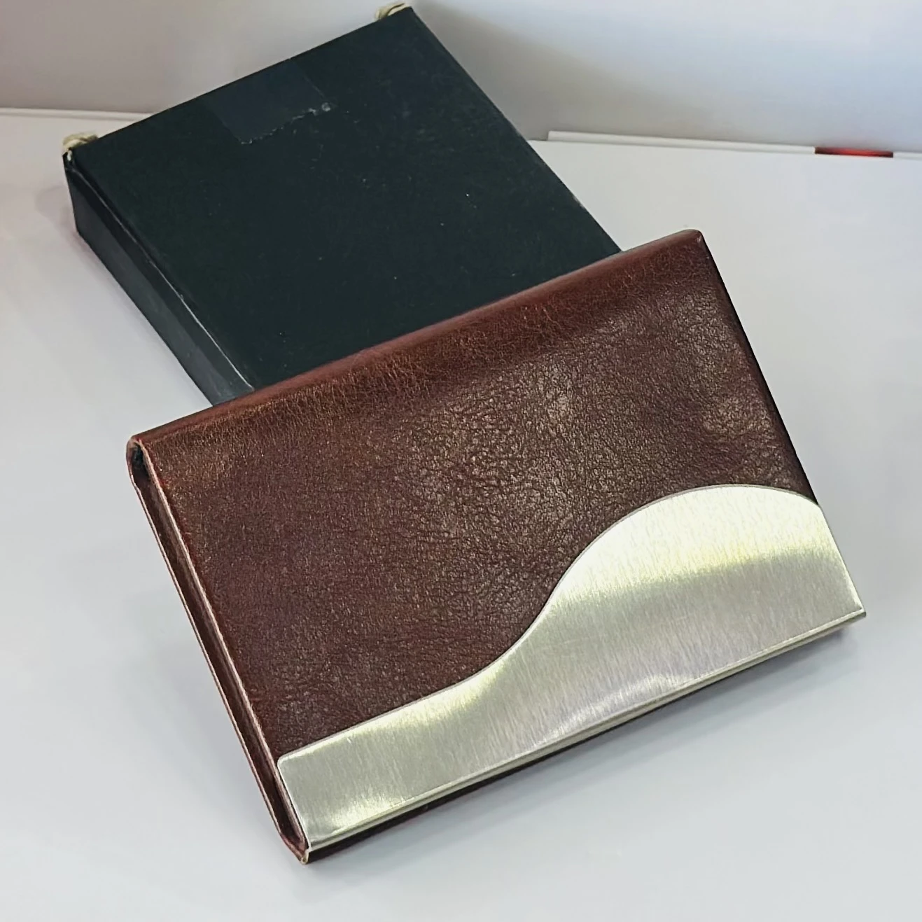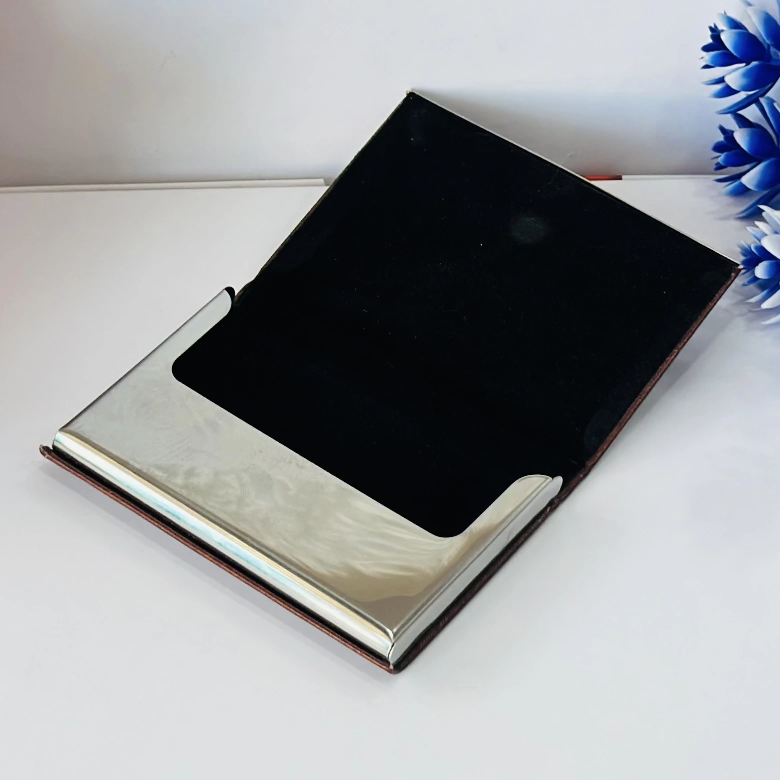 π Theme :- business card holder or card case, likely made of PU leather and stainless steel.