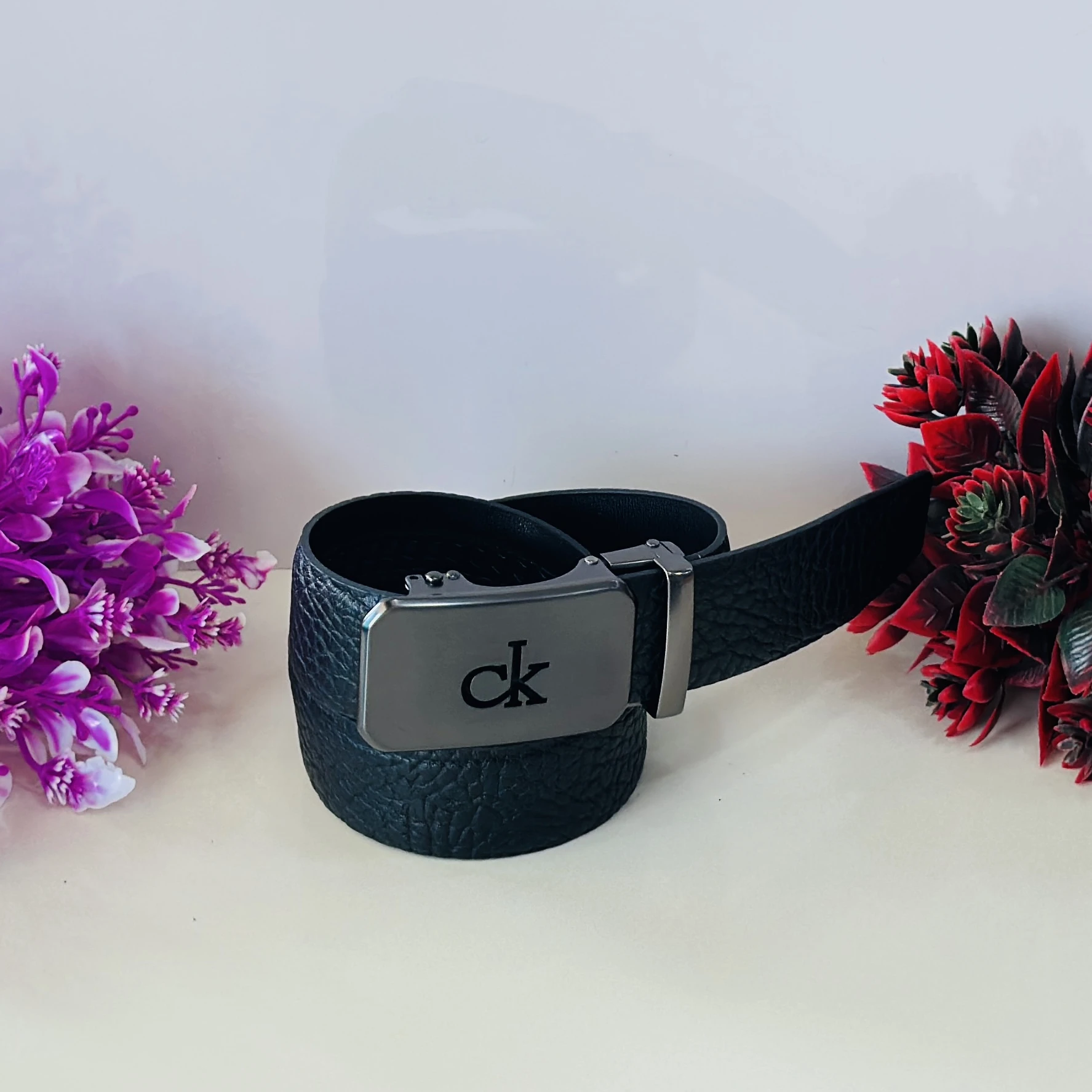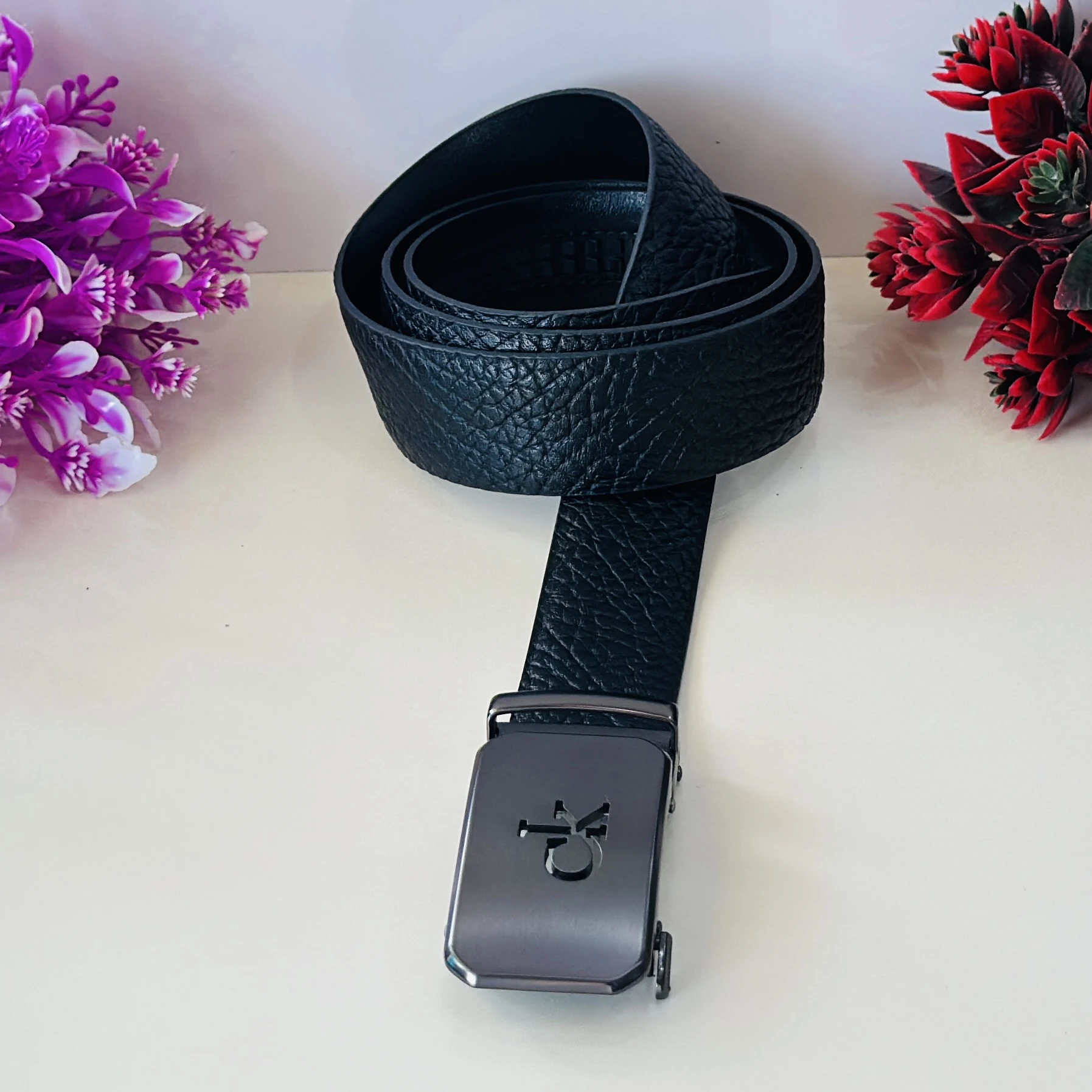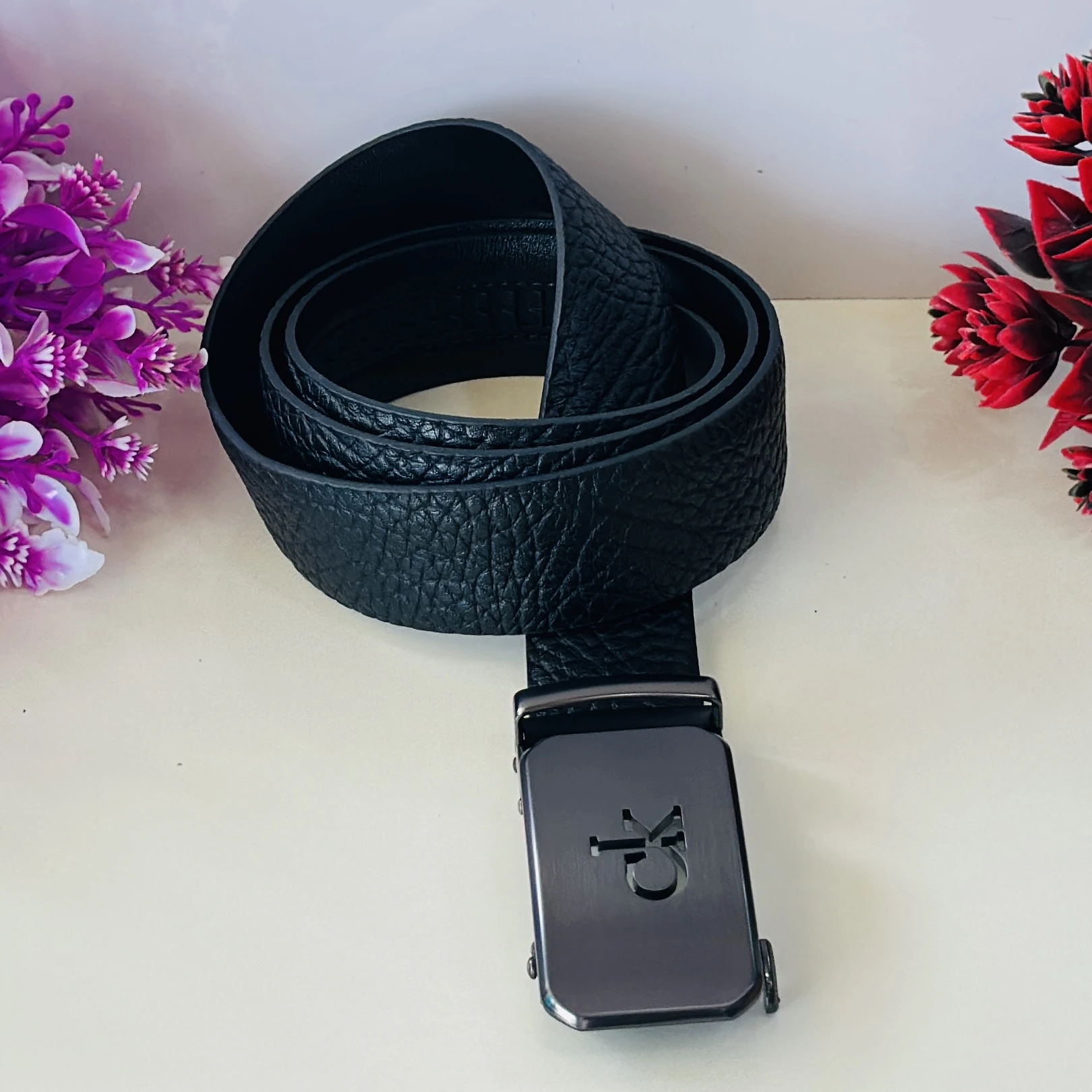 👉 Theme :- Calvin Klein black leather belt with a metal logo buckle.