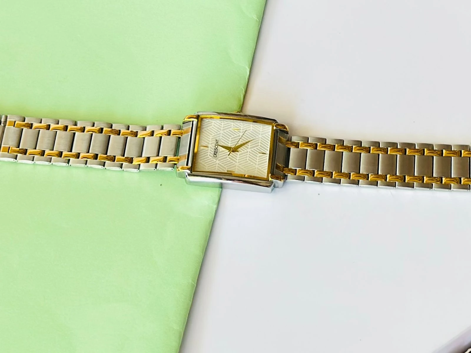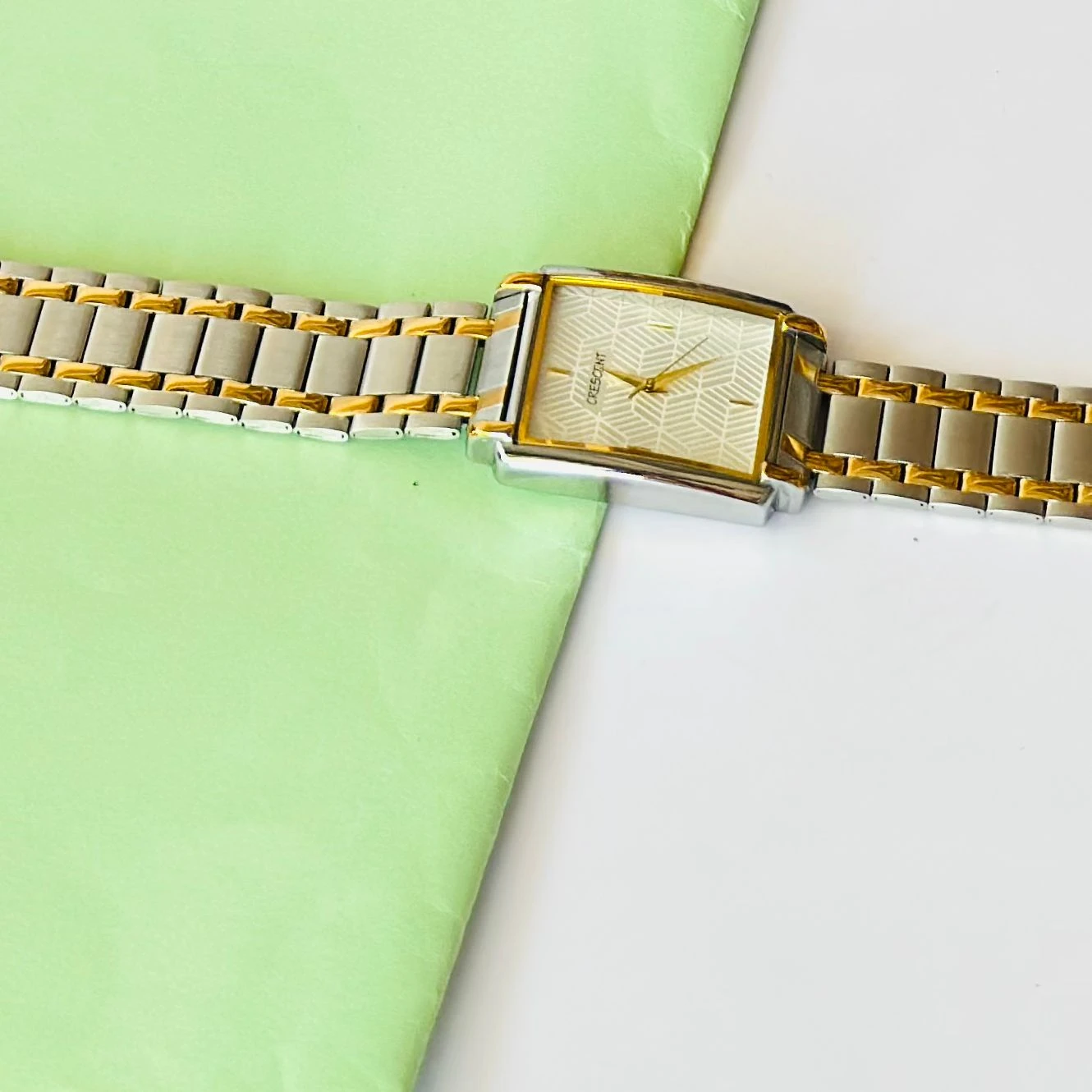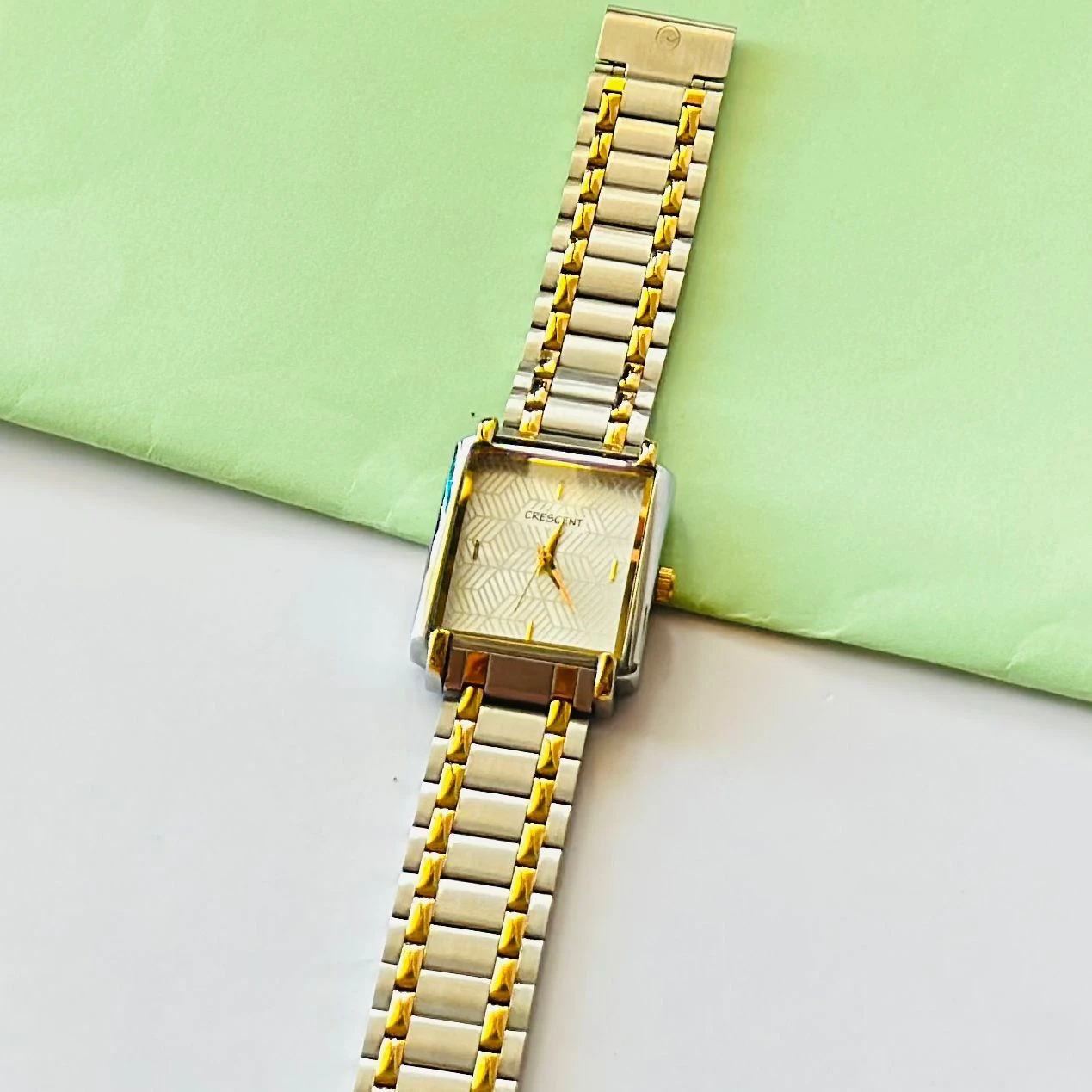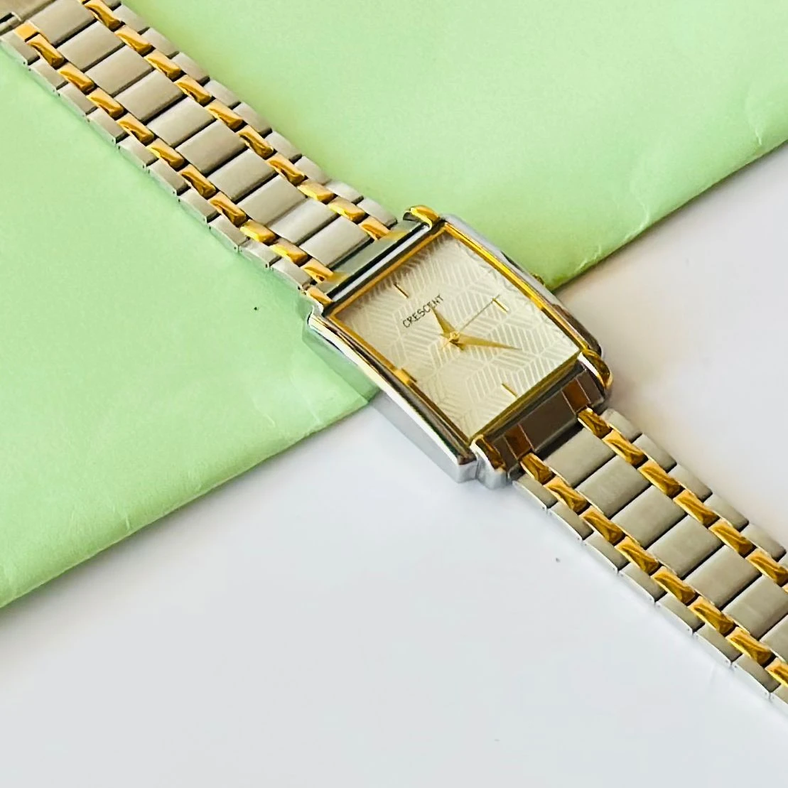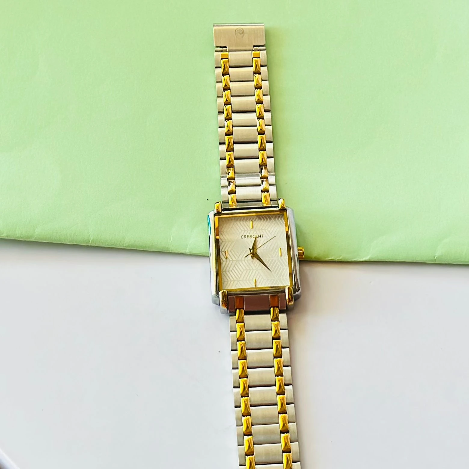 👉 Theme :- Crescent analog watch with a rectangular case and a two-tone (silver and gold) metal bracelet.