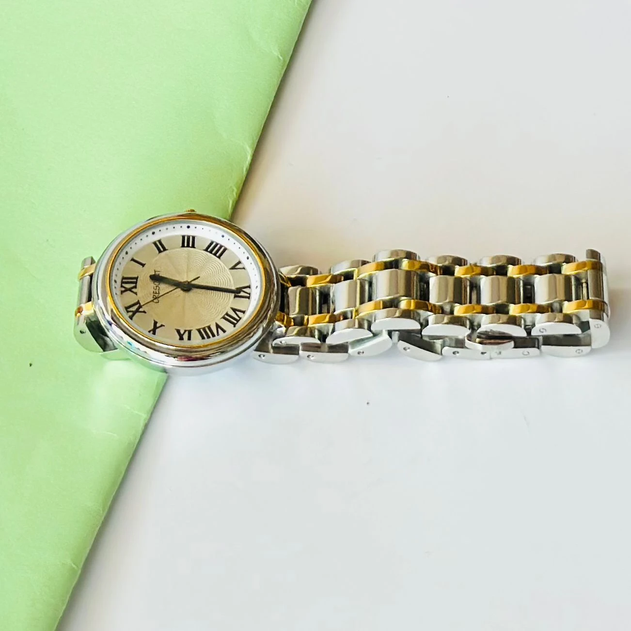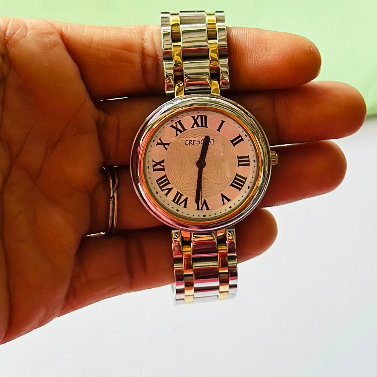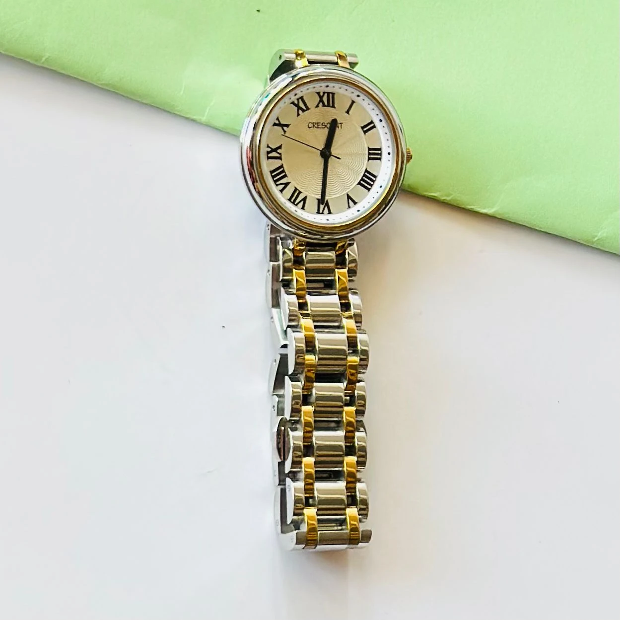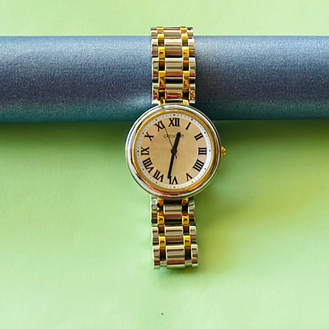 👉 Theme :- Crescent analog watch with a rectangular case and a two-tone (silver and gold) metal bracelet.