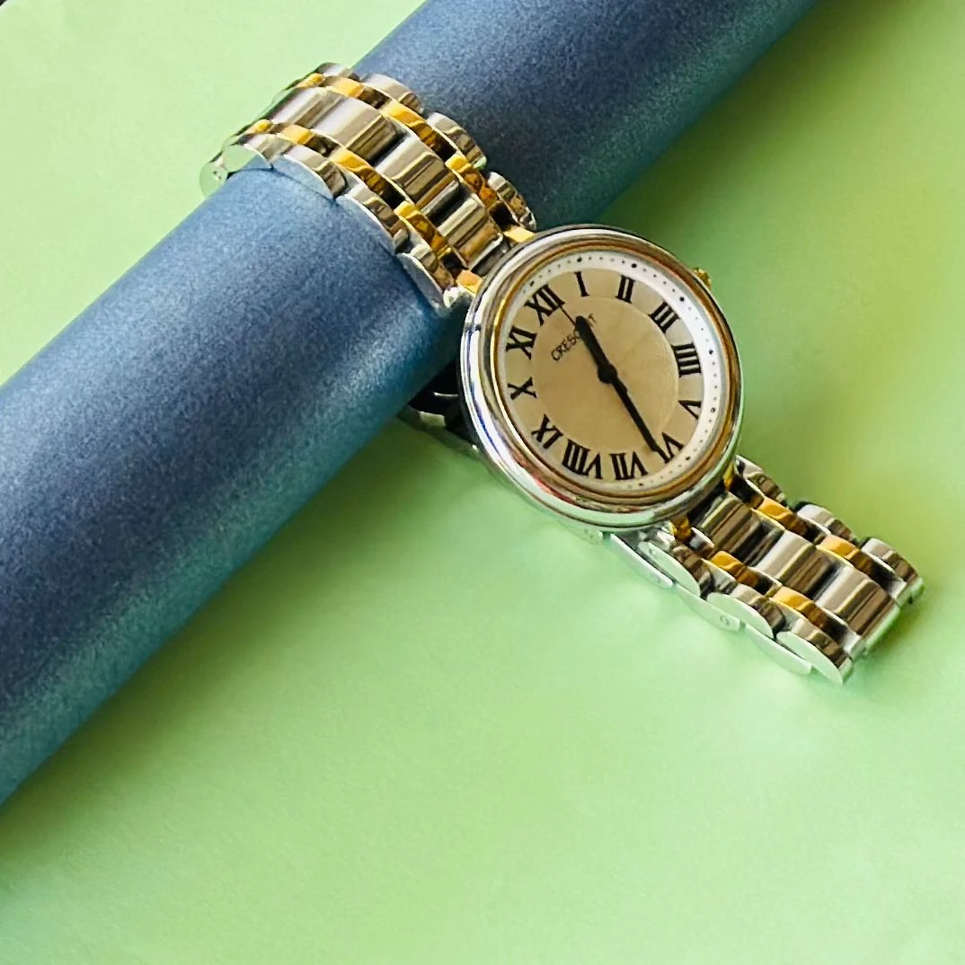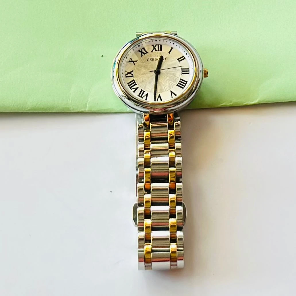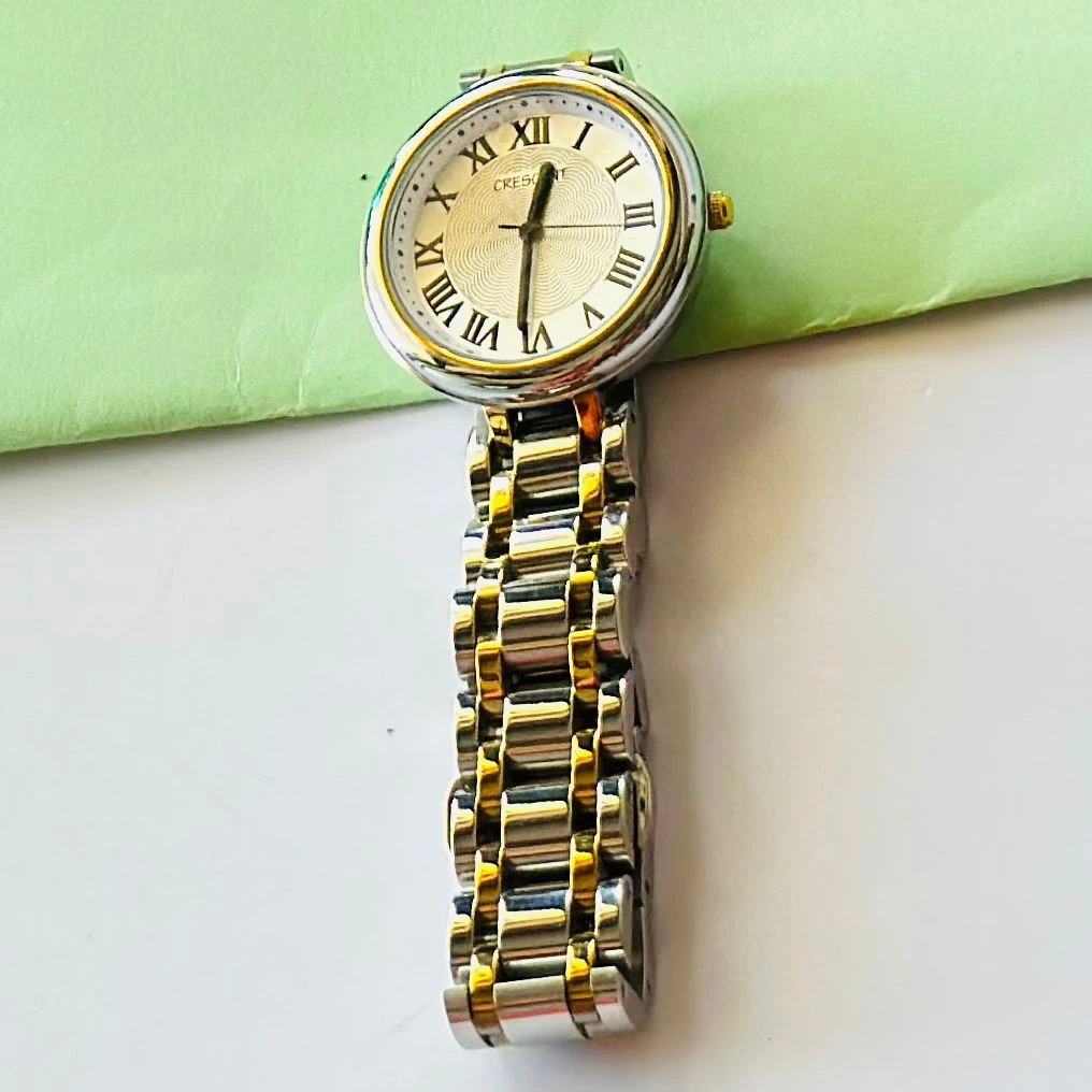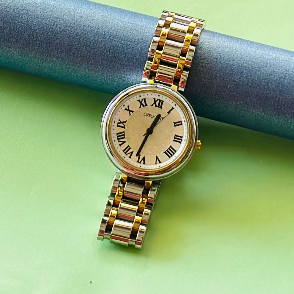 👉 Theme :- Crescent analog watch with a rectangular case and a two-tone (silver and gold) metal bracelet.