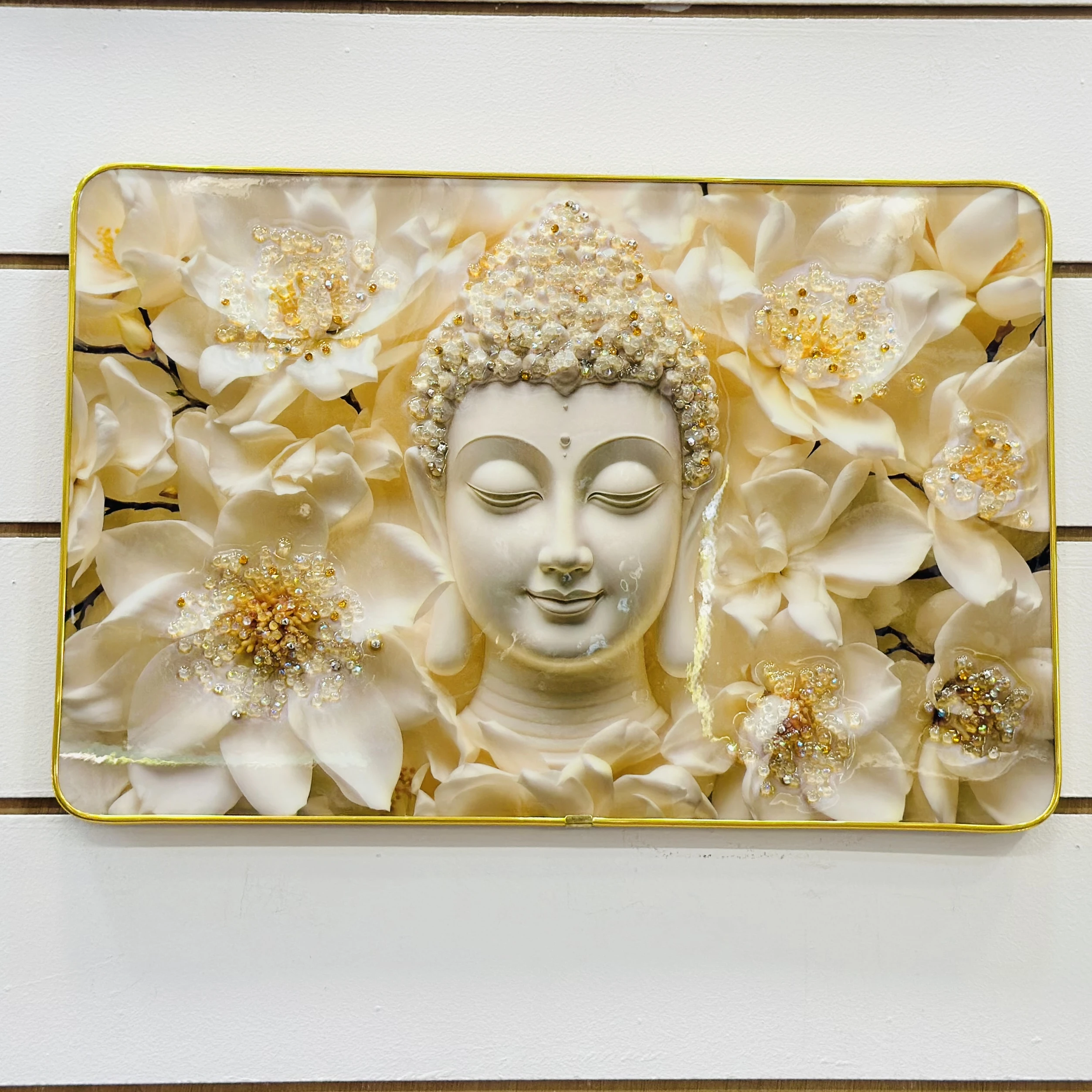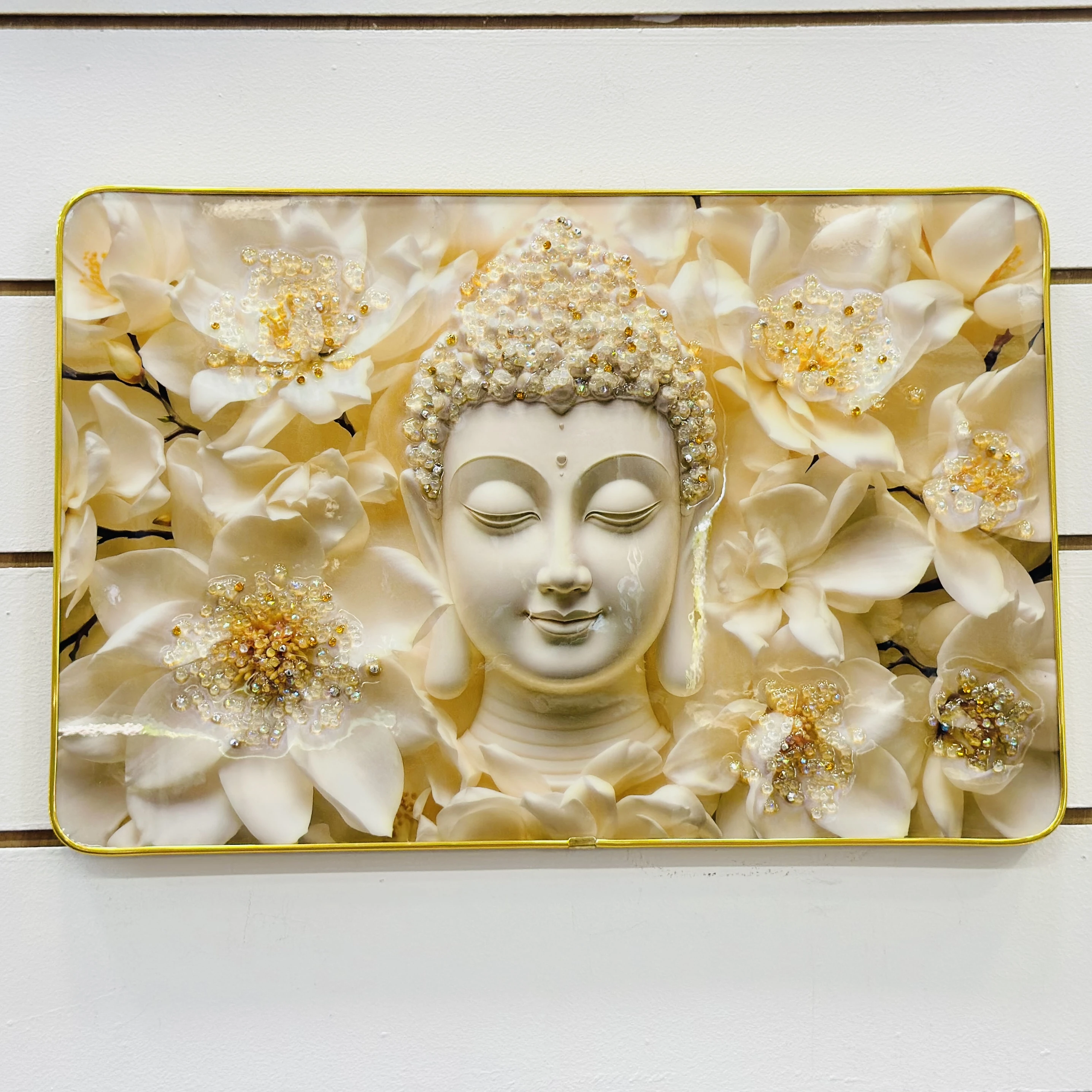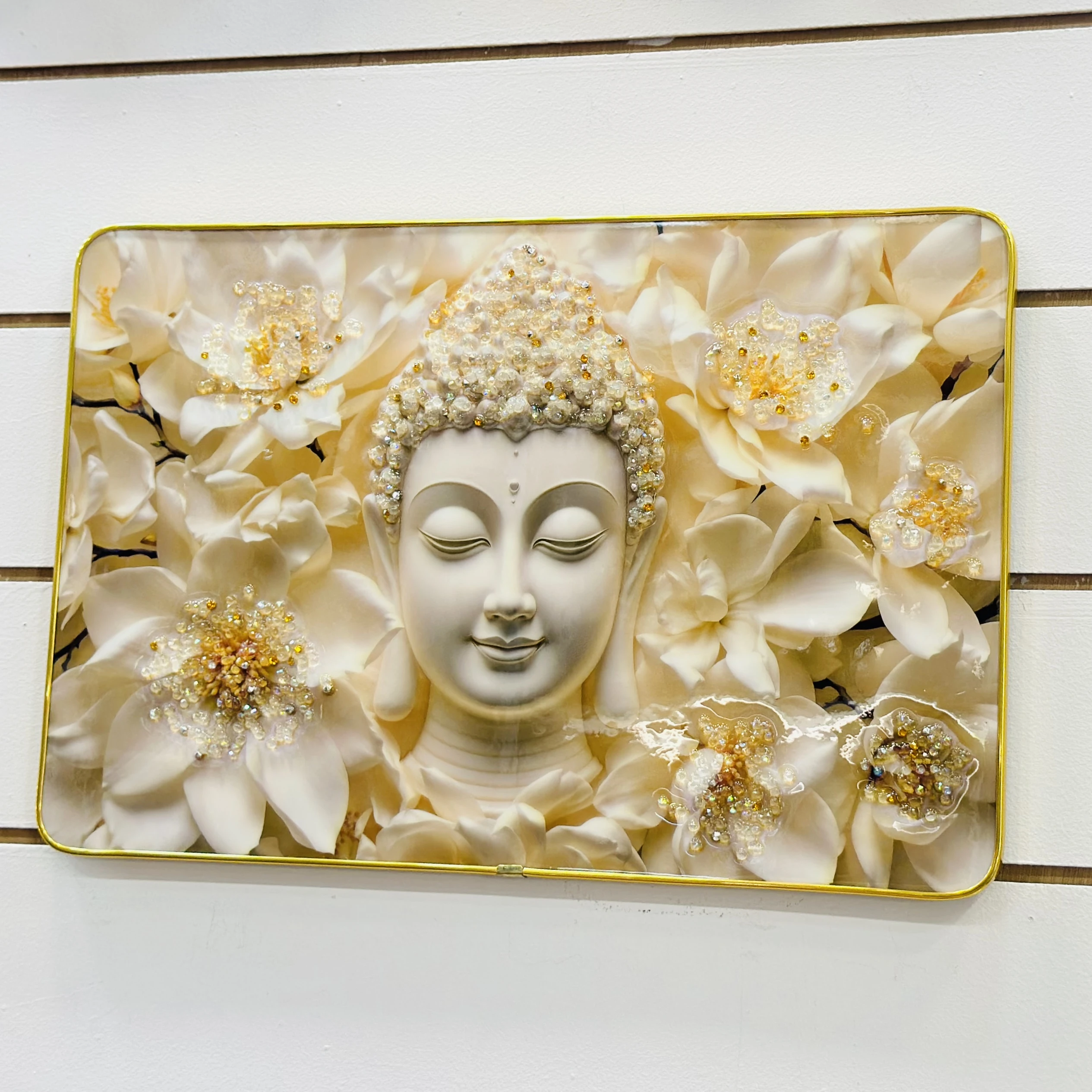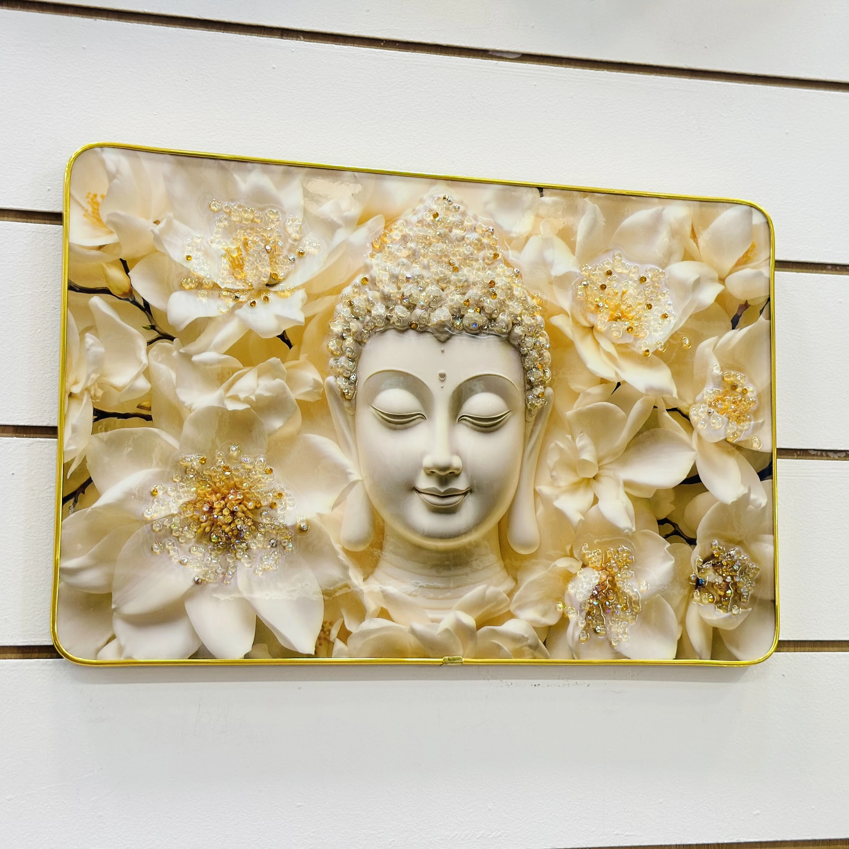 👉Theme :- sparkle laminated or crystal-embedded Buddha wall painting in a gold-slim frame
