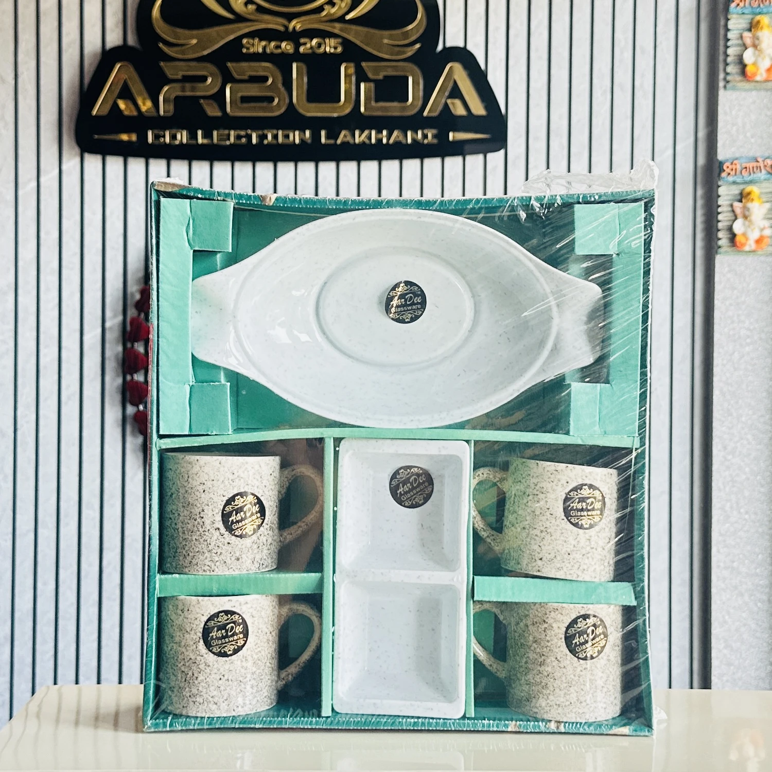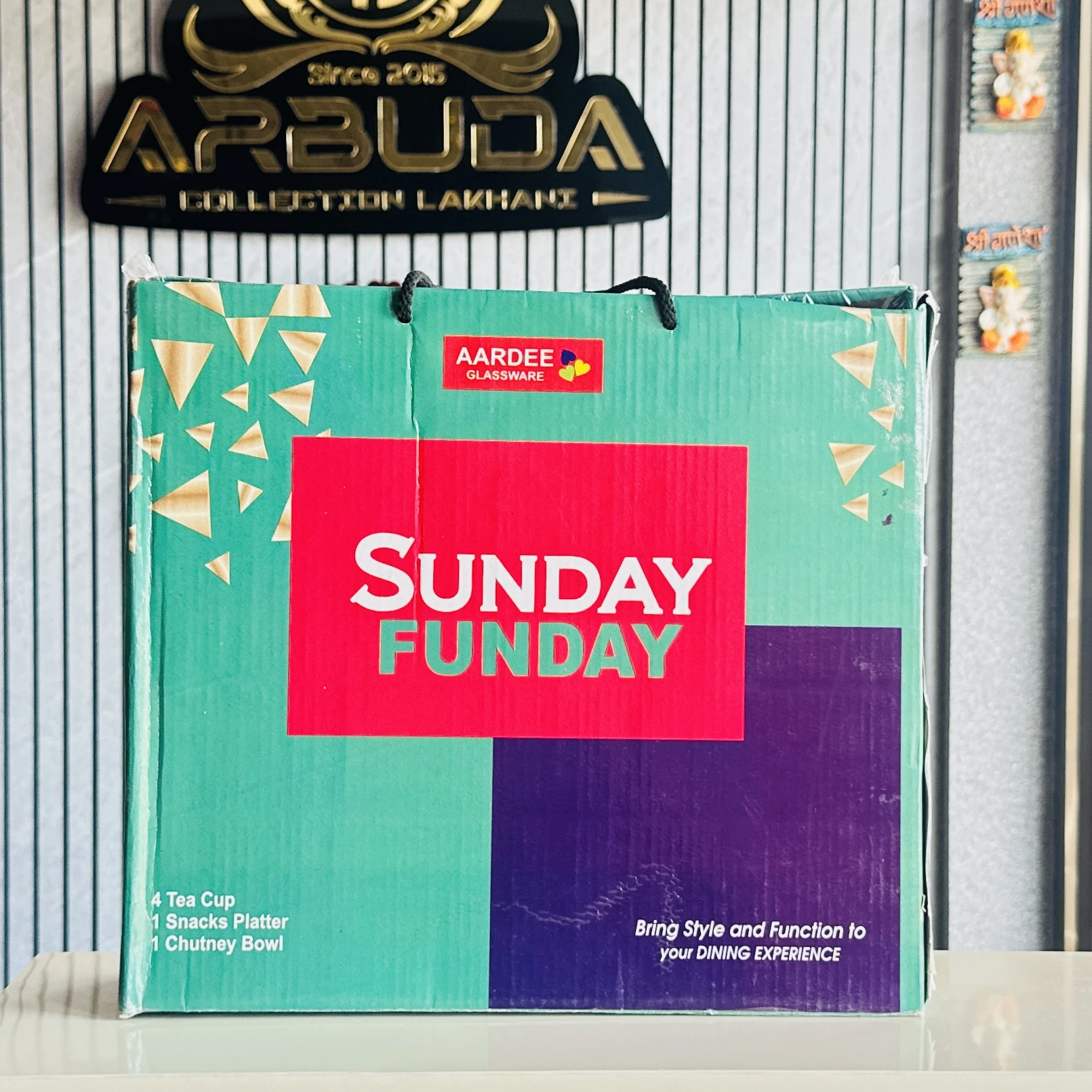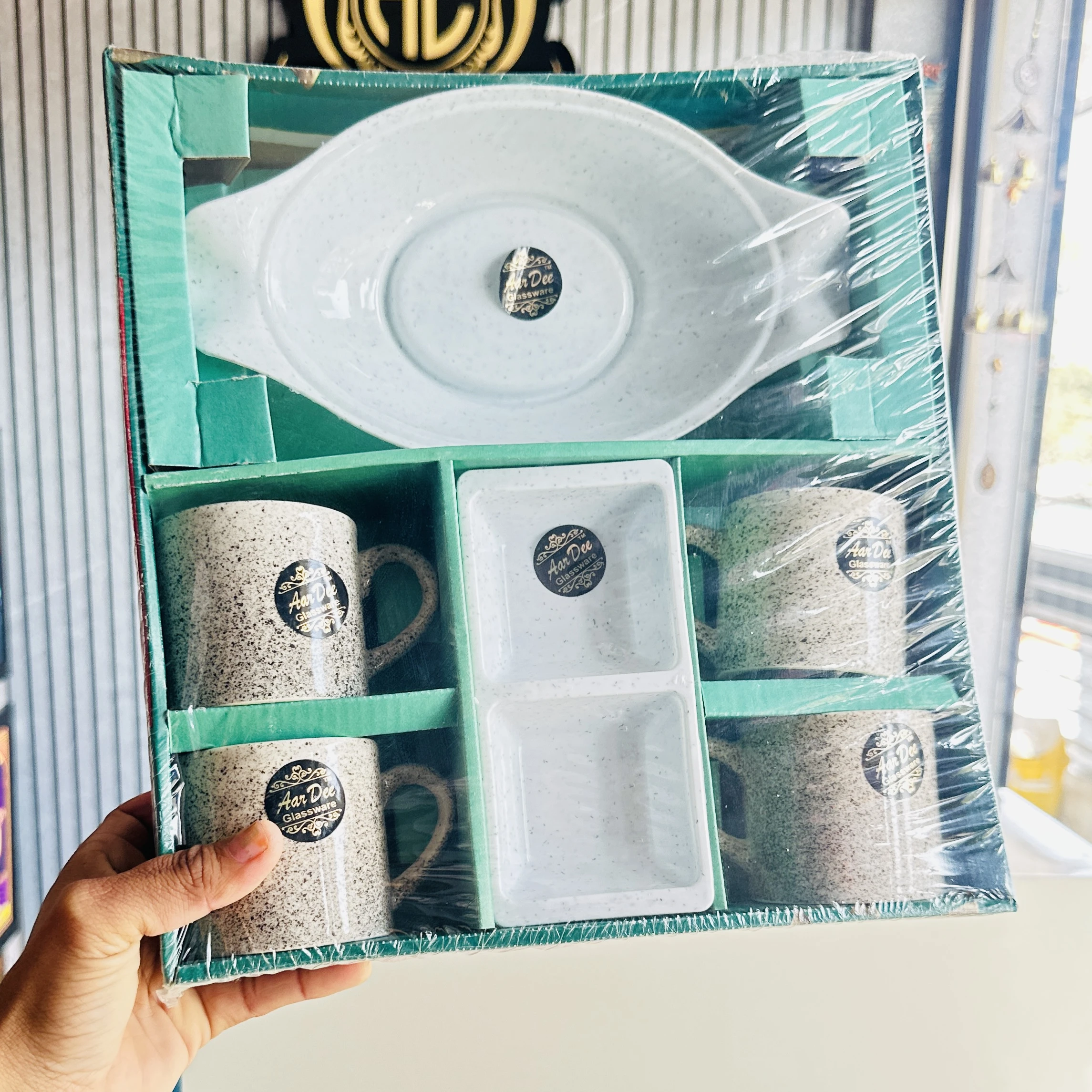 👉 Theme :- Aar Dee Glassware" brand Sunday Funday 6-piece ceramic cup and plastic snack set