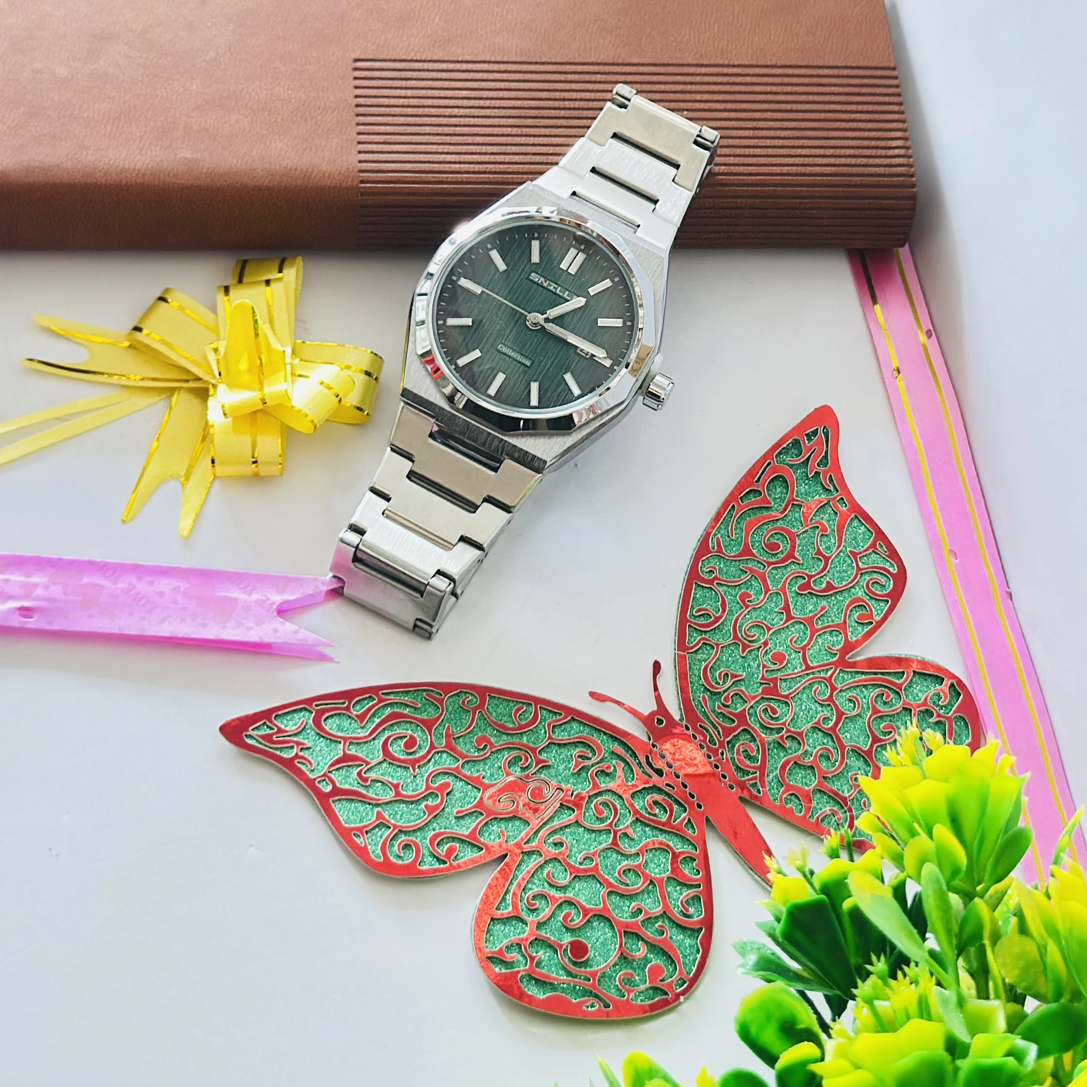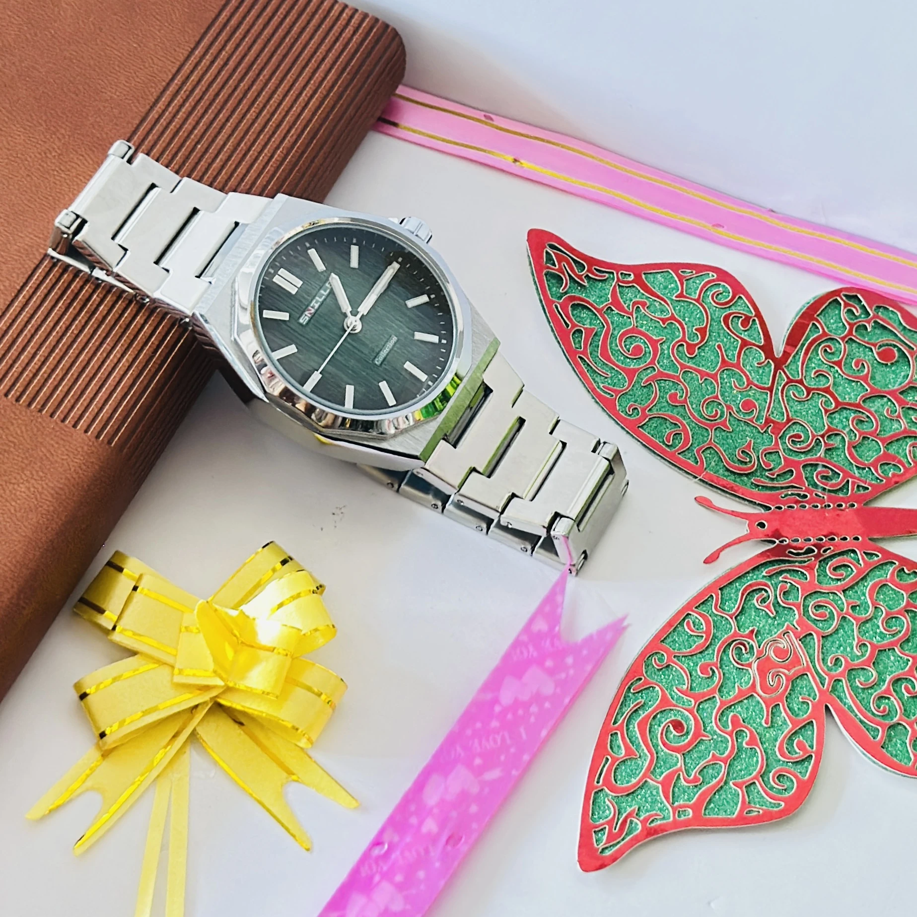 👉 Theme :- D1 Milano Men Code Automatic with a green analog dial.
