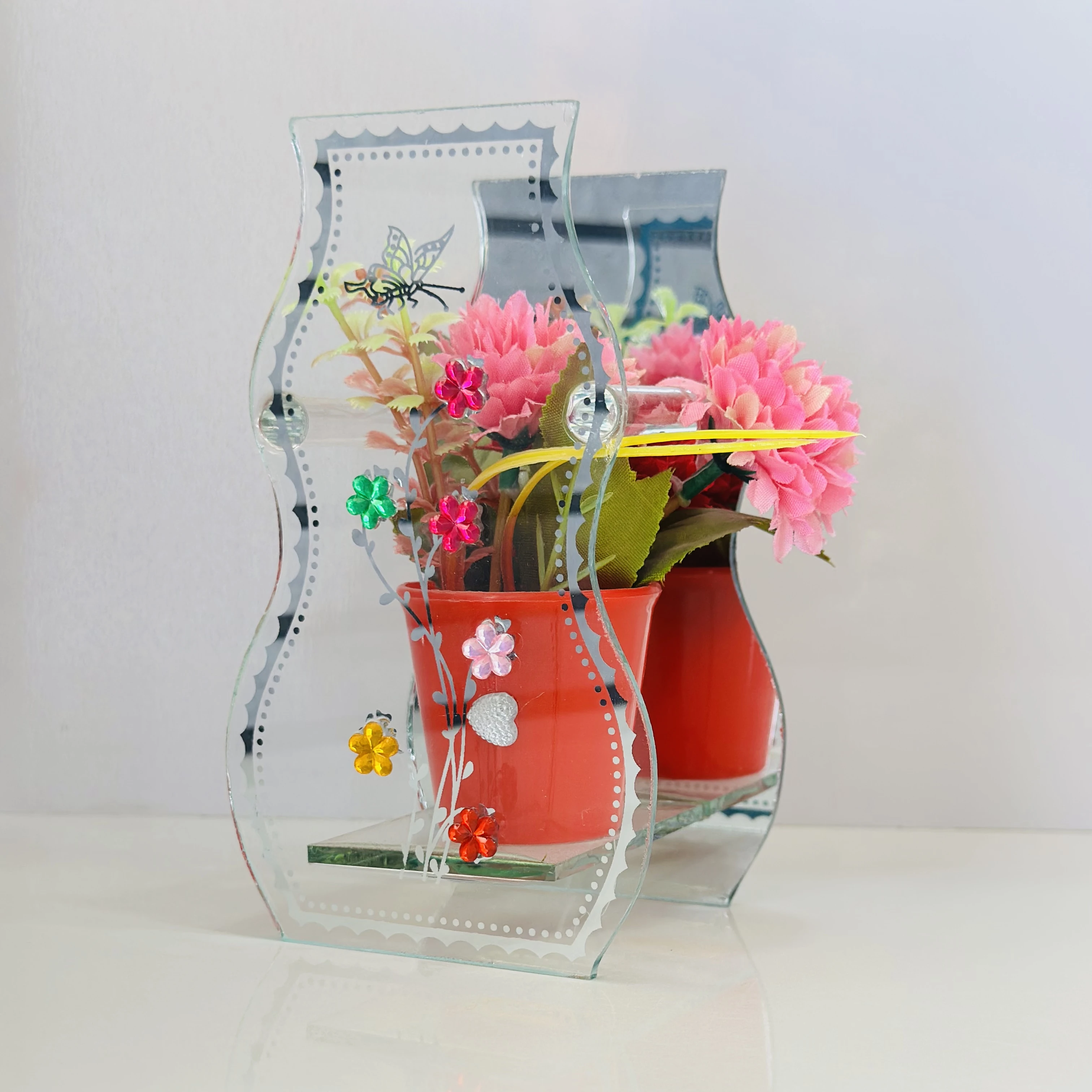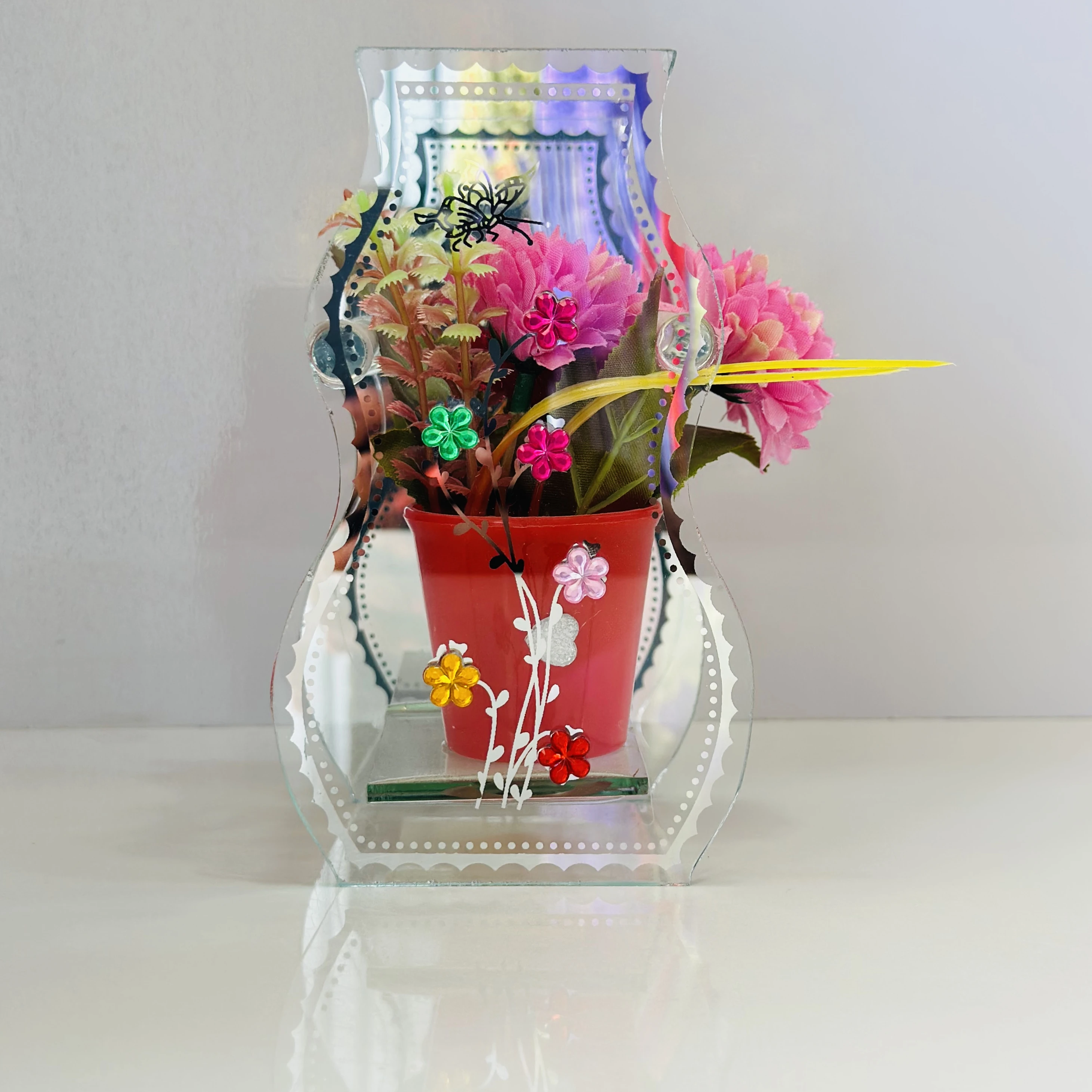 👉 Theme :- decorative glass vase with a purple pot and artificial flowers inside. It is designed to be a centerpiece or a decorative item for a home or office.