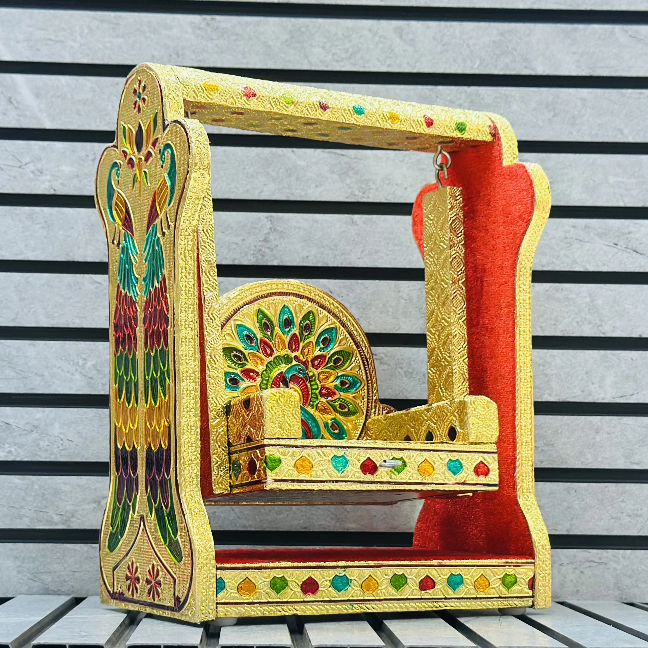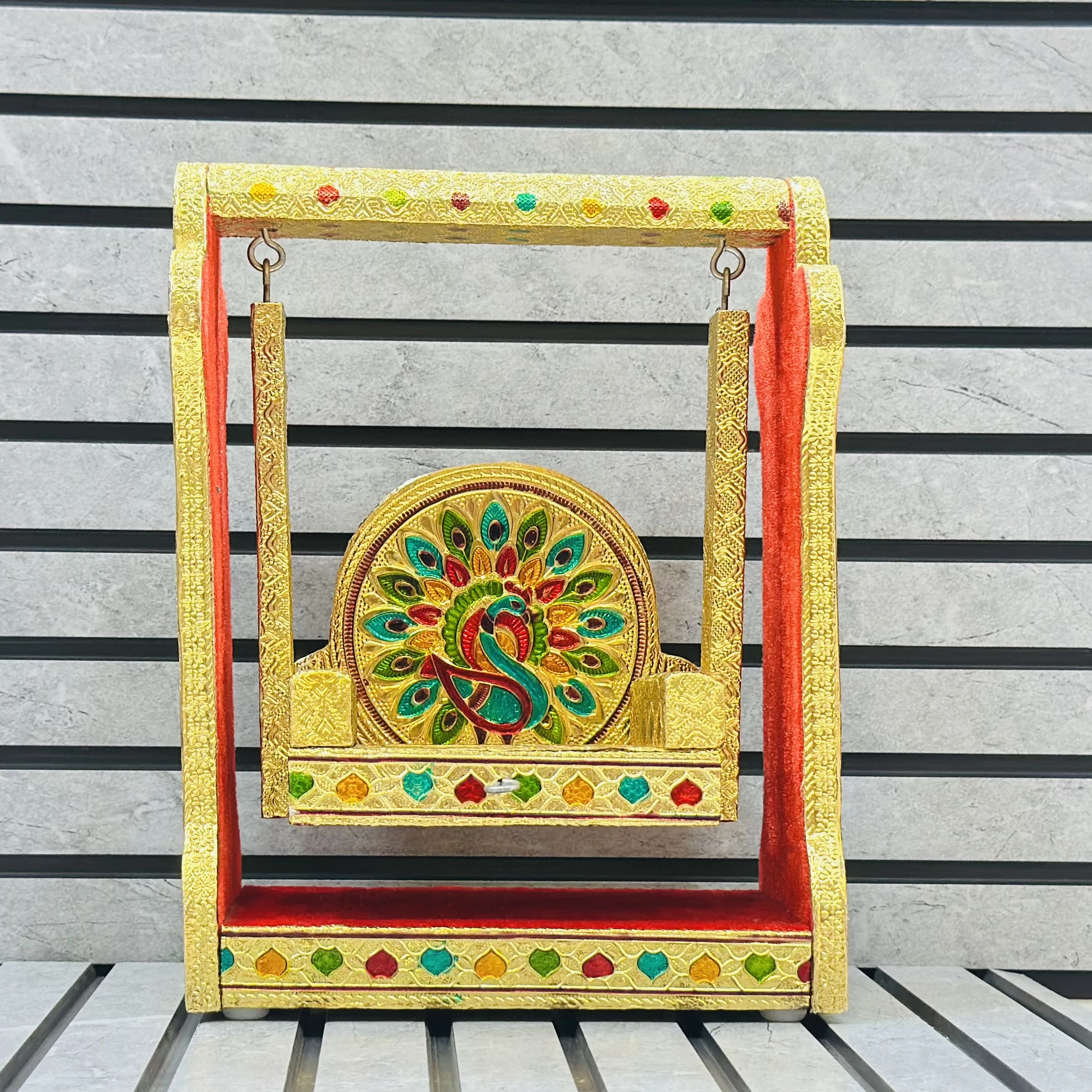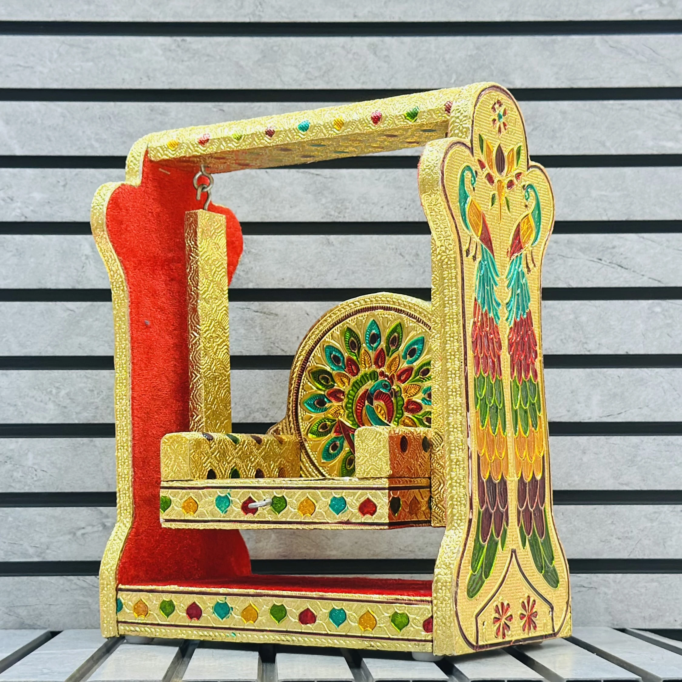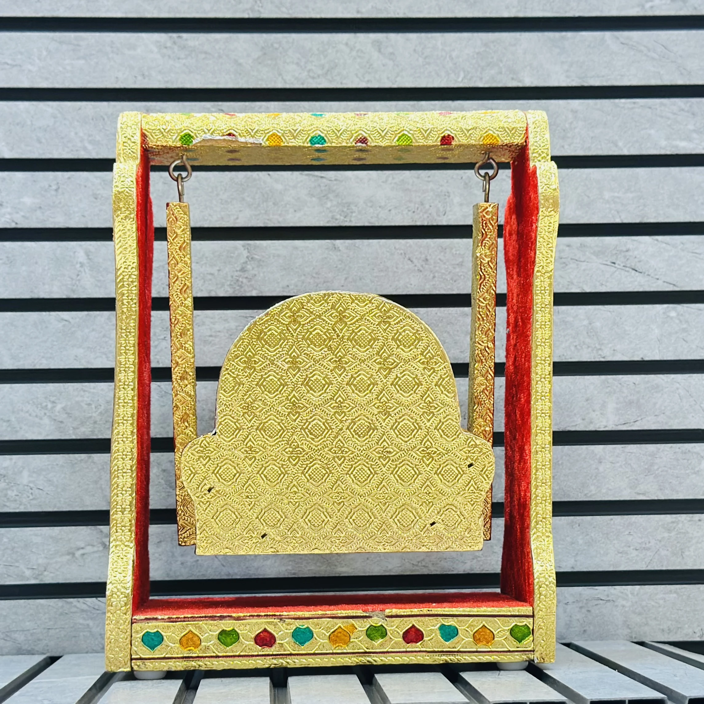 πŸ‘‰ Theme :-  decorative, gold-toned Rajwadi Jhula (royal swing) often used for religious idols or home decor.