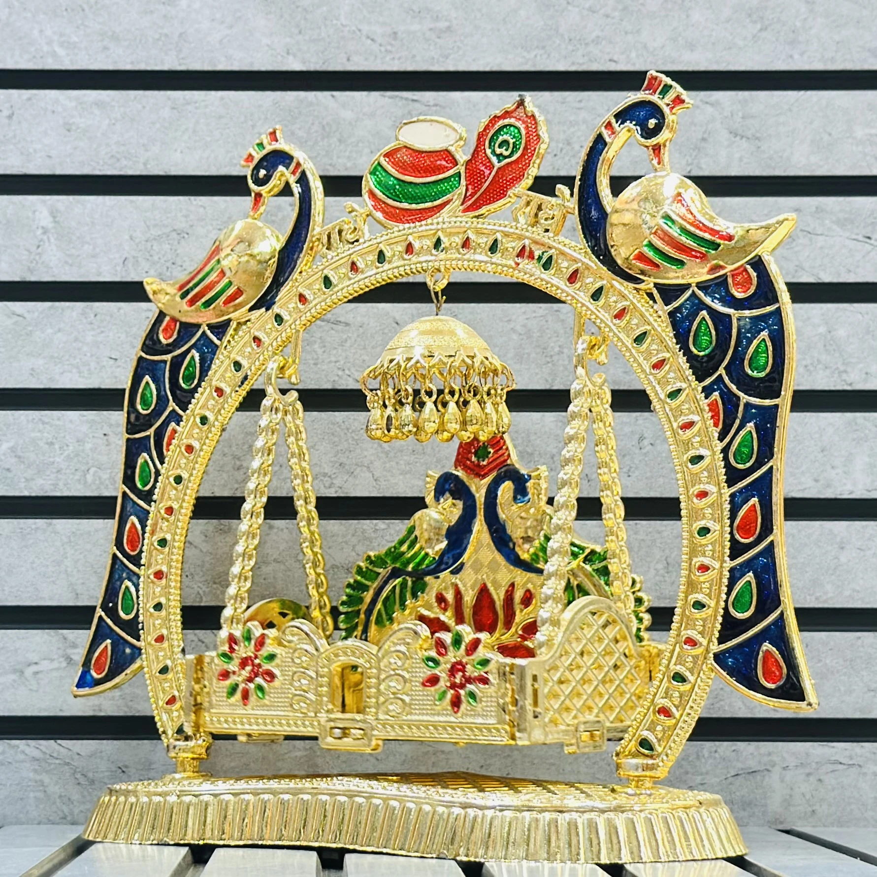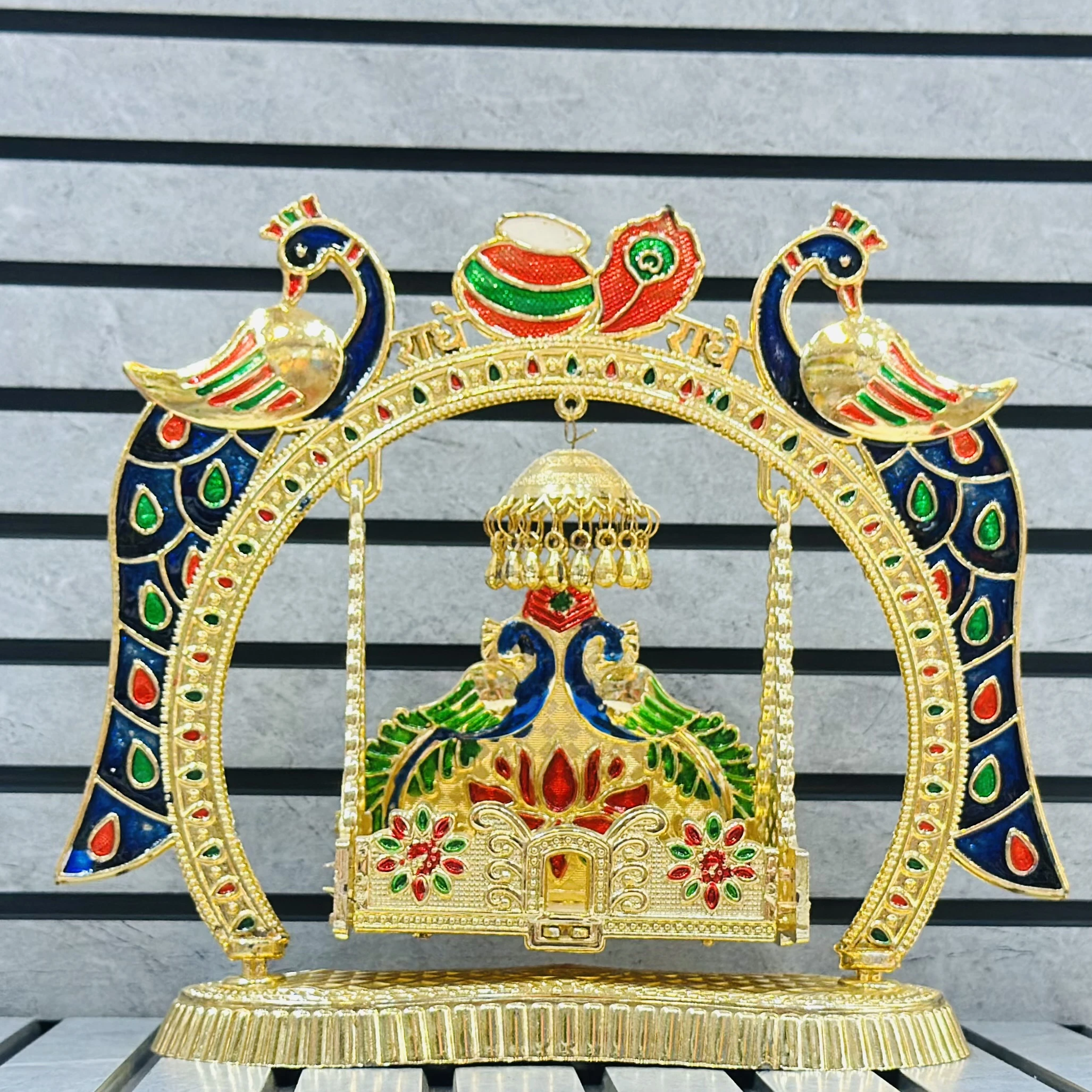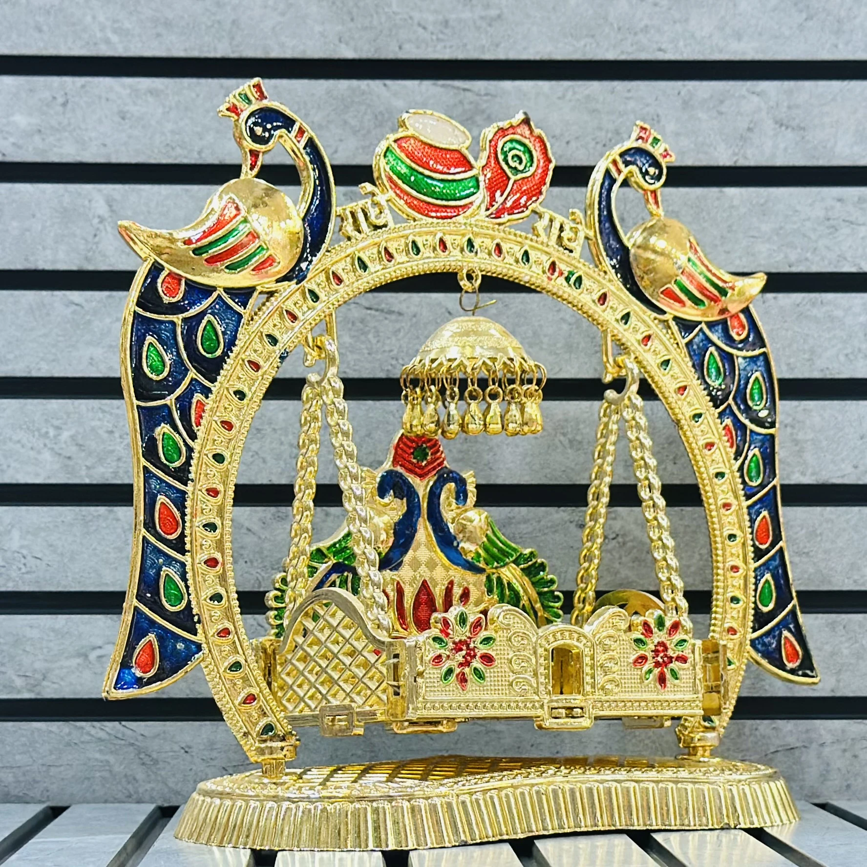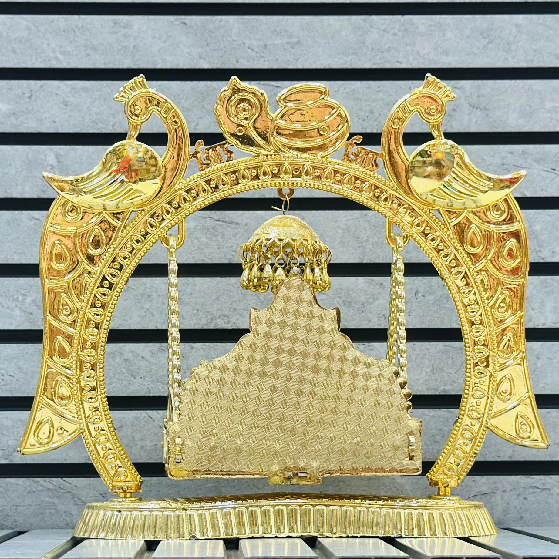 π Theme :- decorative, gold-toned Rajwadi Jhula (royal swing) often used for religious idols or home decor.