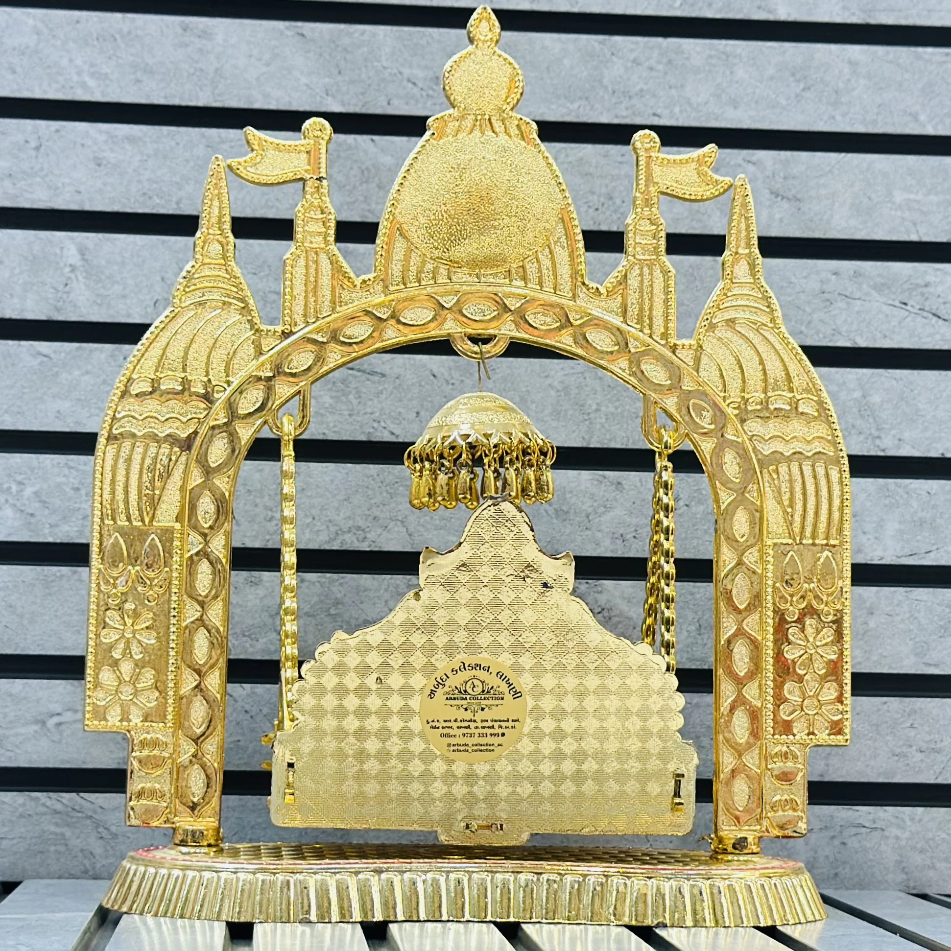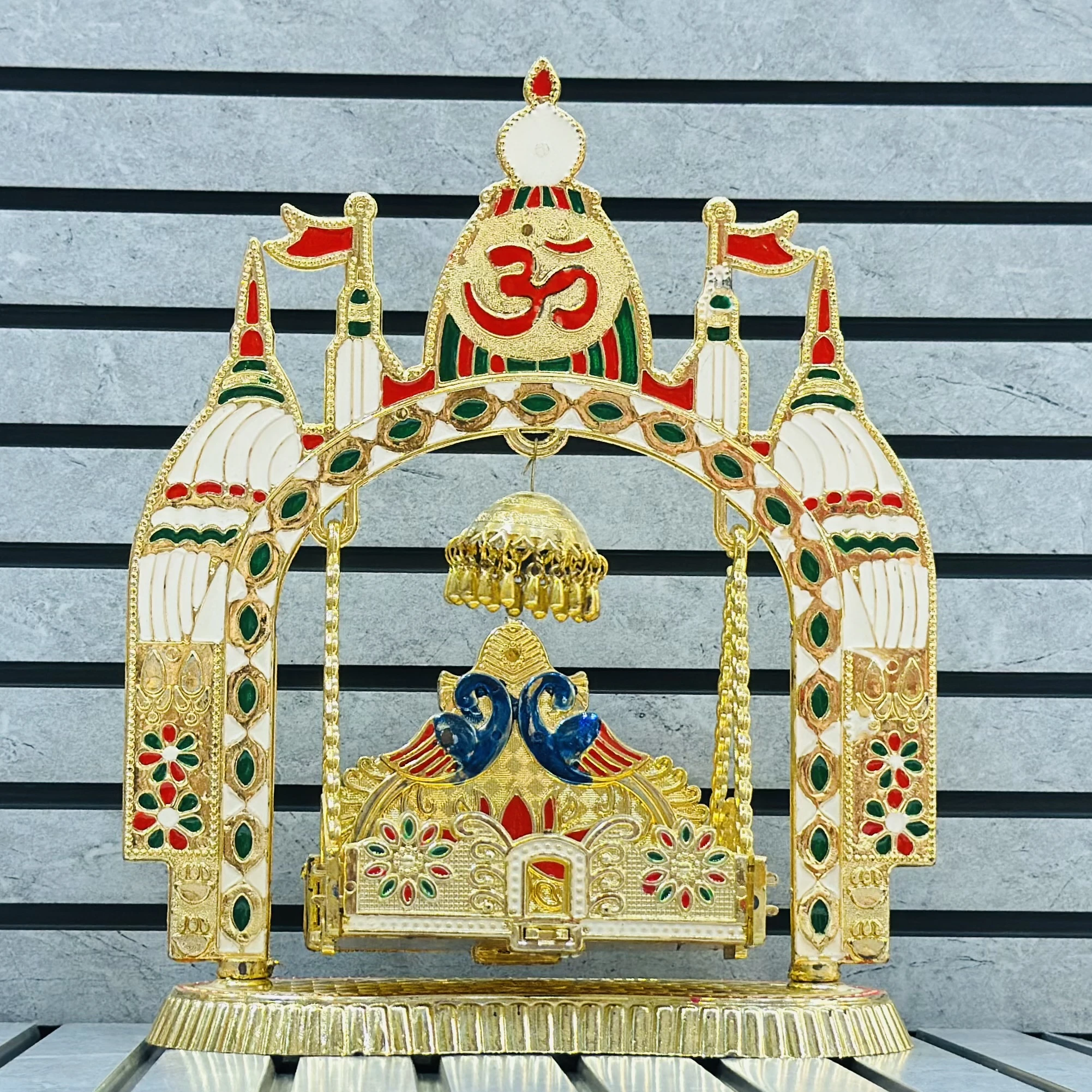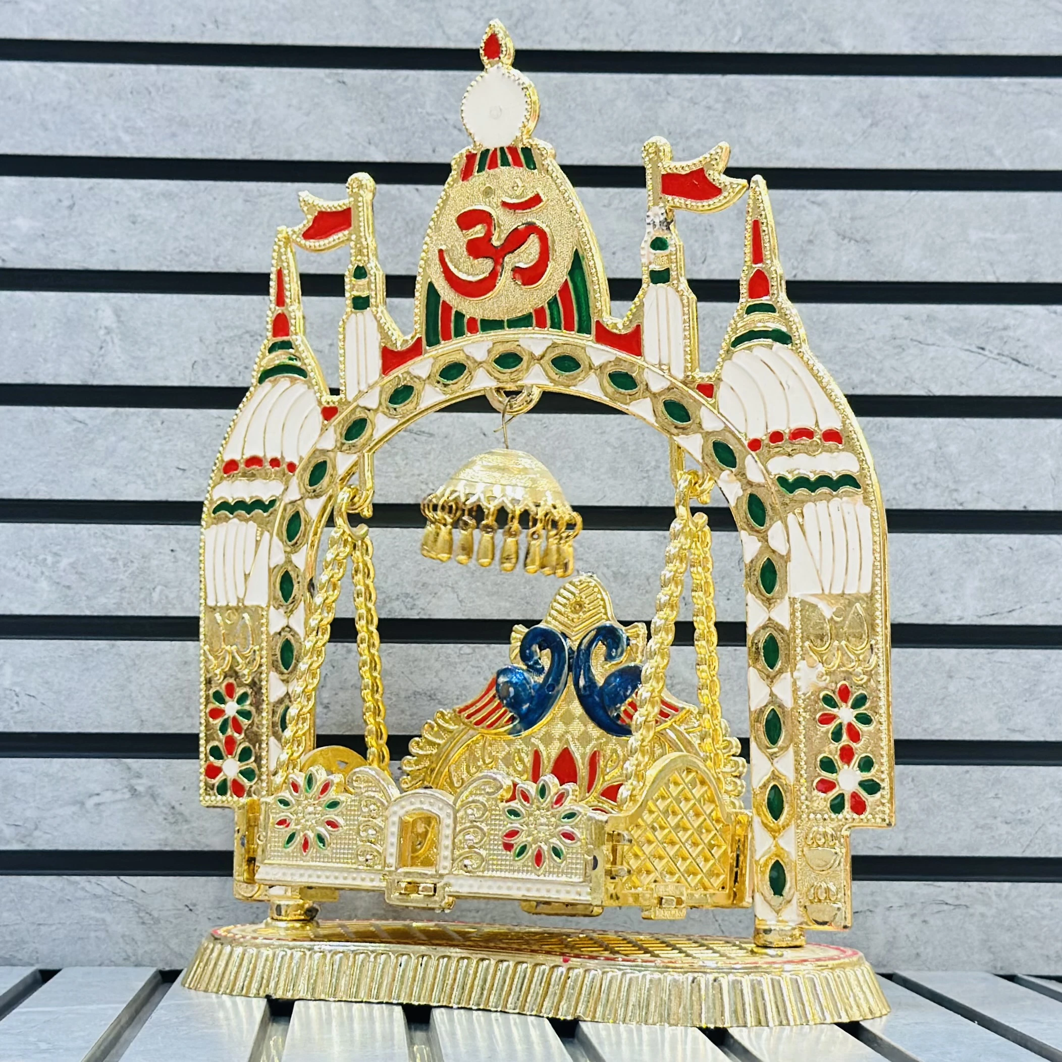 πŸ‘‰ Theme :-  decorative, gold-toned Rajwadi Jhula (royal swing) often used for religious idols or home decor.