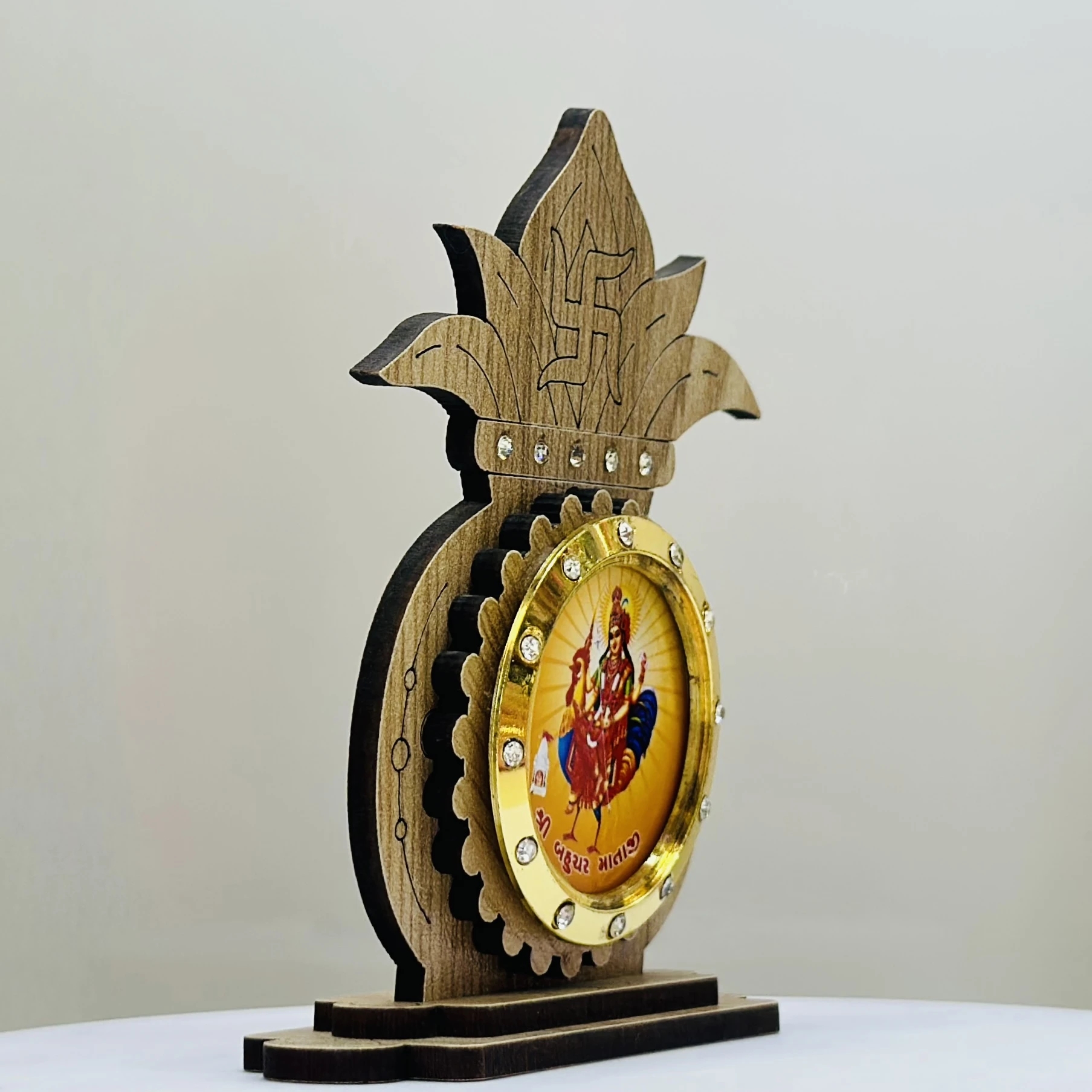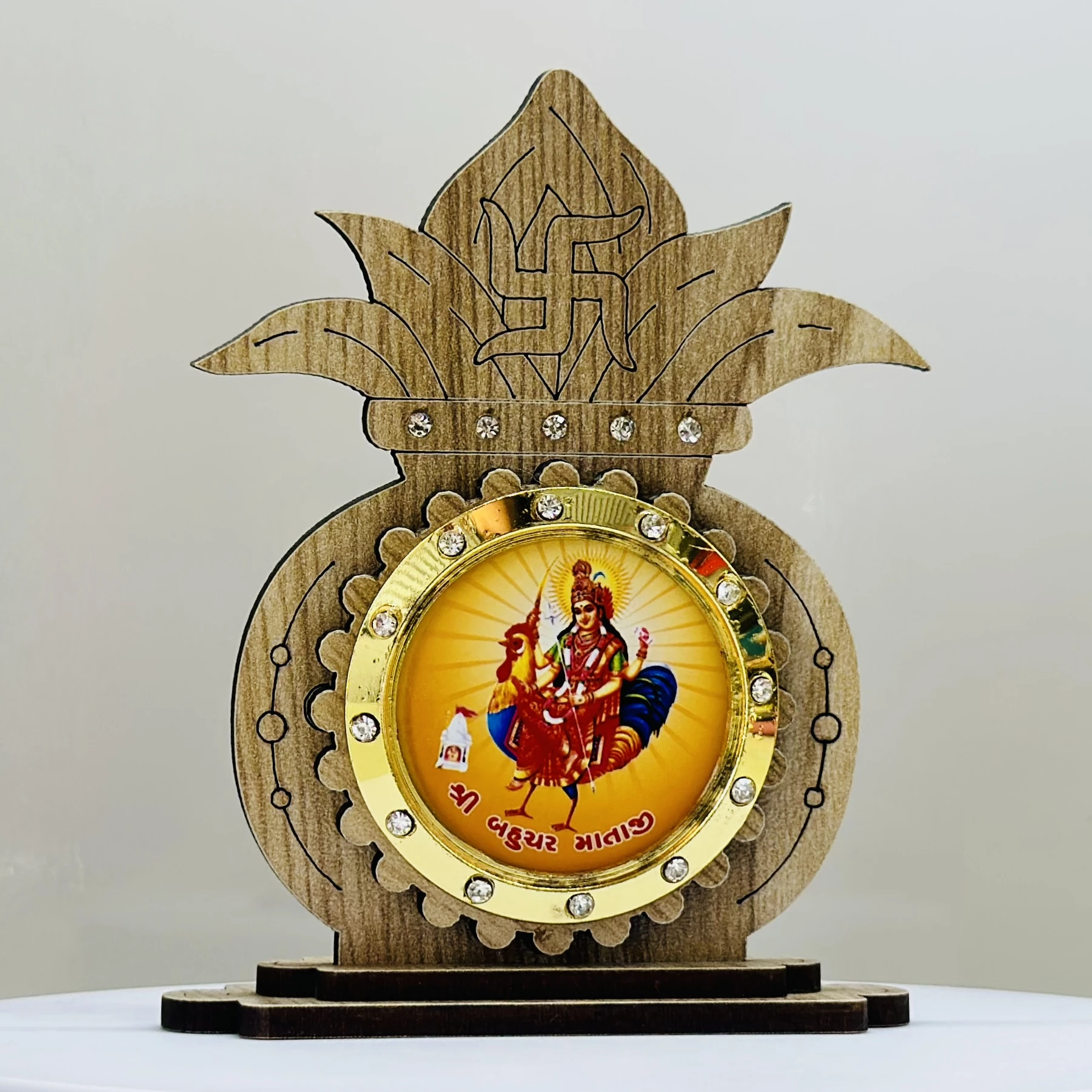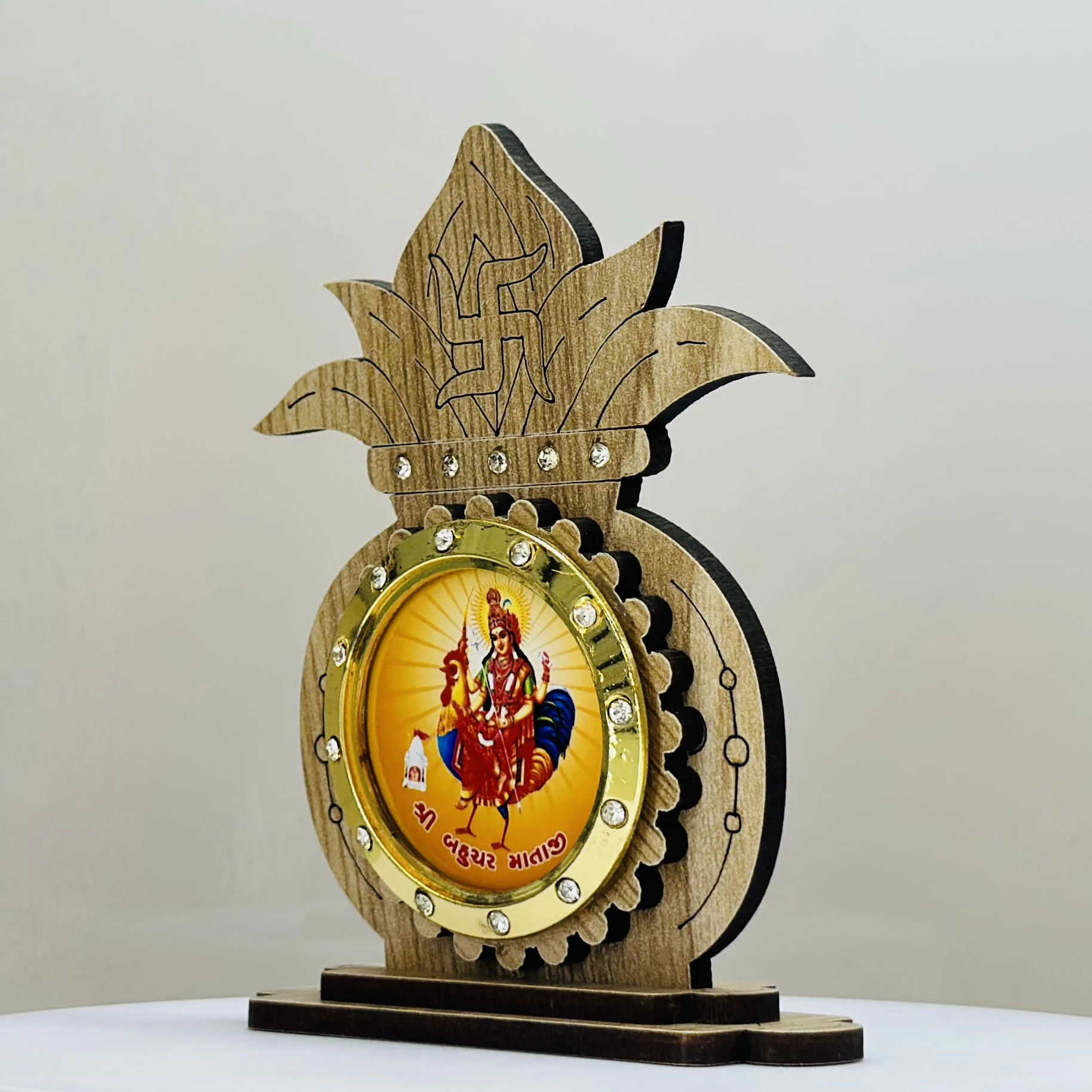 👉 Theme :- wooden showpiece featuring the Hindu deity Bahuchar Mata