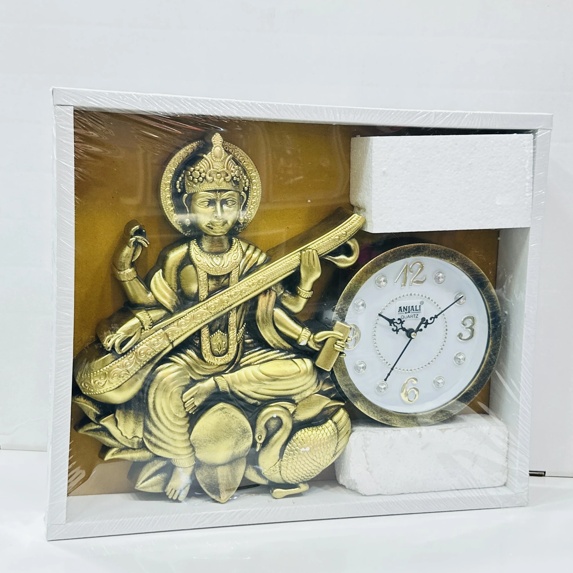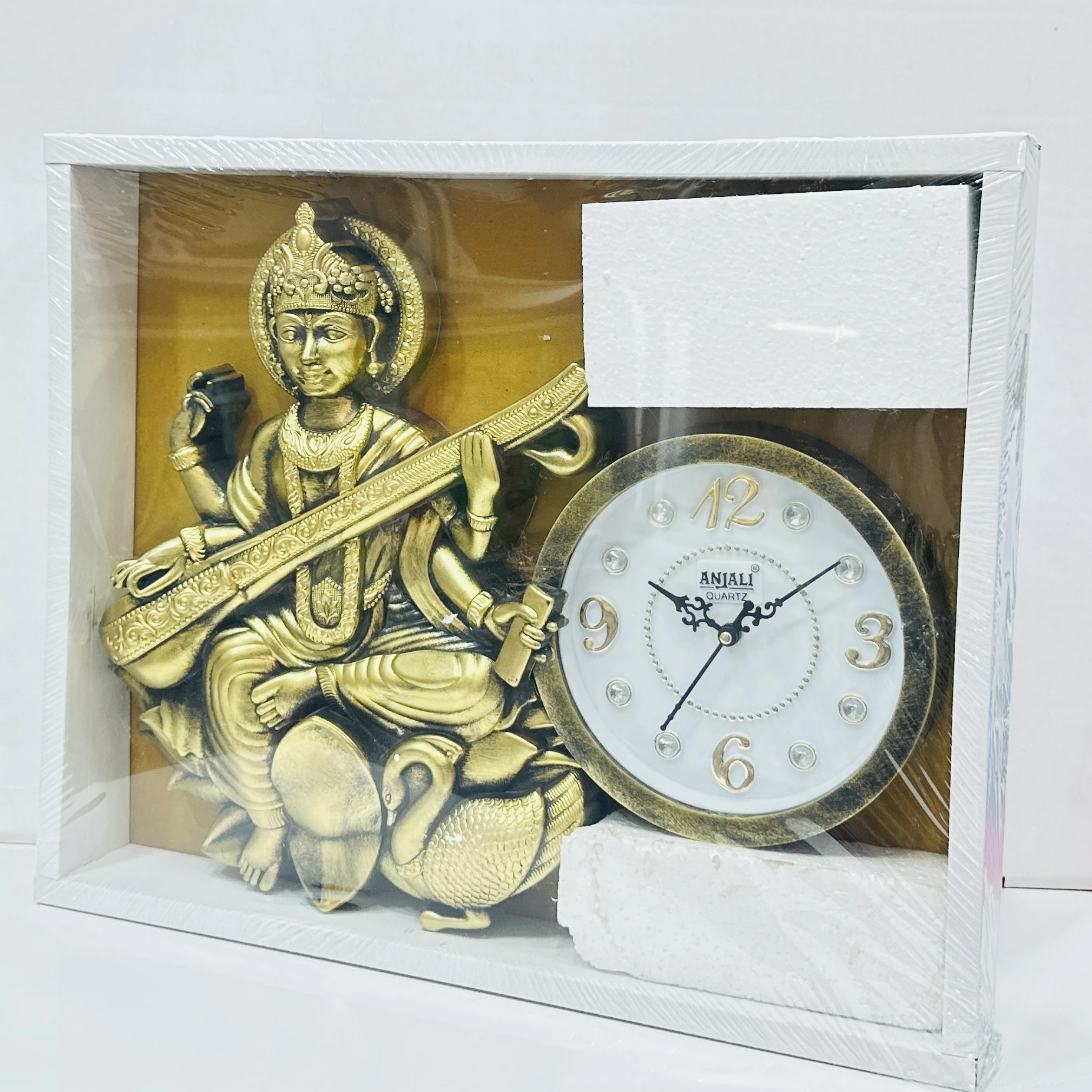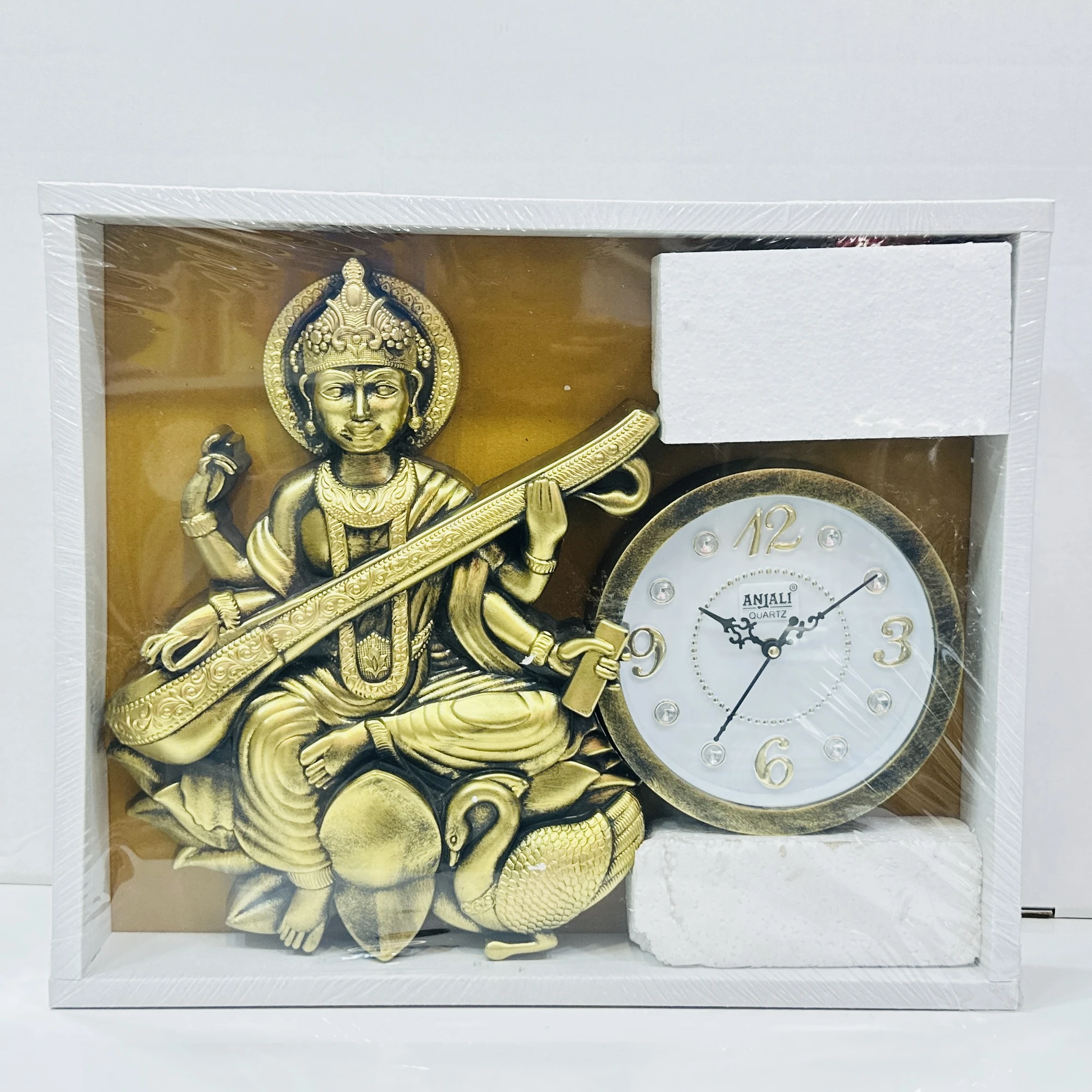 👉 Theme :- ANJALI Quartz analog wall clock, featuring a decorative Saraswati Maa design as part of the frame.