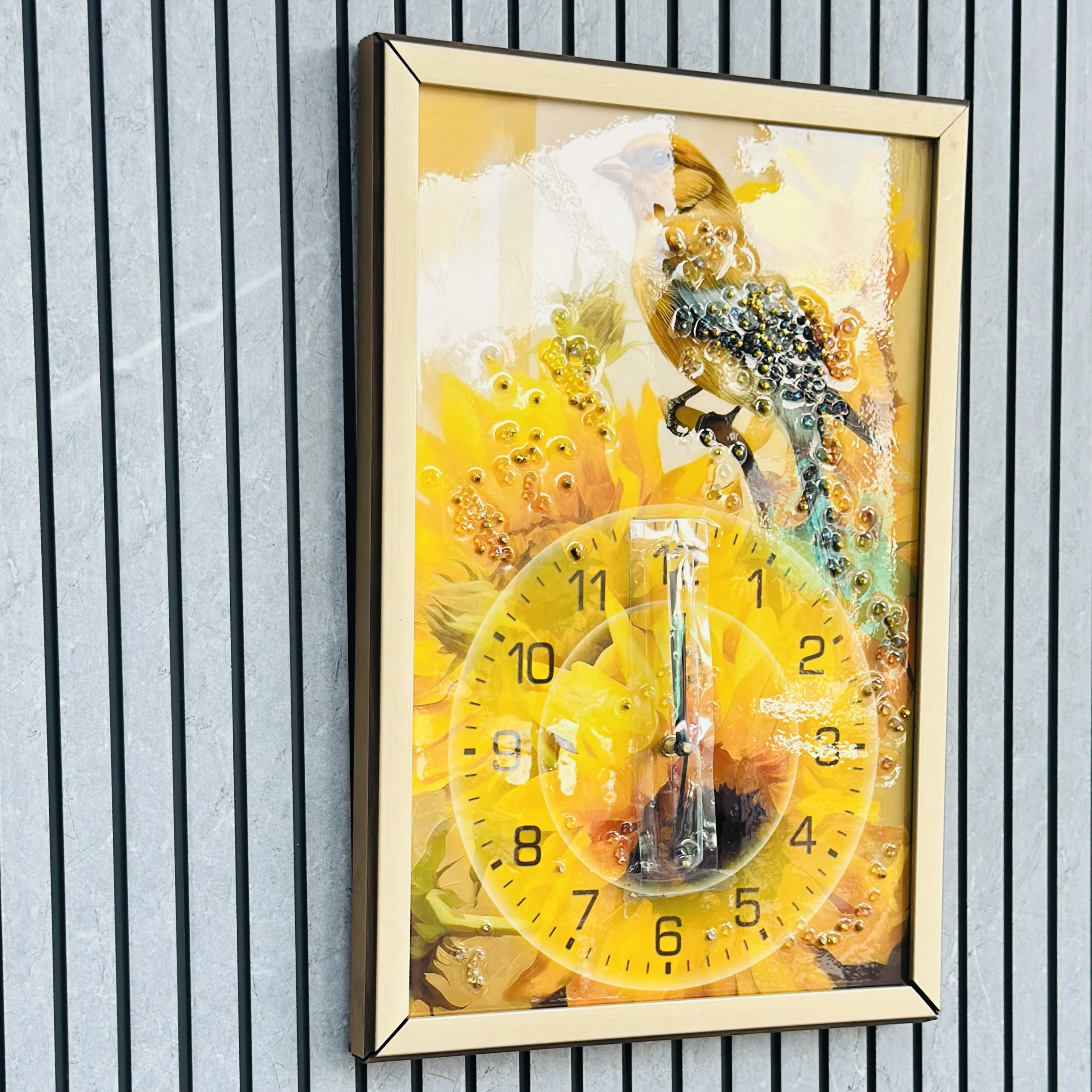 👉 Theme :- decorative wall clock featuring a yellow bird and sunflowers