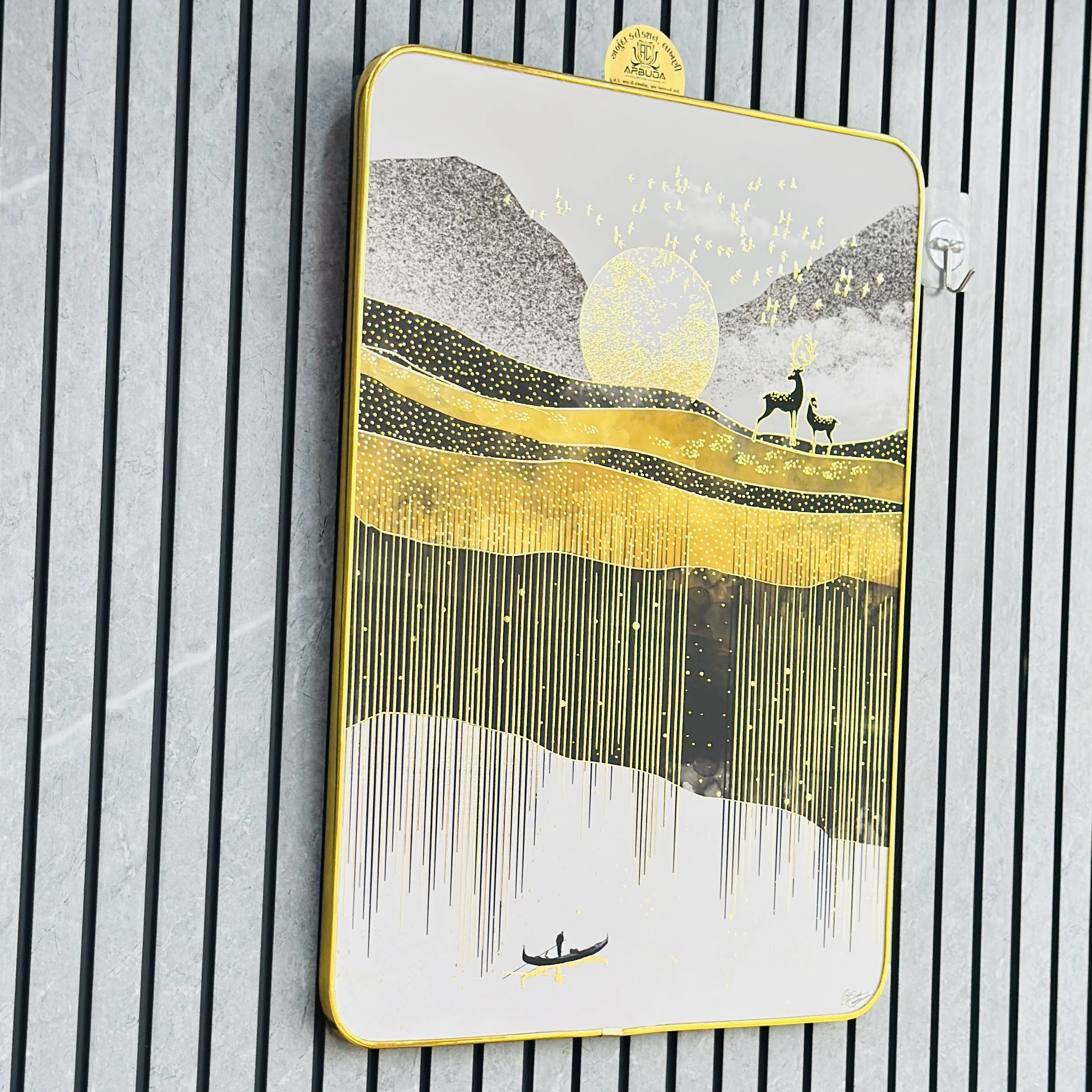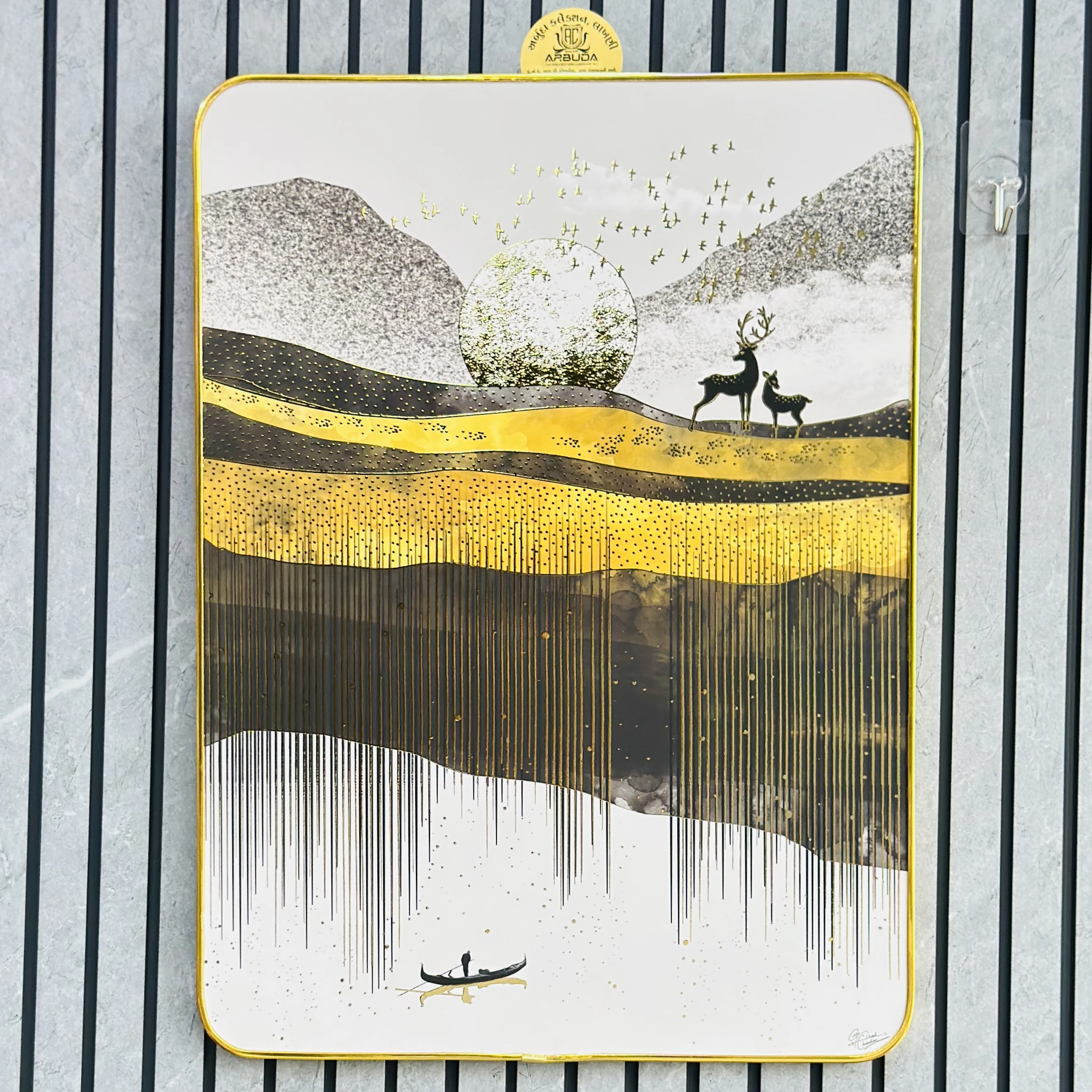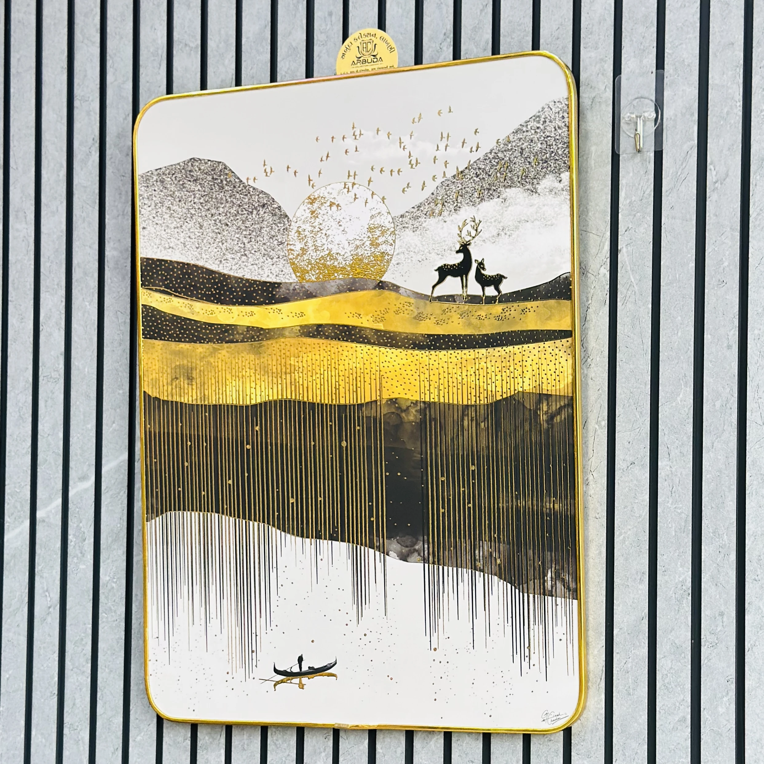 👉 Theme :- Modern abstract art with a nature theme, often featuring a golden deer in a mountain or forest setting.