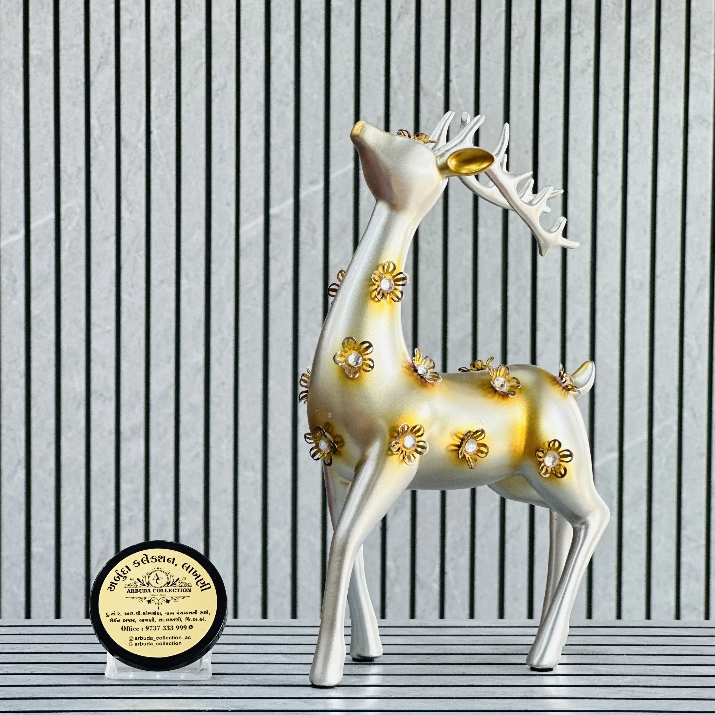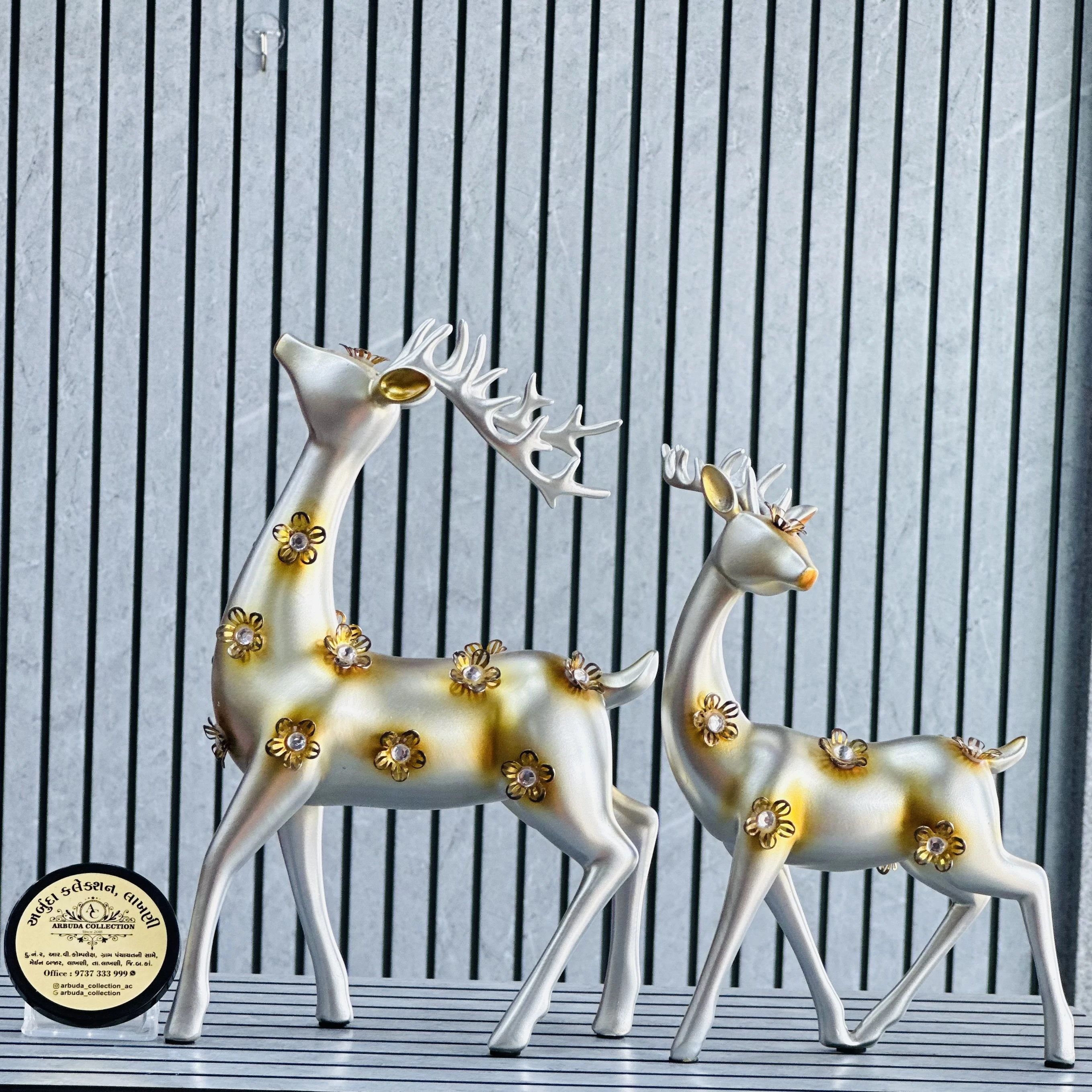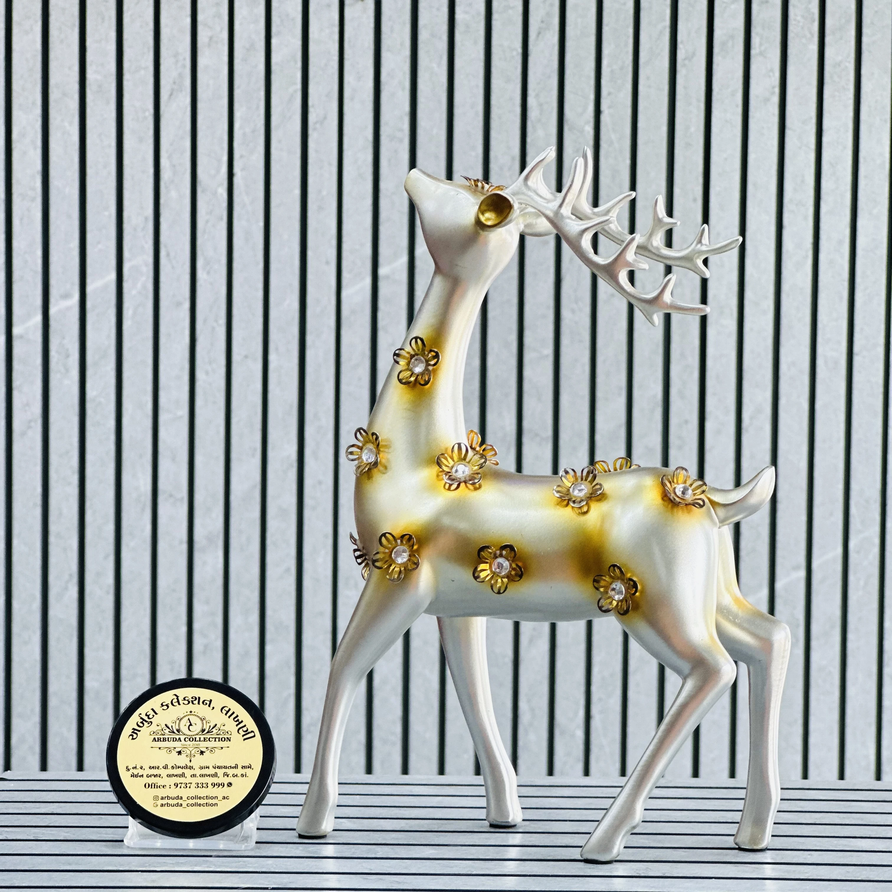 *✅ ARBUDA COLLECTION ✅* *✅9737333999✅* Theme :- Deer Resin statues Brand :- arbuda collection lakhani Colour:- silver Style:- Designer Fancy look Material:- decorative sculptures Dimensions :- 8 hight, 6 width Uses :- used for home decoration, suitable for various settings like living rooms, shelves or office desks… Cleaning:- wipe clean with a dry cloth Origin:- made in India by local artists Other words:- limited addition…