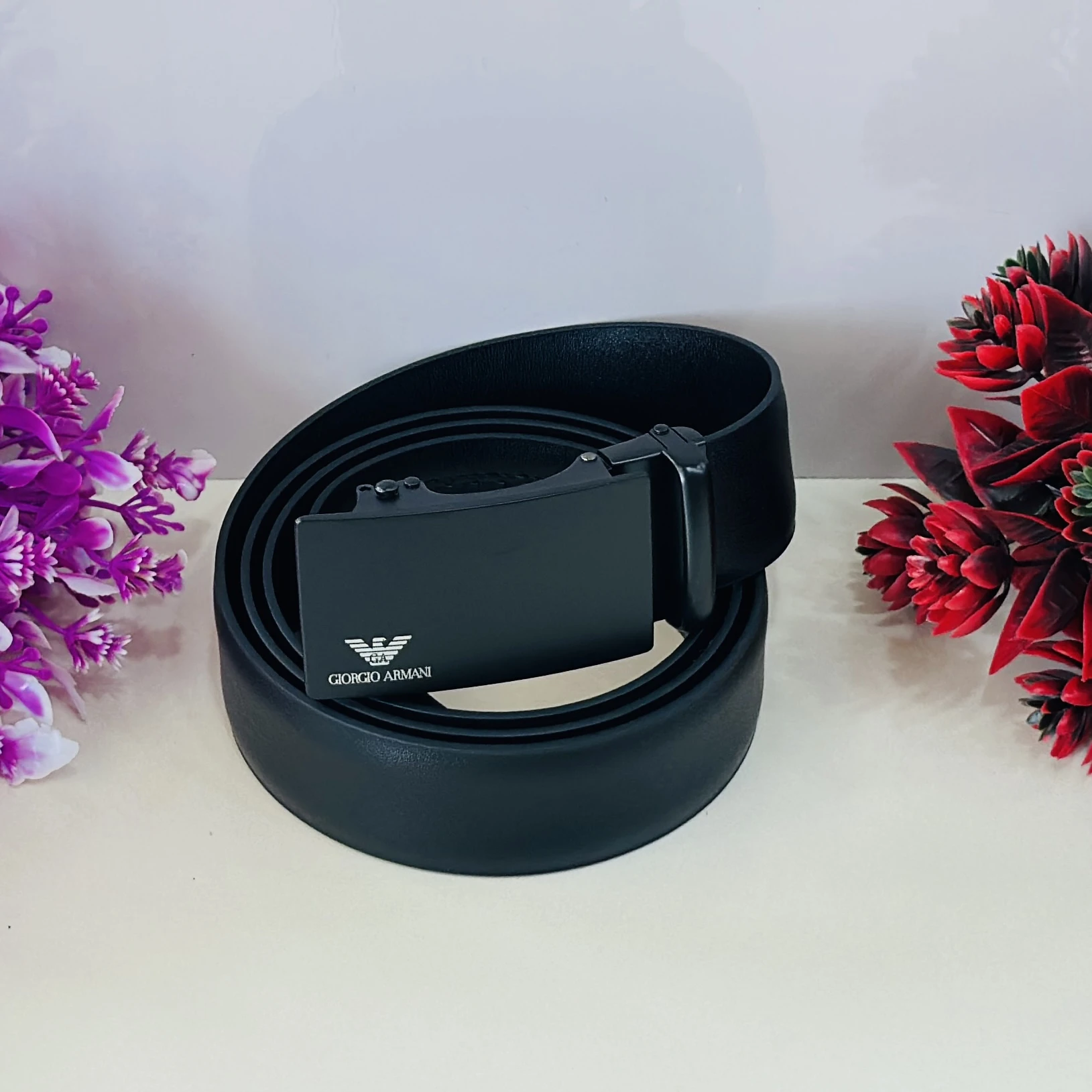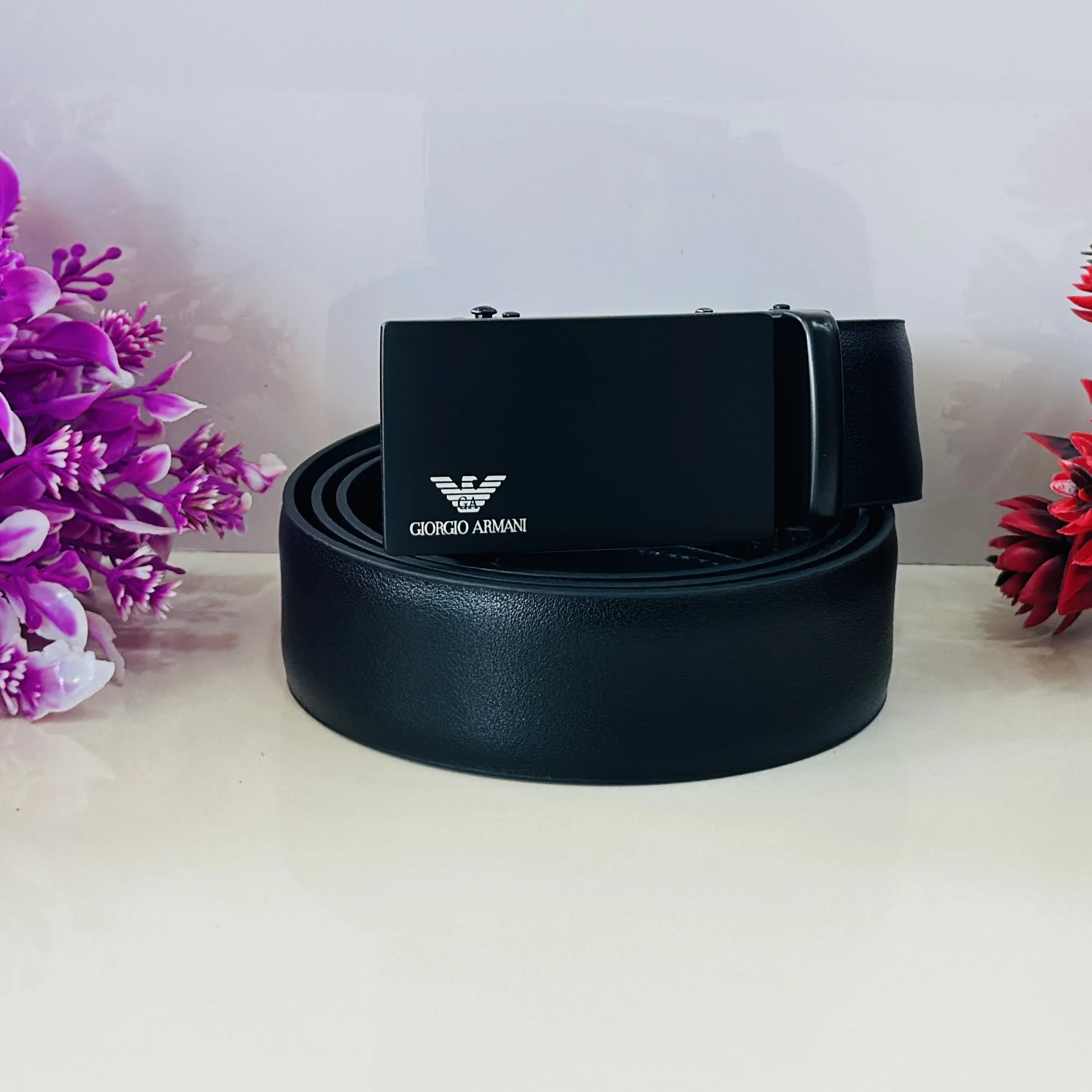 👉 Theme :- Emporio Armani black leather belt with a logo plaque buckle.