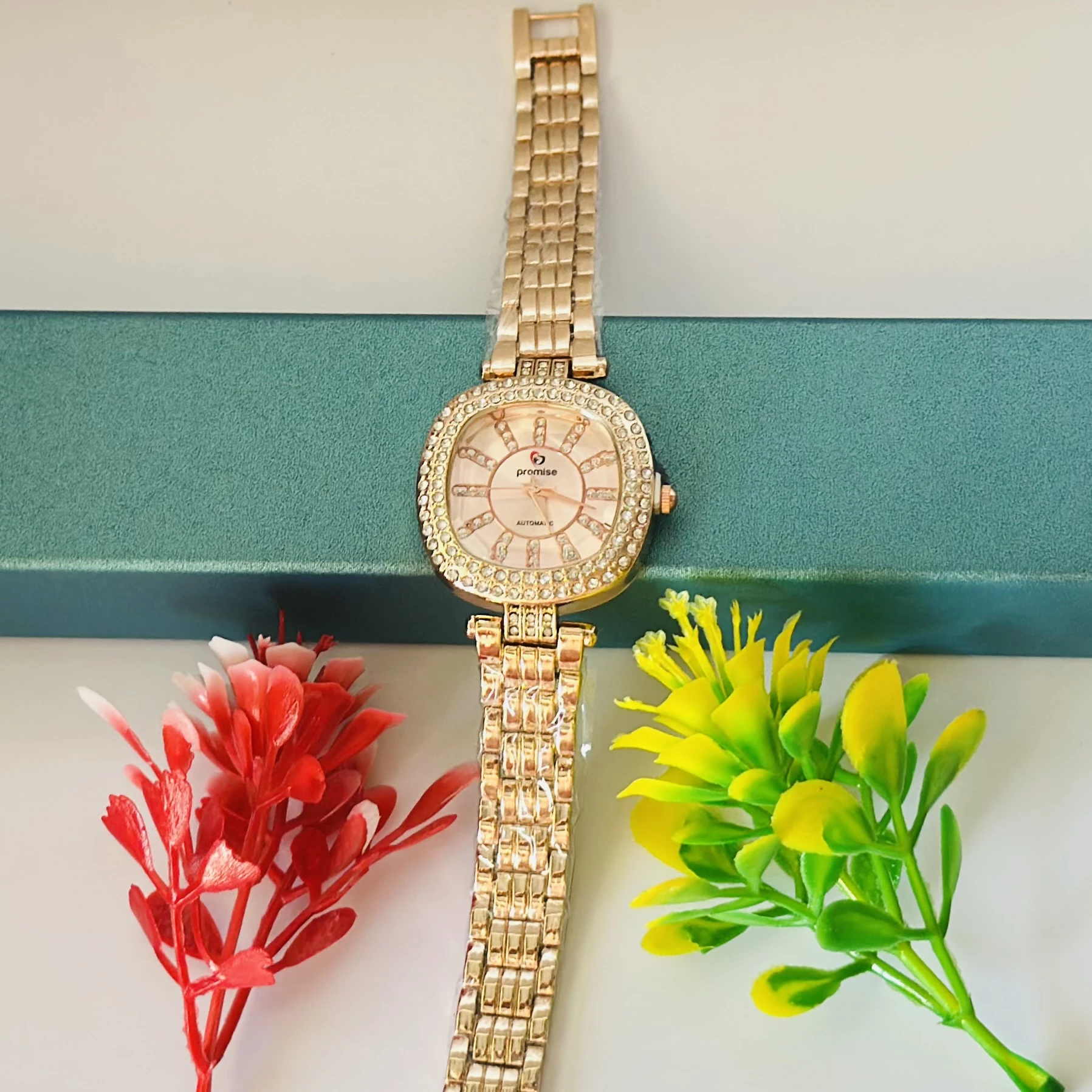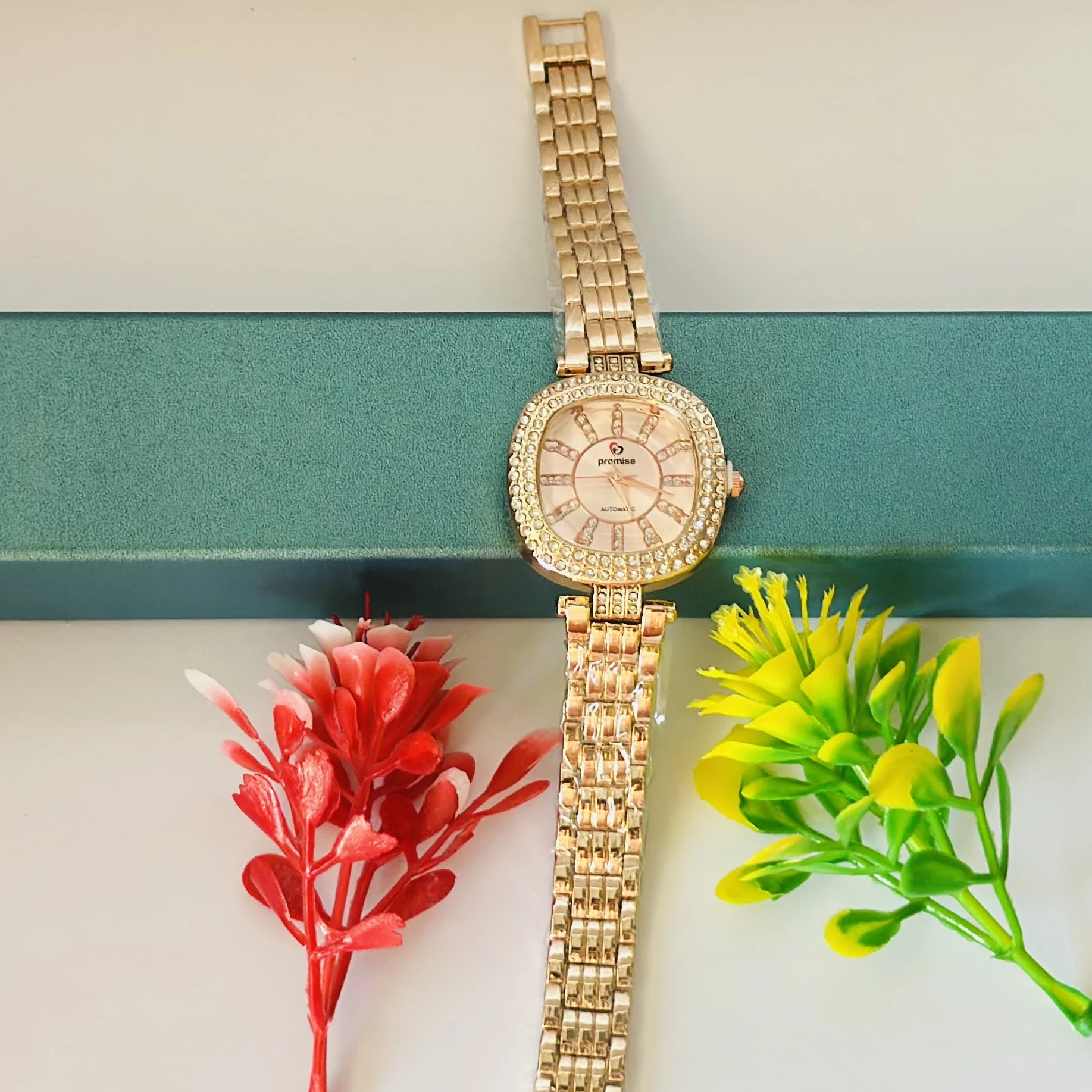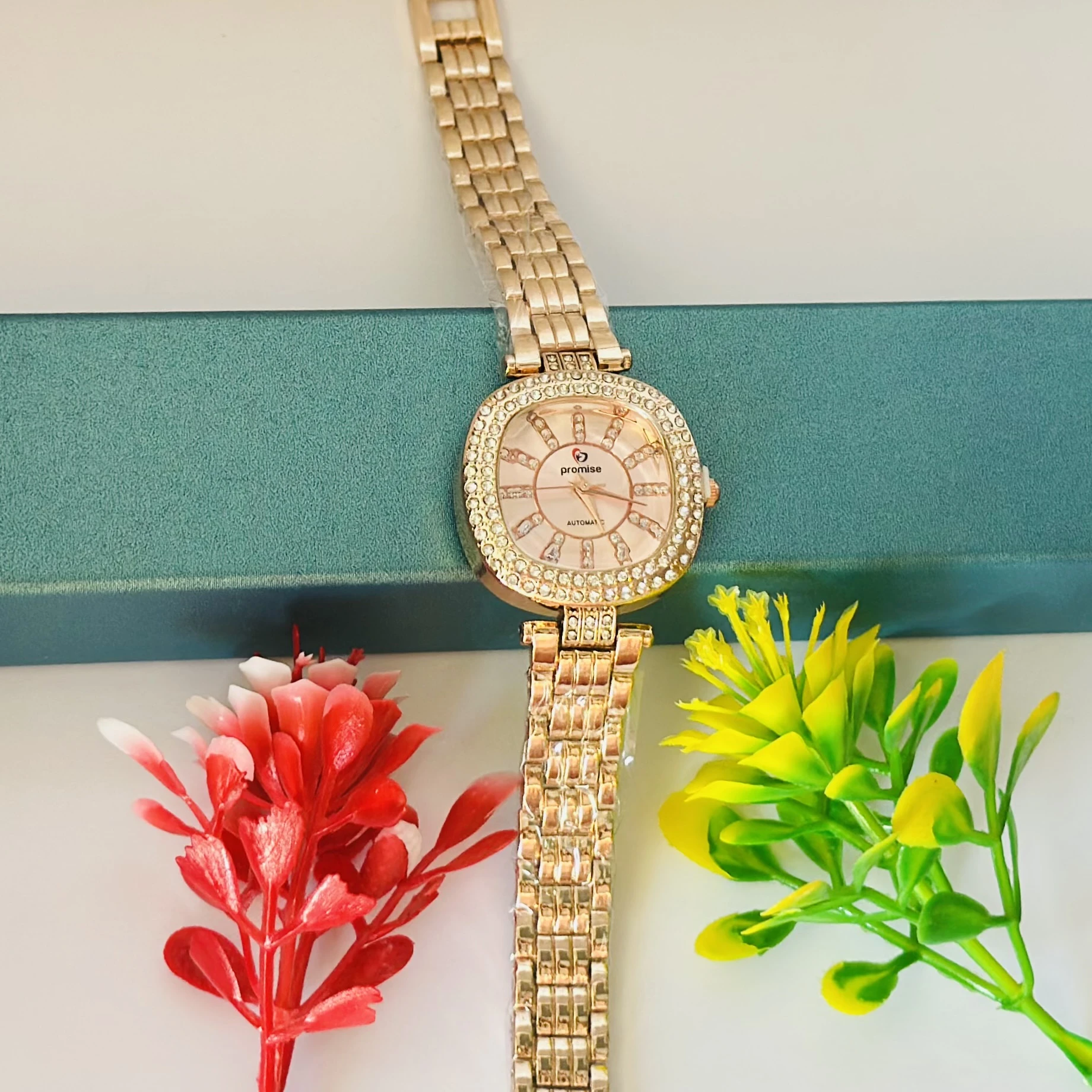 👉 Theme :- ladies' quartz watch with a gold-tone crystal bracelet.