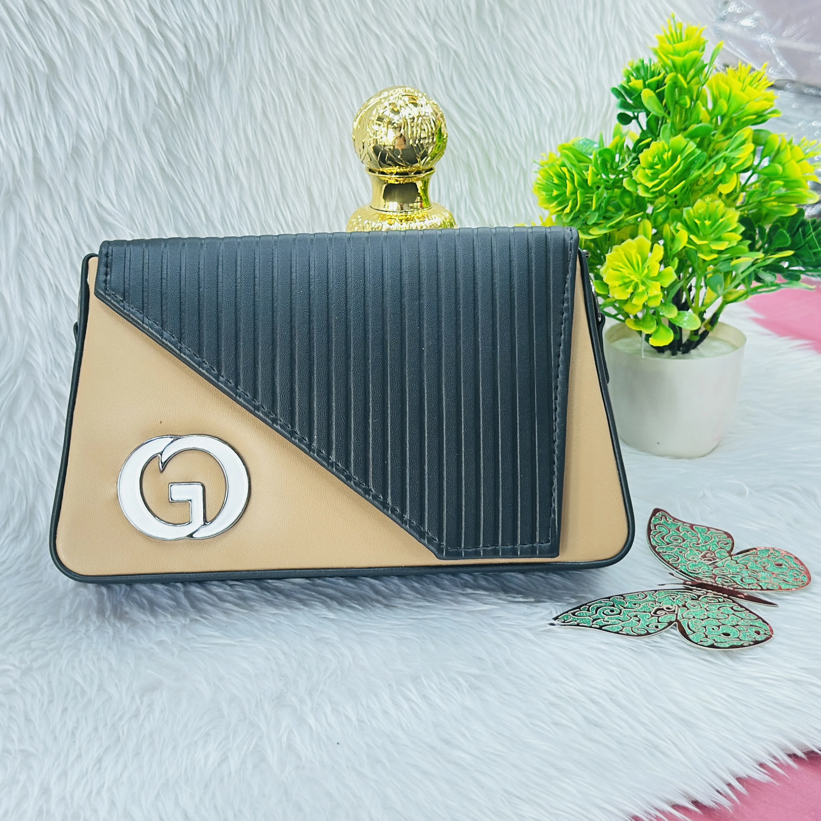 fashionable handbag features a beige and dark grey color-blocked design