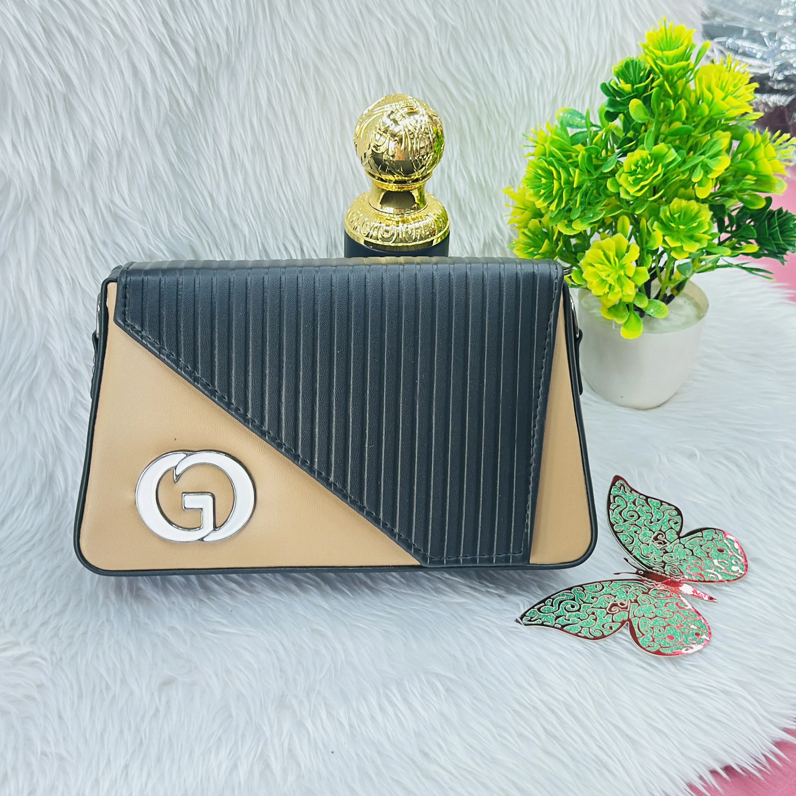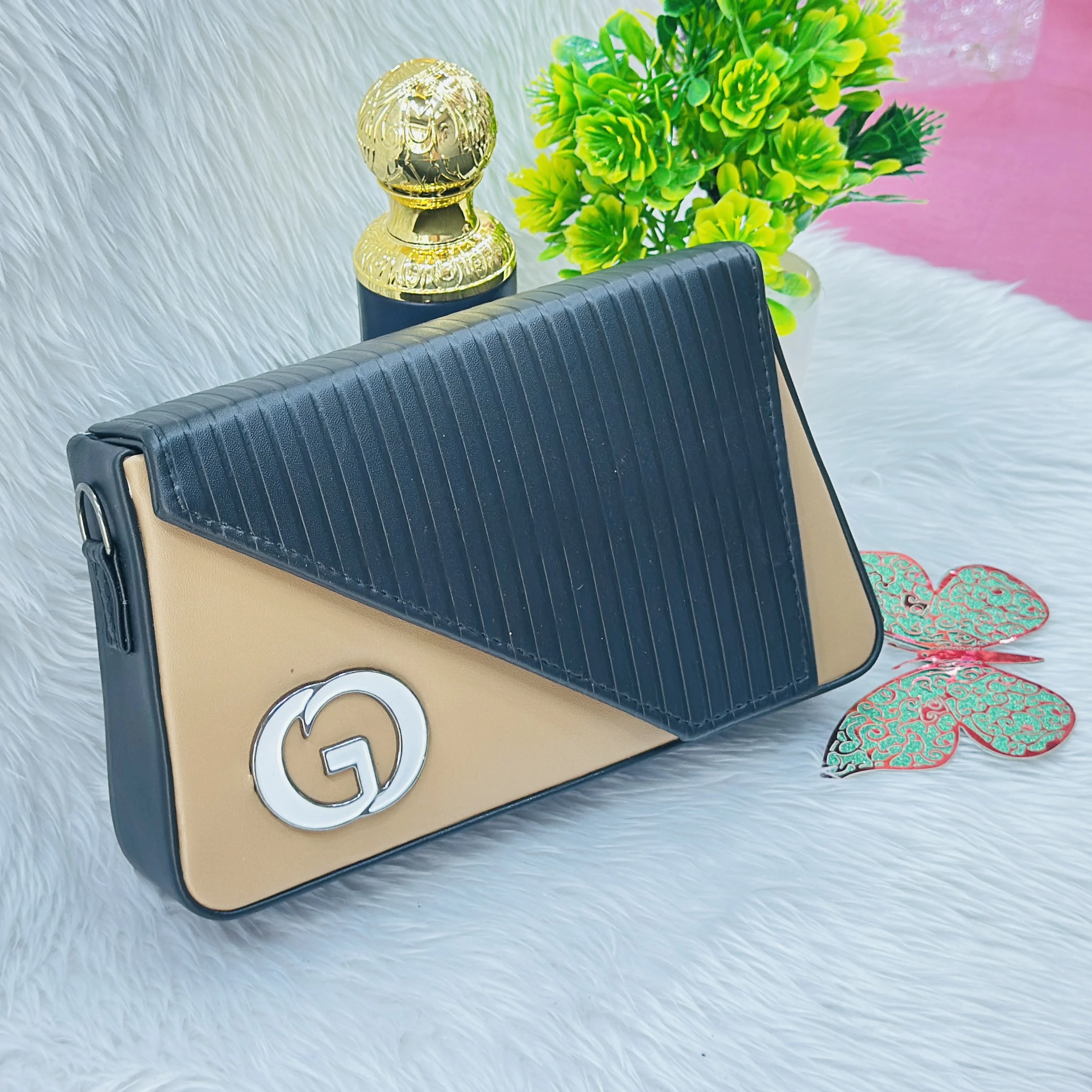 👉 Theme :- a beige women's crossbody sling bag featuring a textured finish and a patterned strap