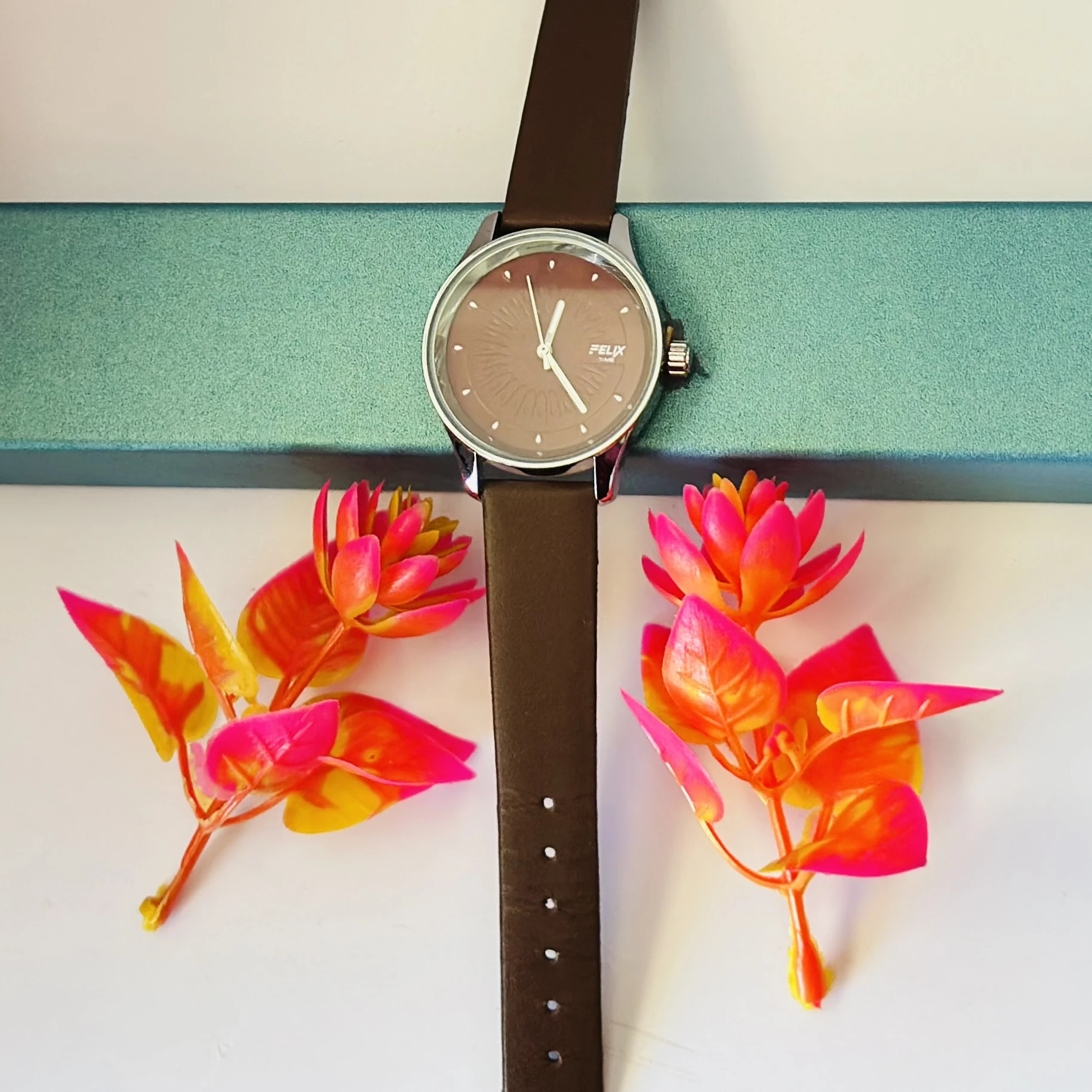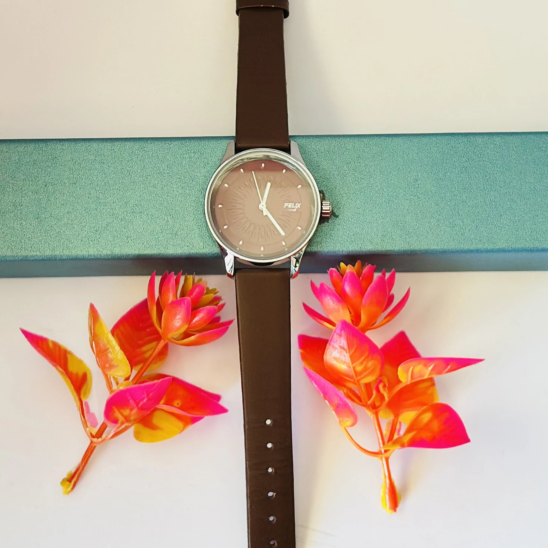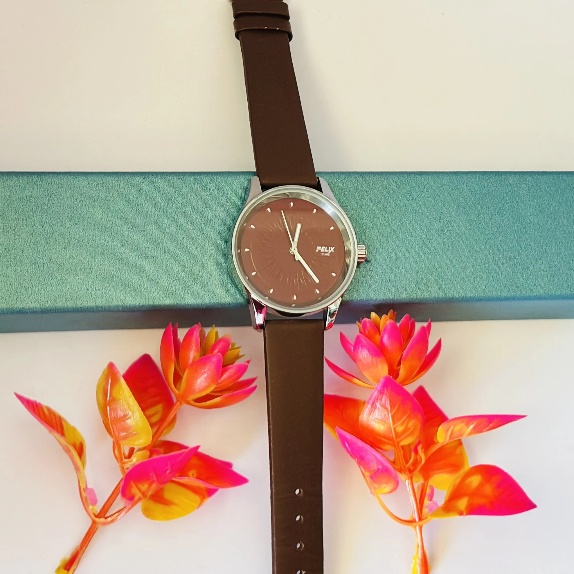 👉 Theme :- Felix women's analog watch with a brown leather strap and a textured dial.