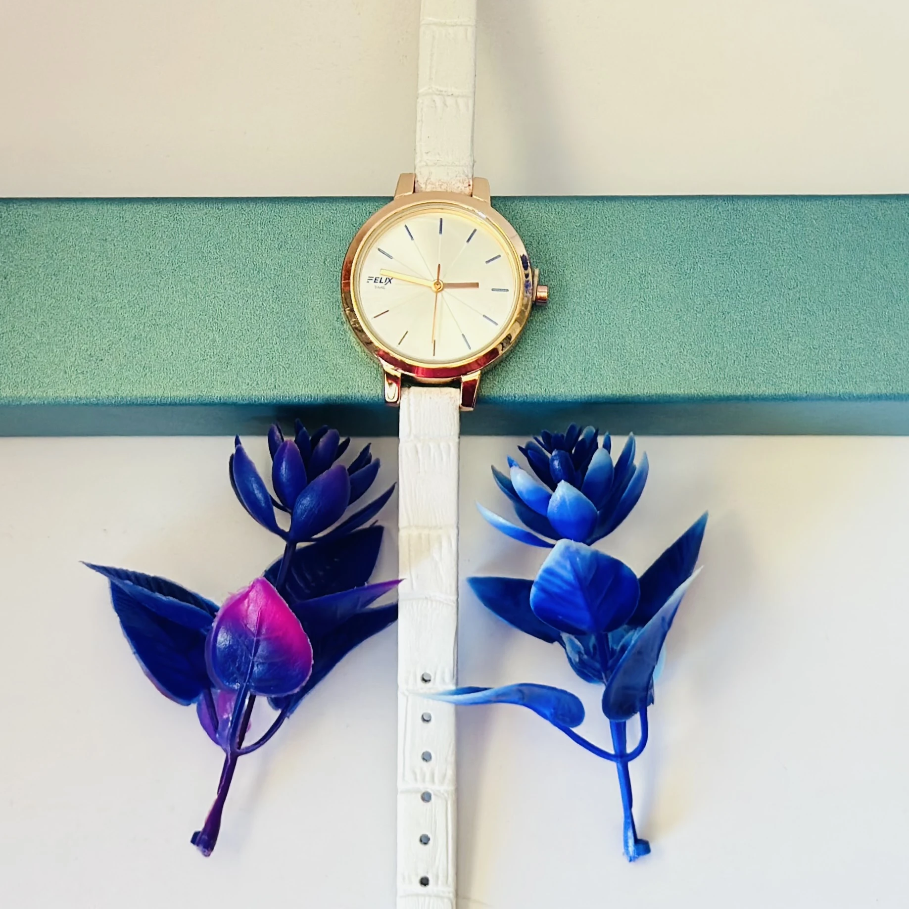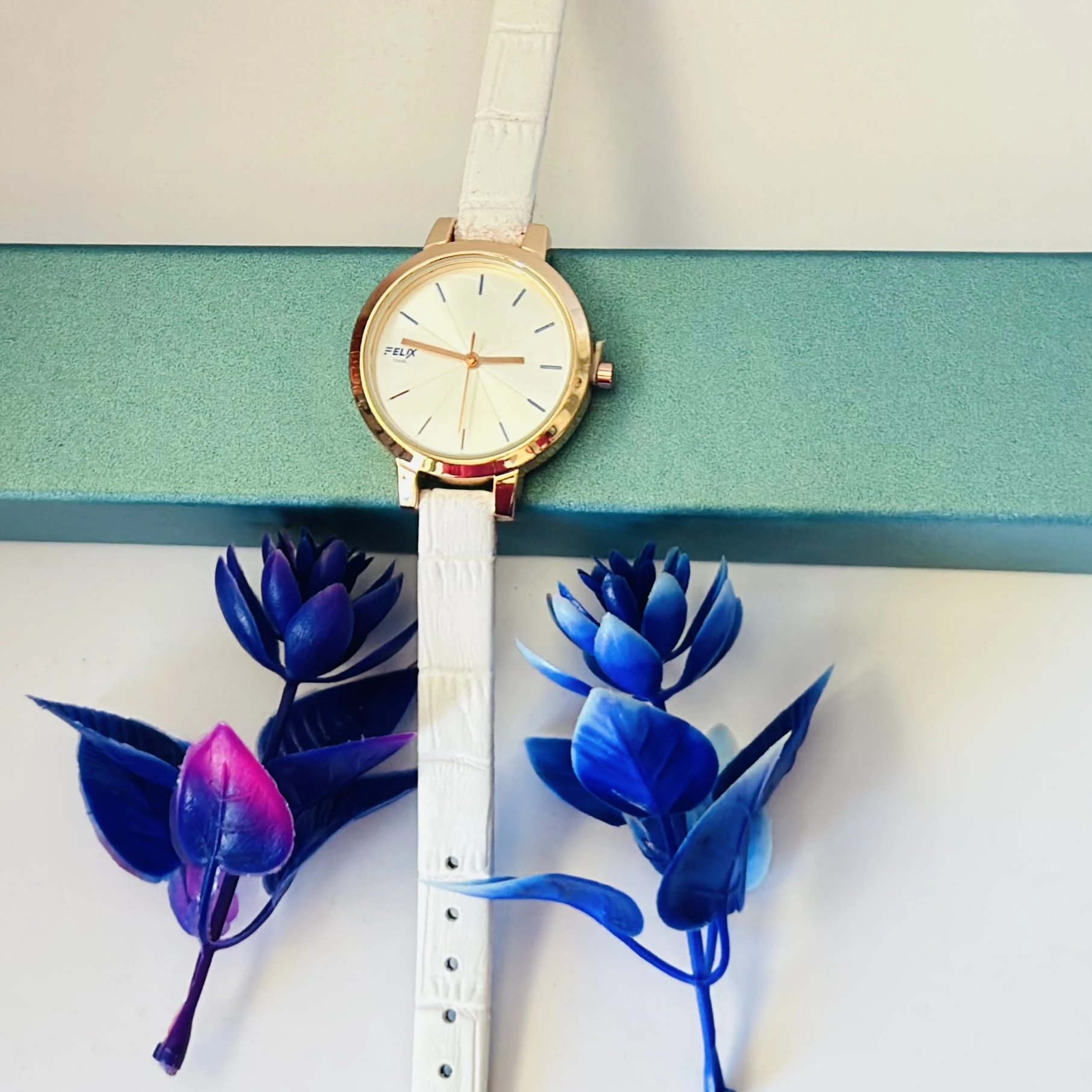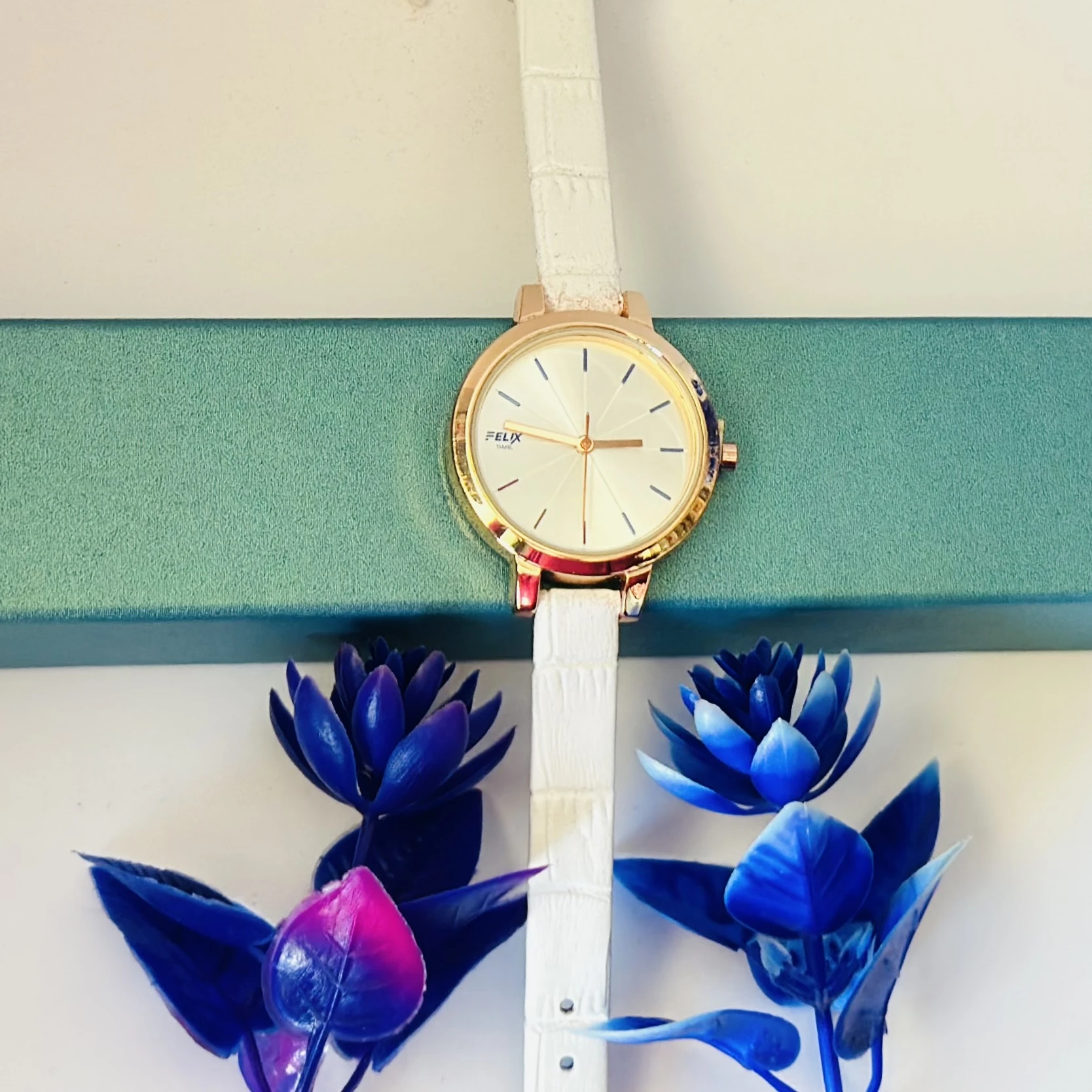 👉 Theme :- Felix women's analog watch with a white strap and a rose gold case.