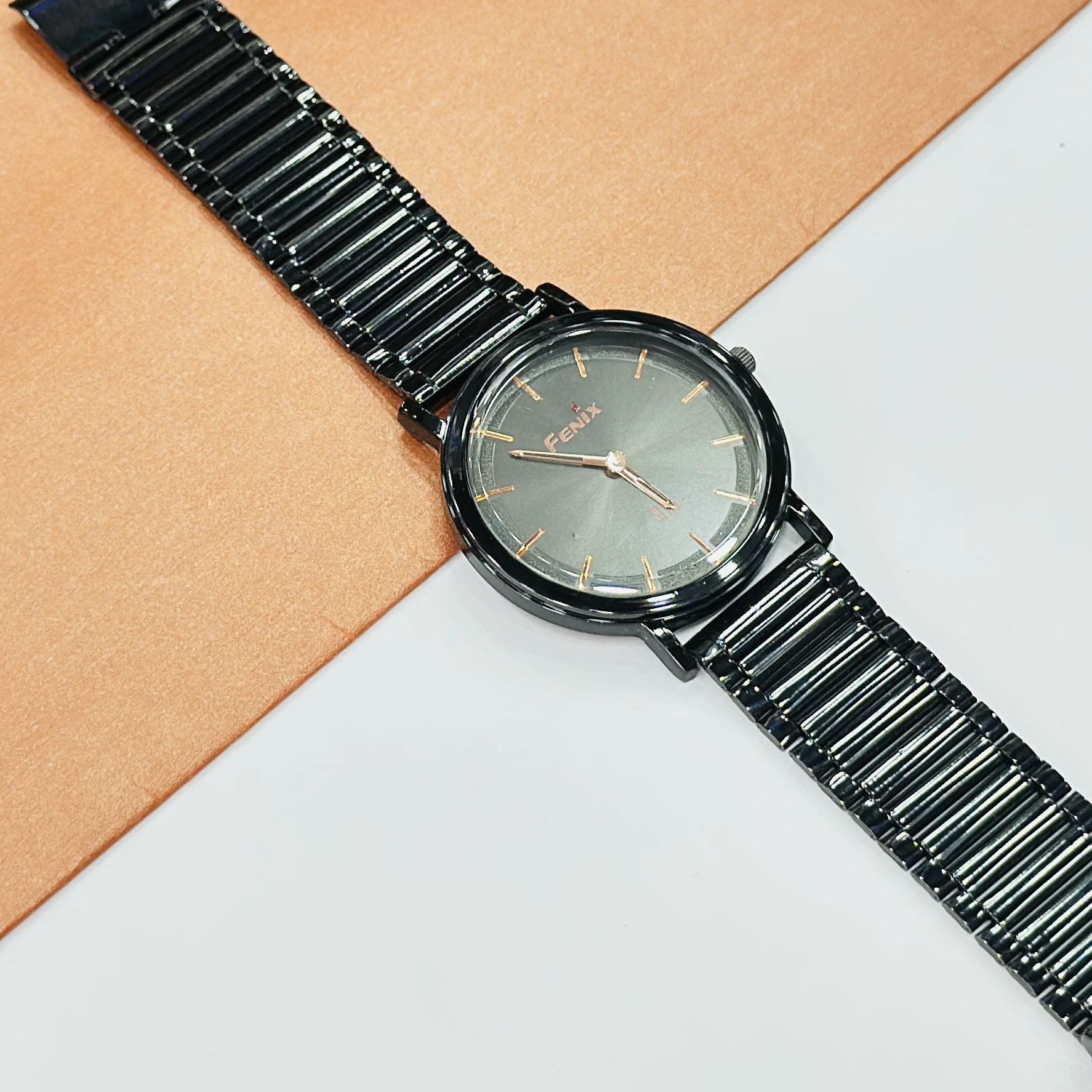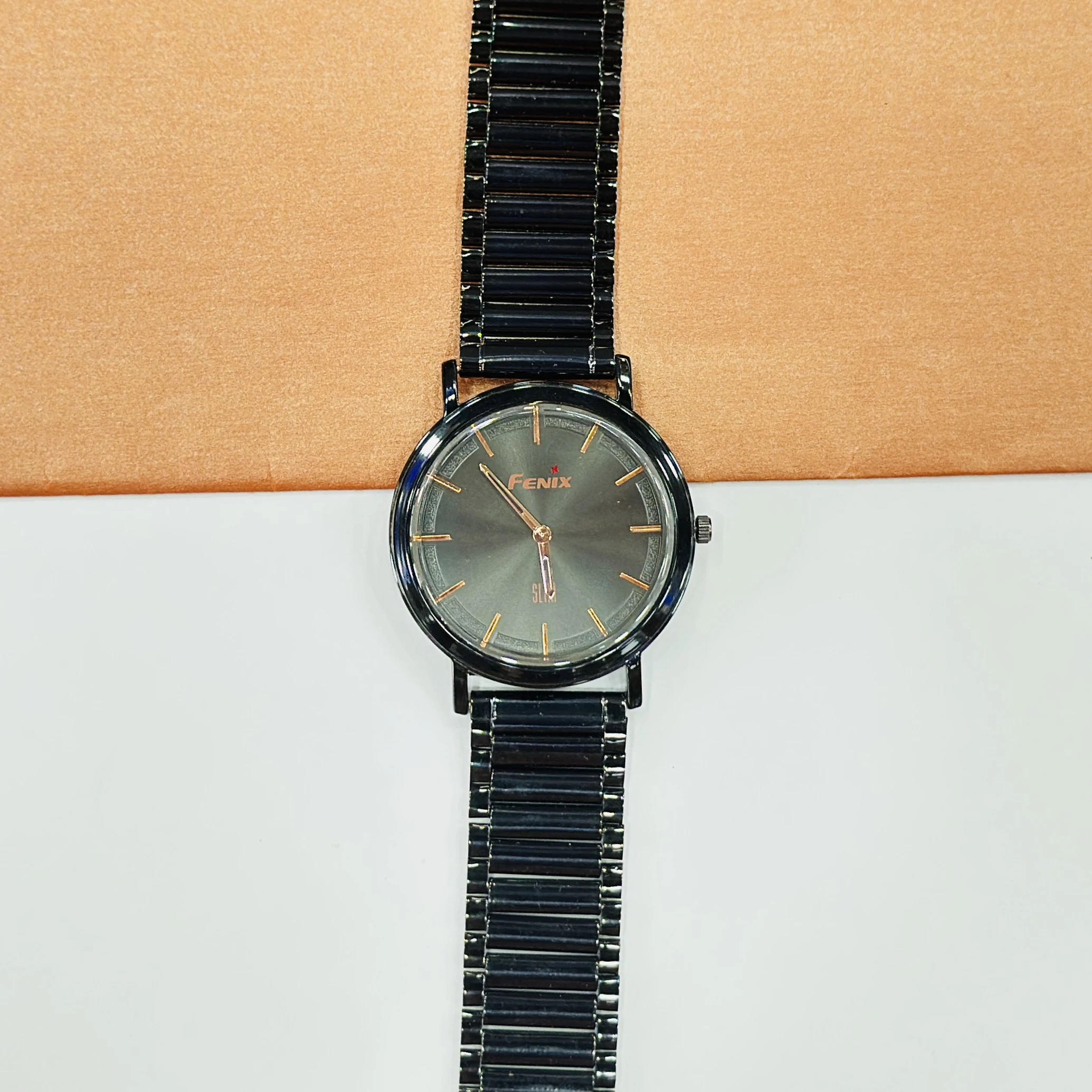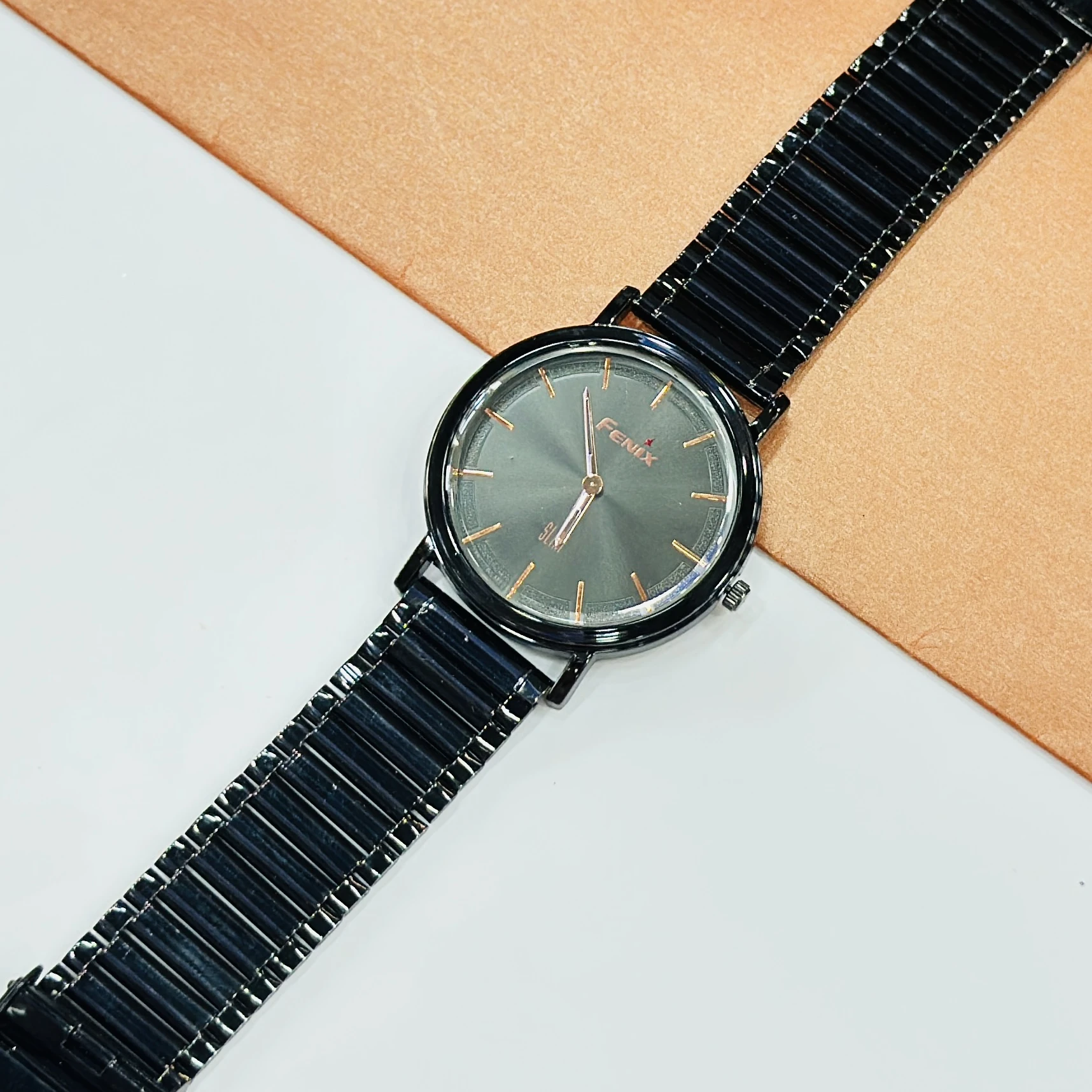 👉 Theme :- Fenix watch features a slim design with a dark gray dial, rose gold accents, and a black stainless steel strap.
