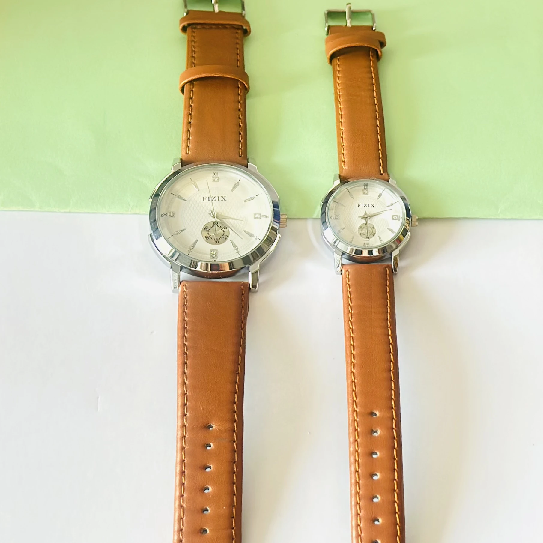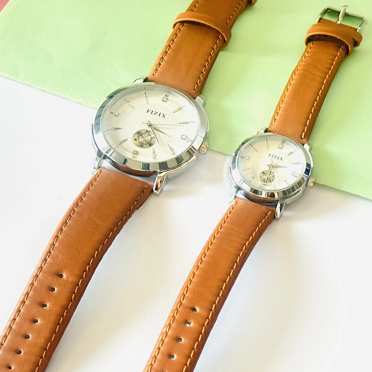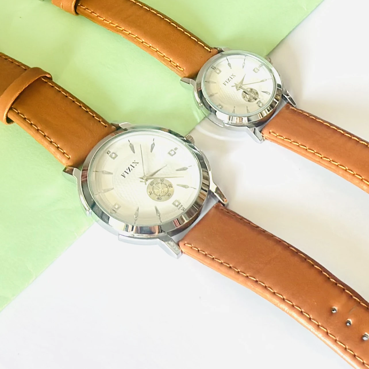 👉 Theme :- FIZIN couple watches with brown leather straps and silver-tone cases.