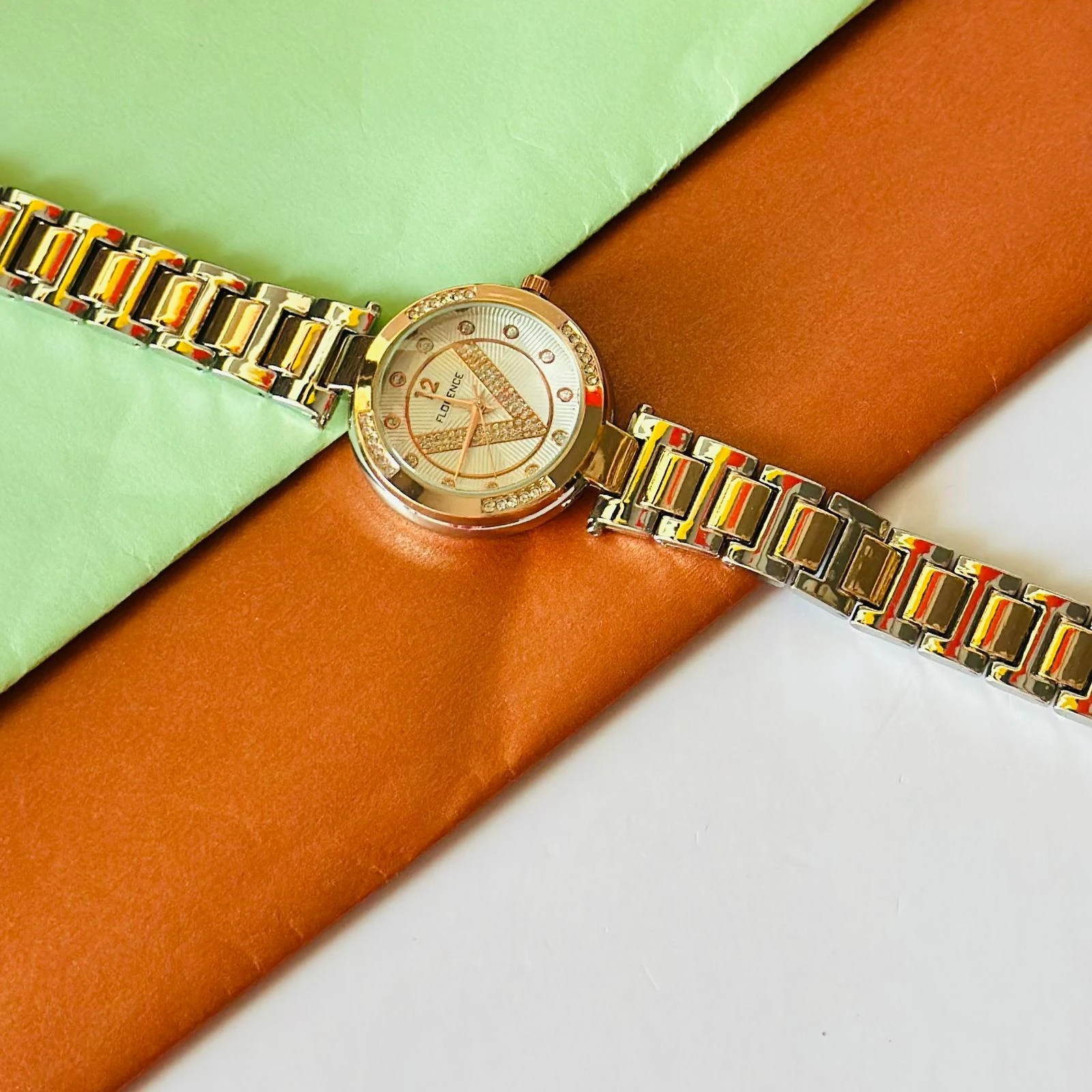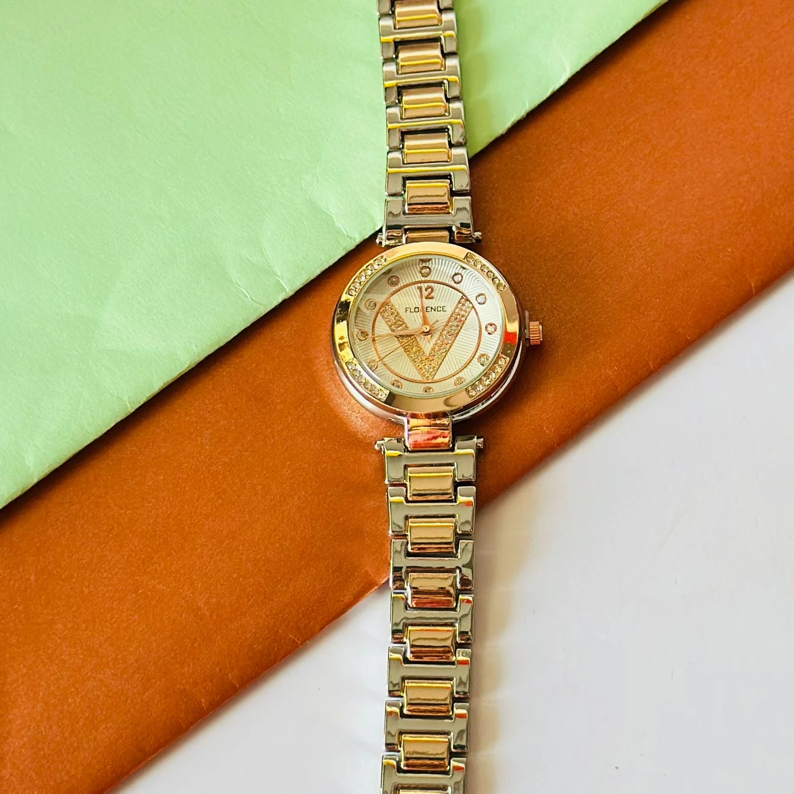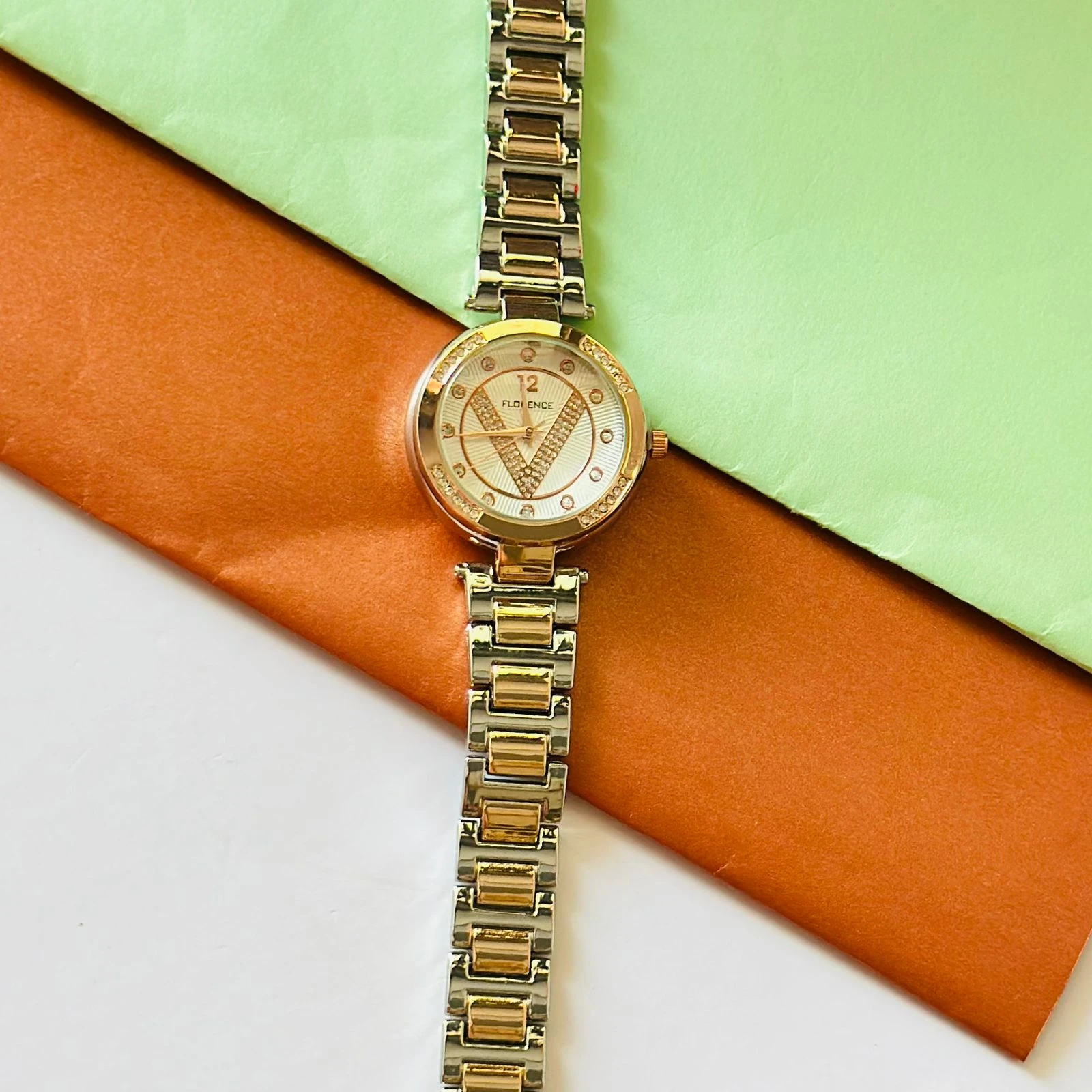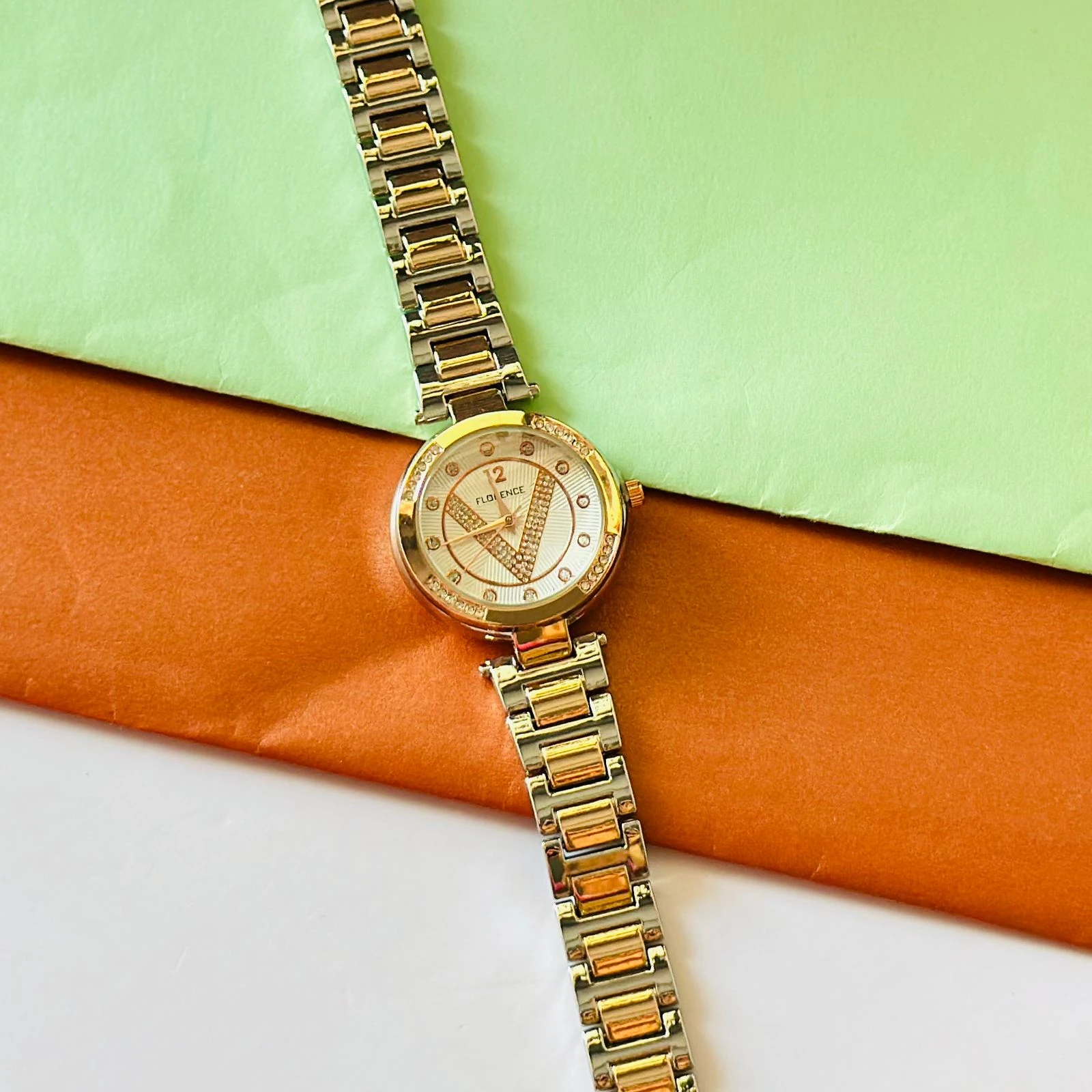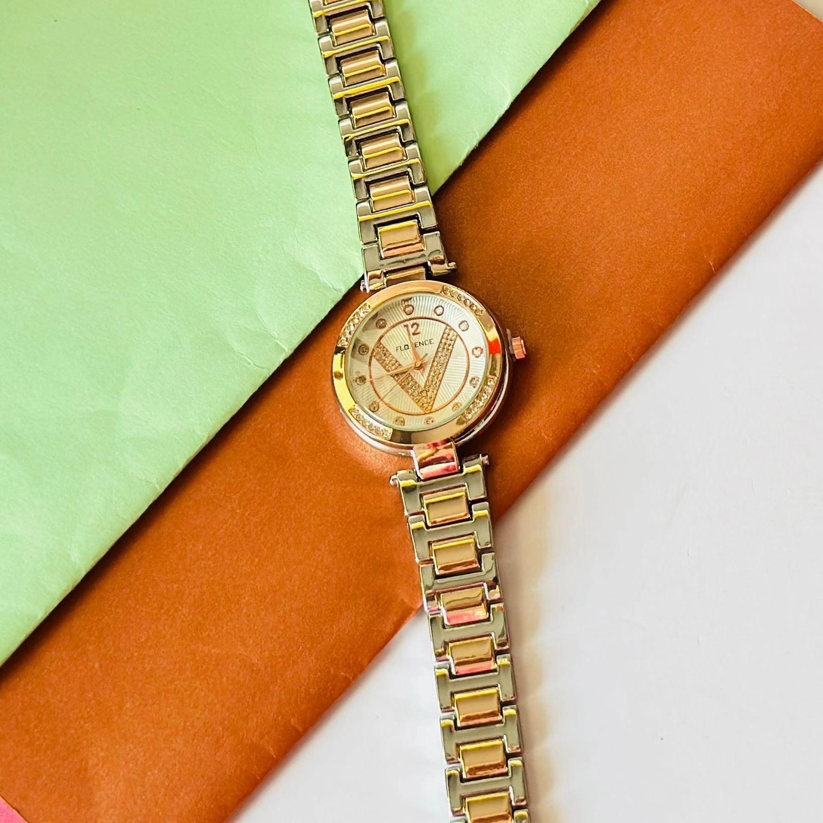 👉 Theme :- Florence brand two-tone metal analog watch for women.
