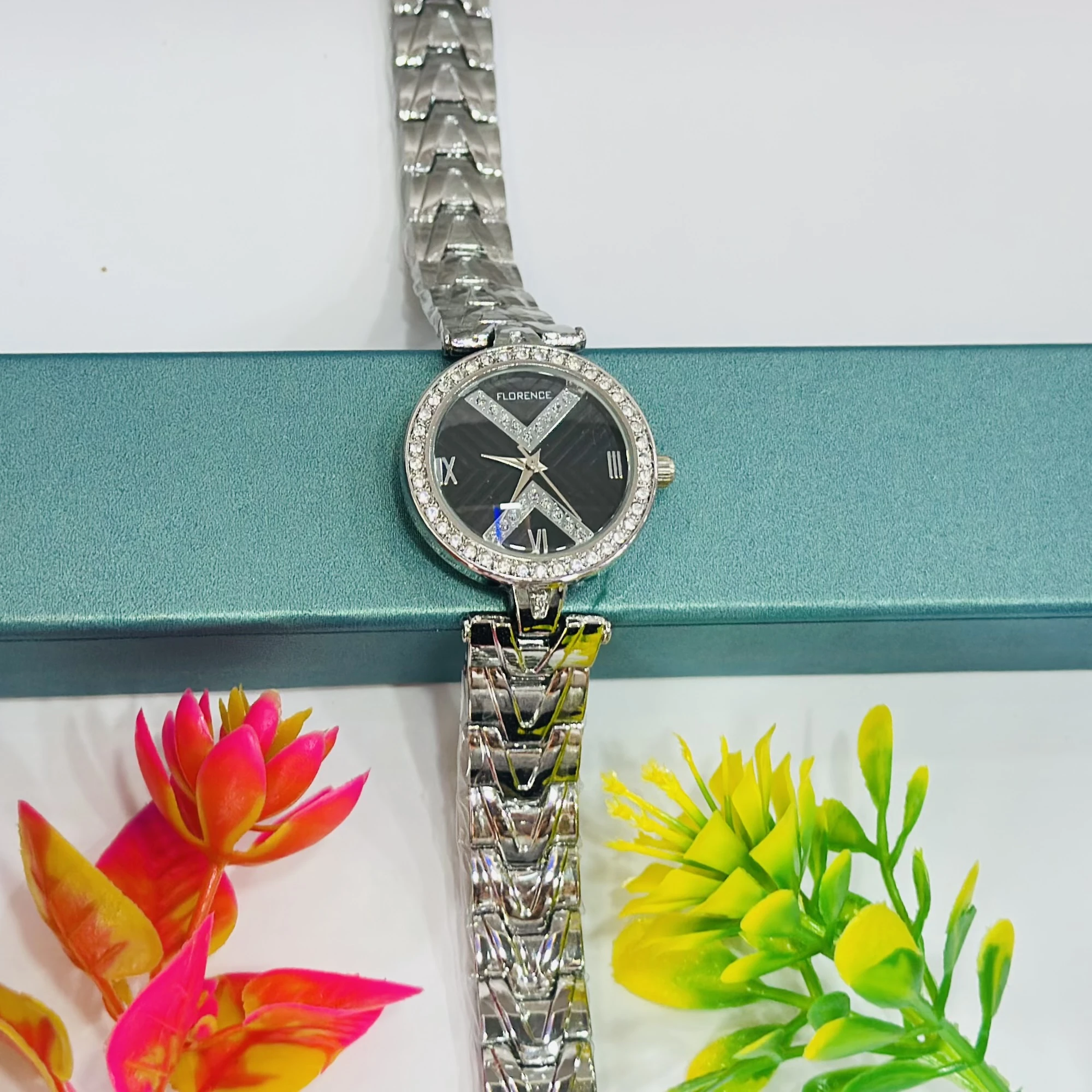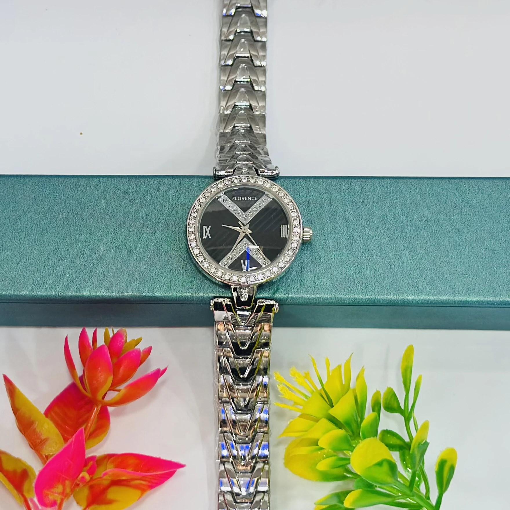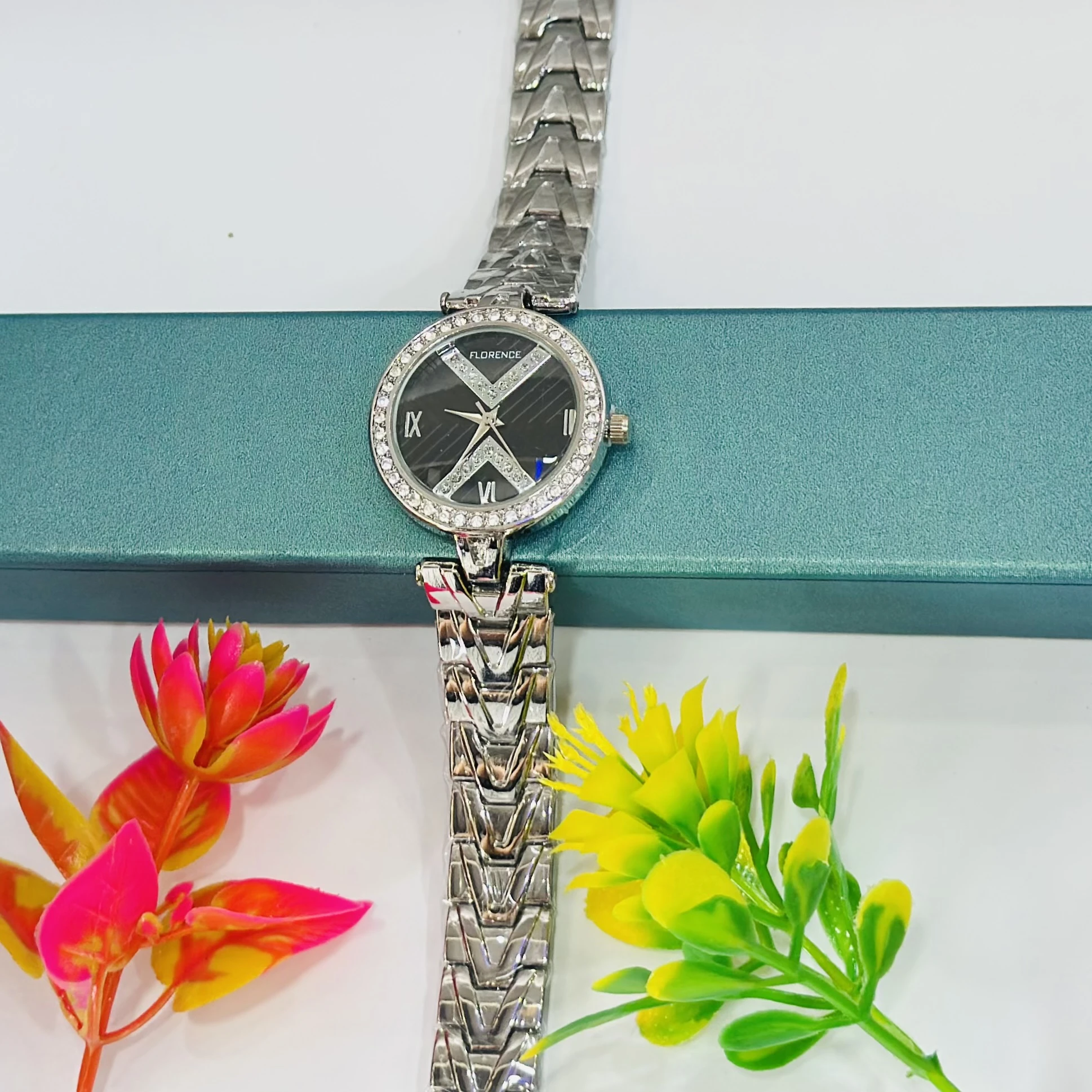 👉 Theme :- Florence women's watch with a black dial, silver-toned stainless steel case, and bracelet