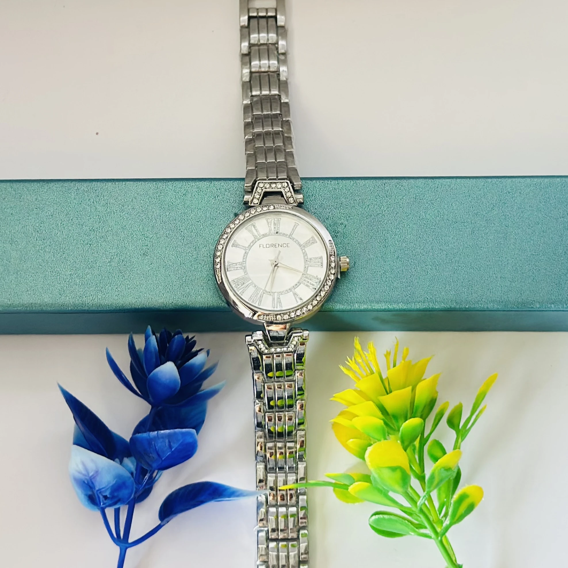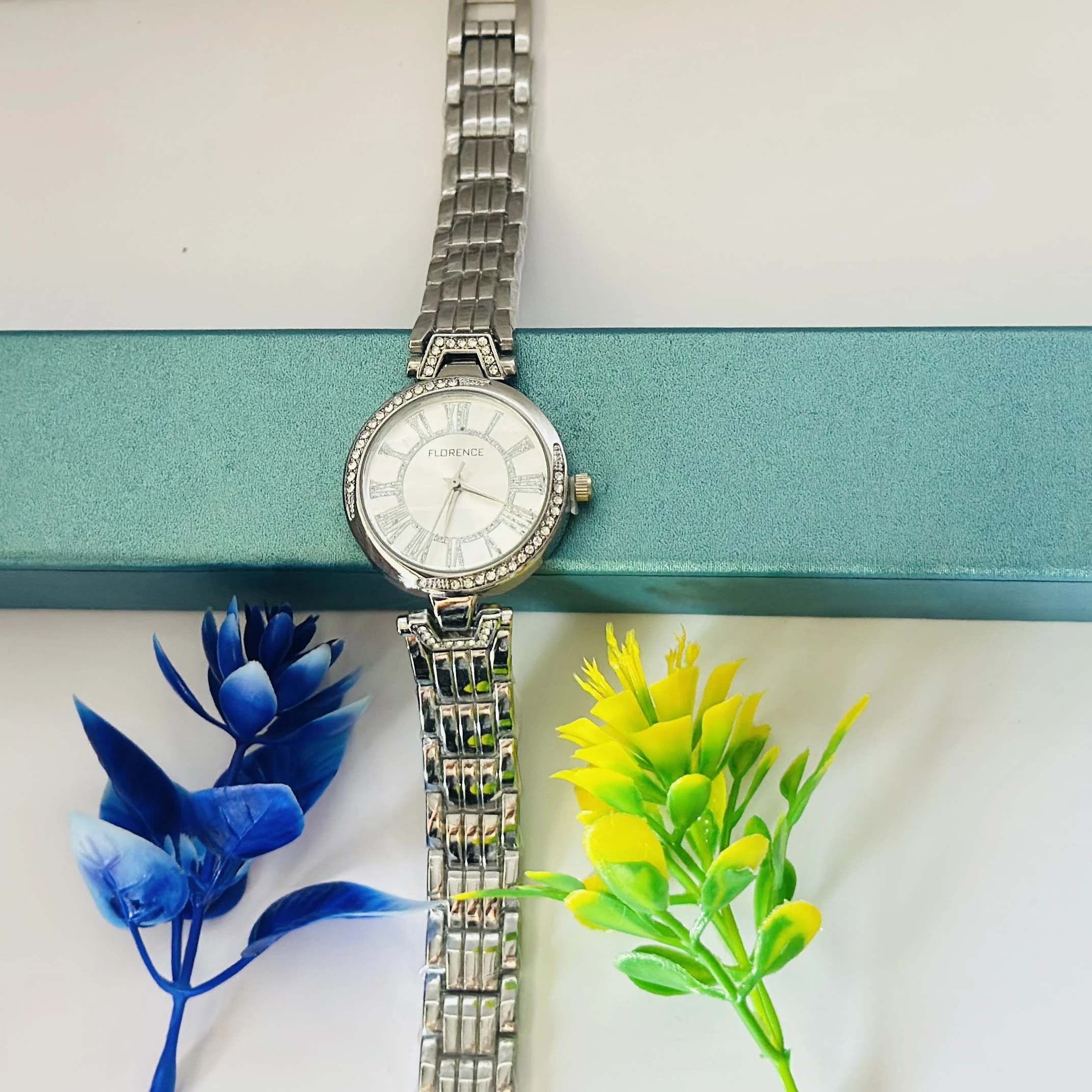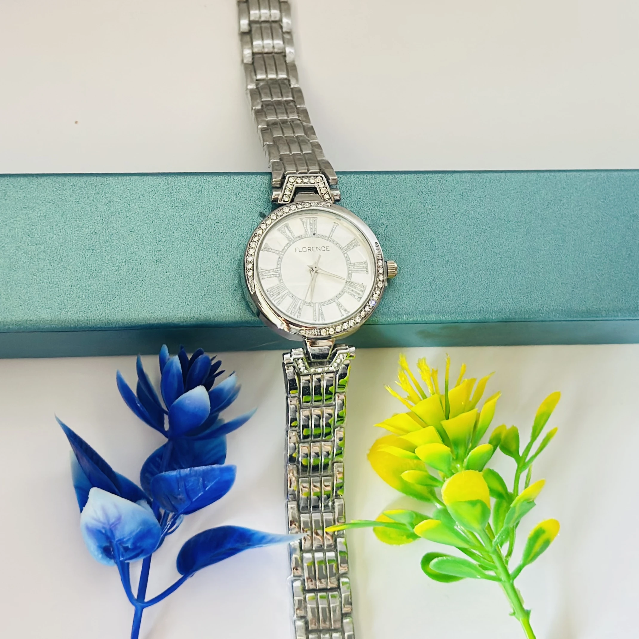 👉 Theme :- women's watch with a silver-tone stainless steel case and bracelet, a white dial with Roman numeral hour markers, and a diamond-set bezel.