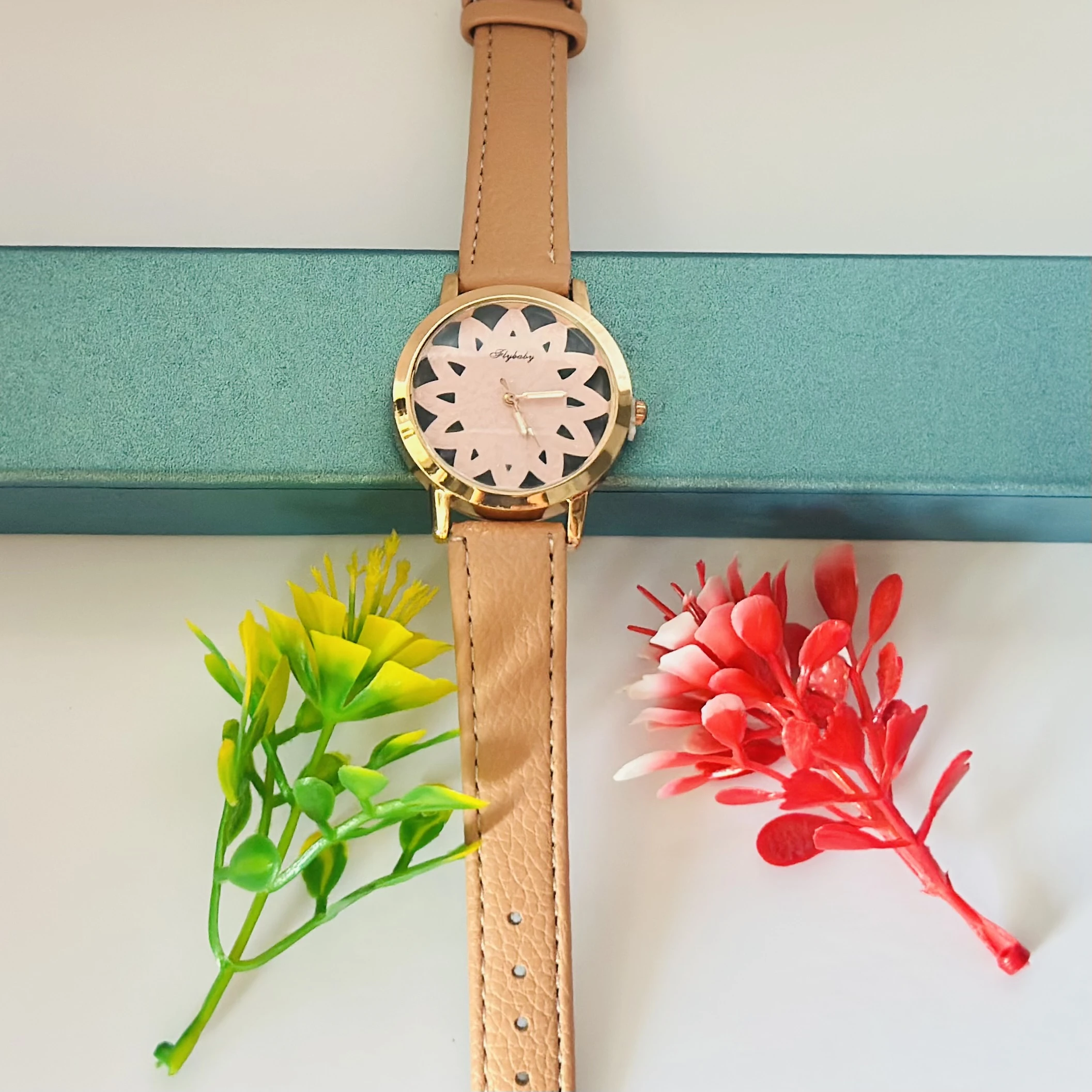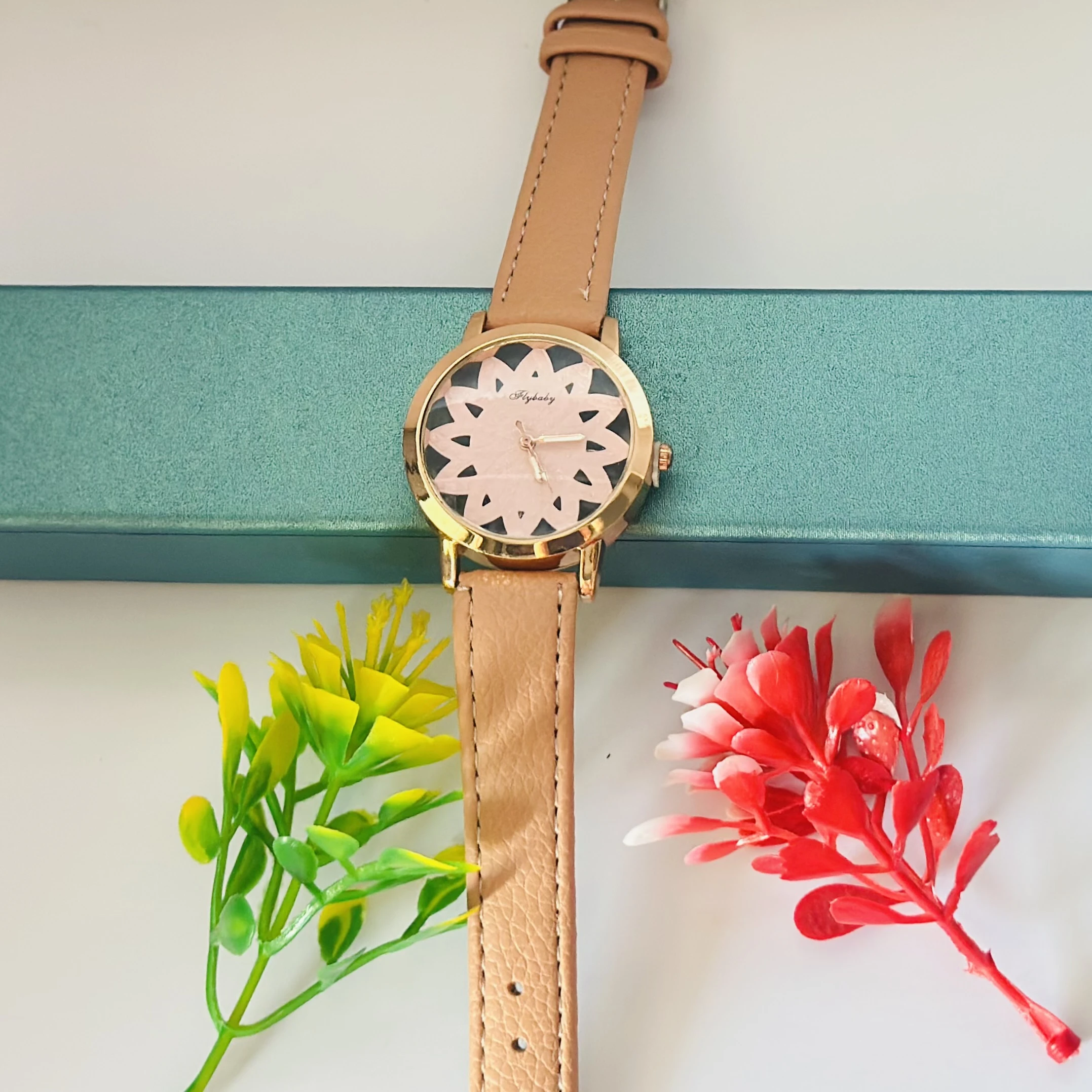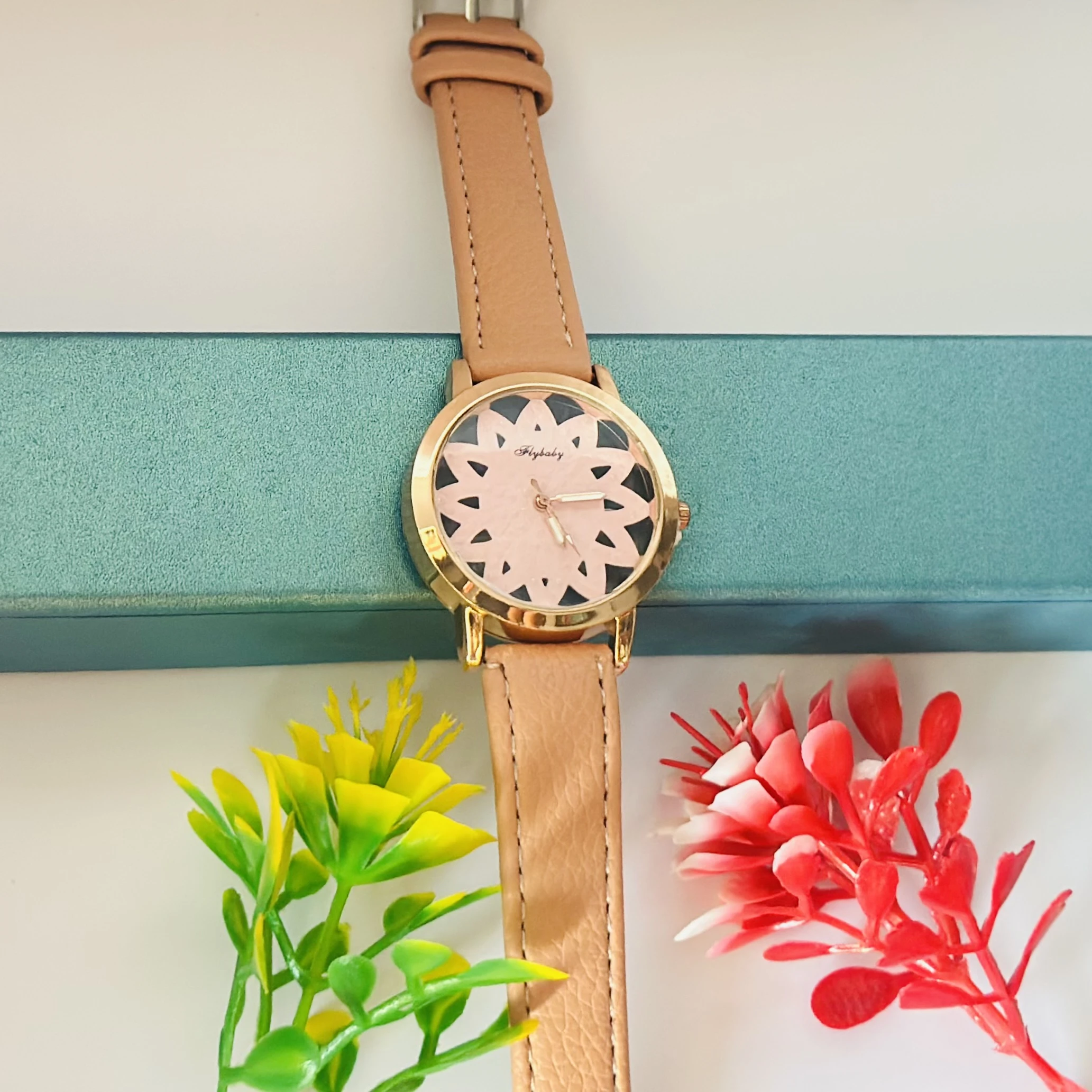 👉 Theme :- Flybaby flower watch with a peach/tan faux leather strap.