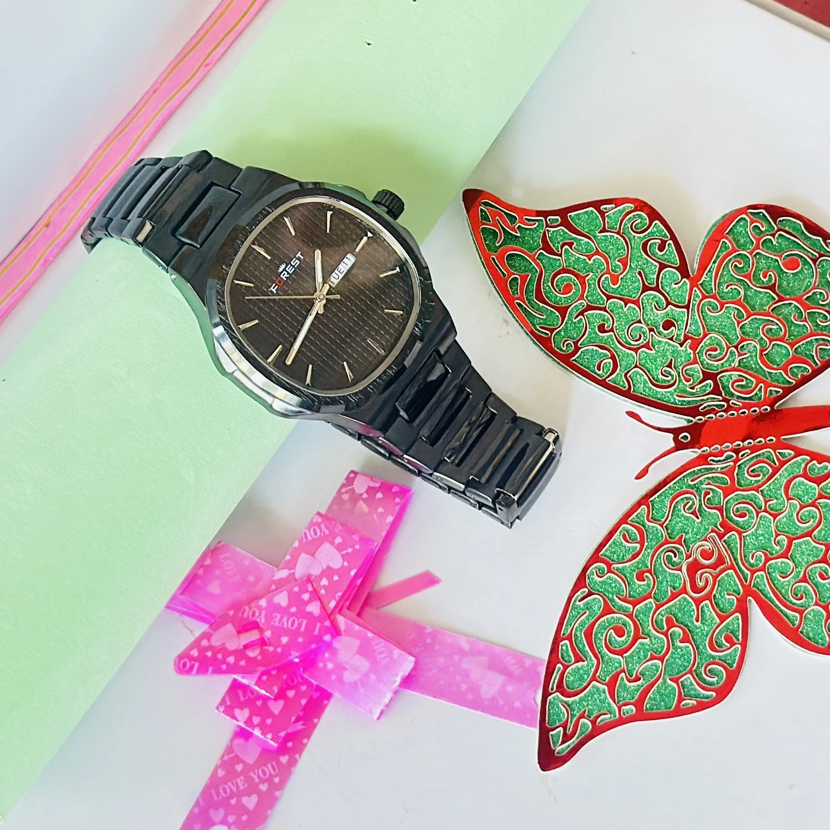👉 Theme :- Forest brand analog watch features a black dial and a matching black metal strap.