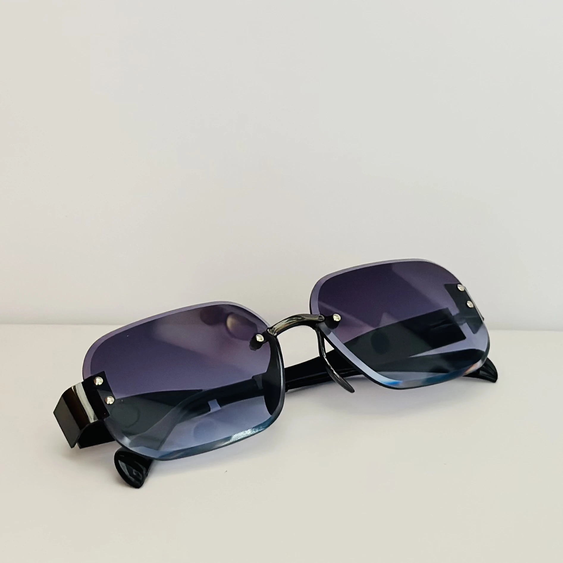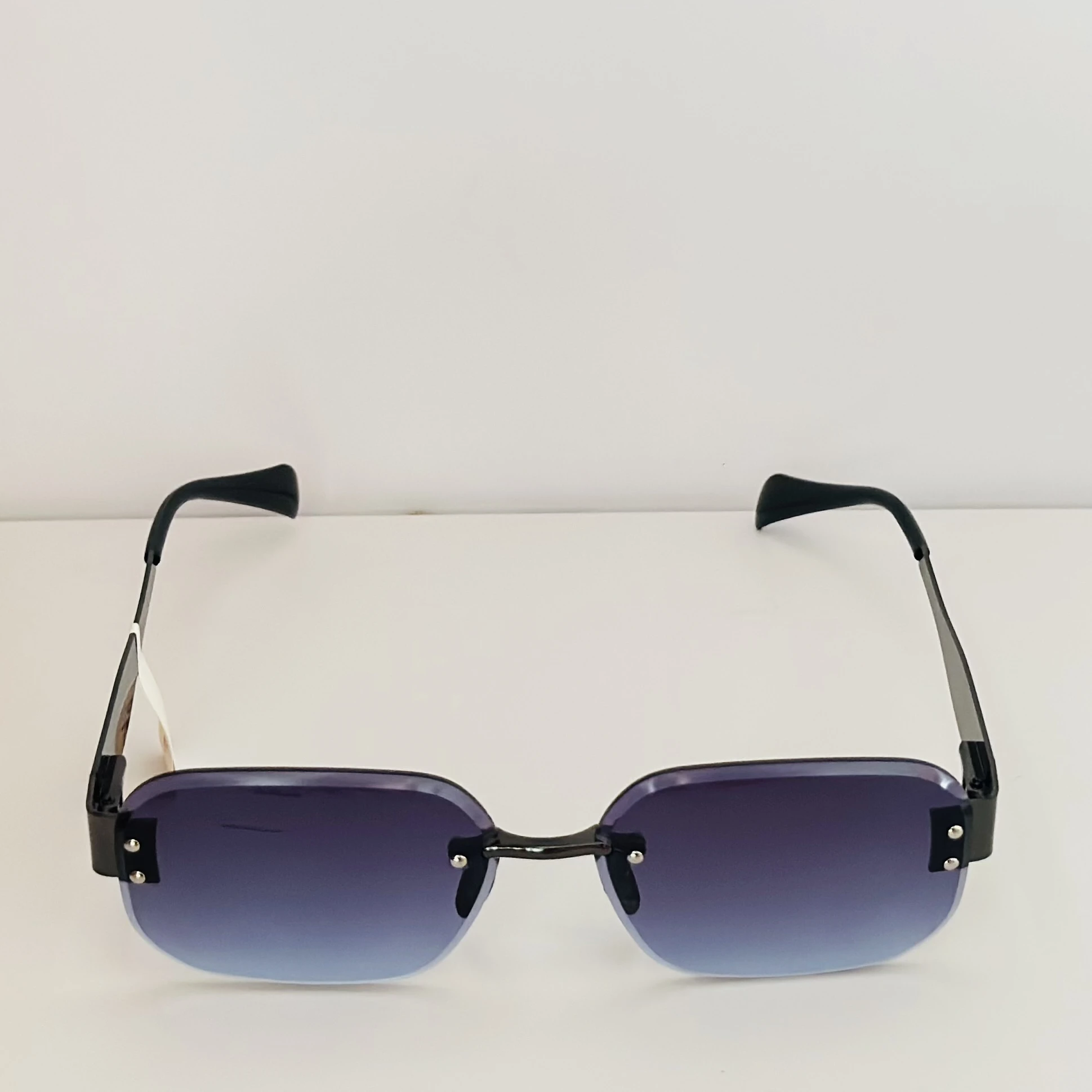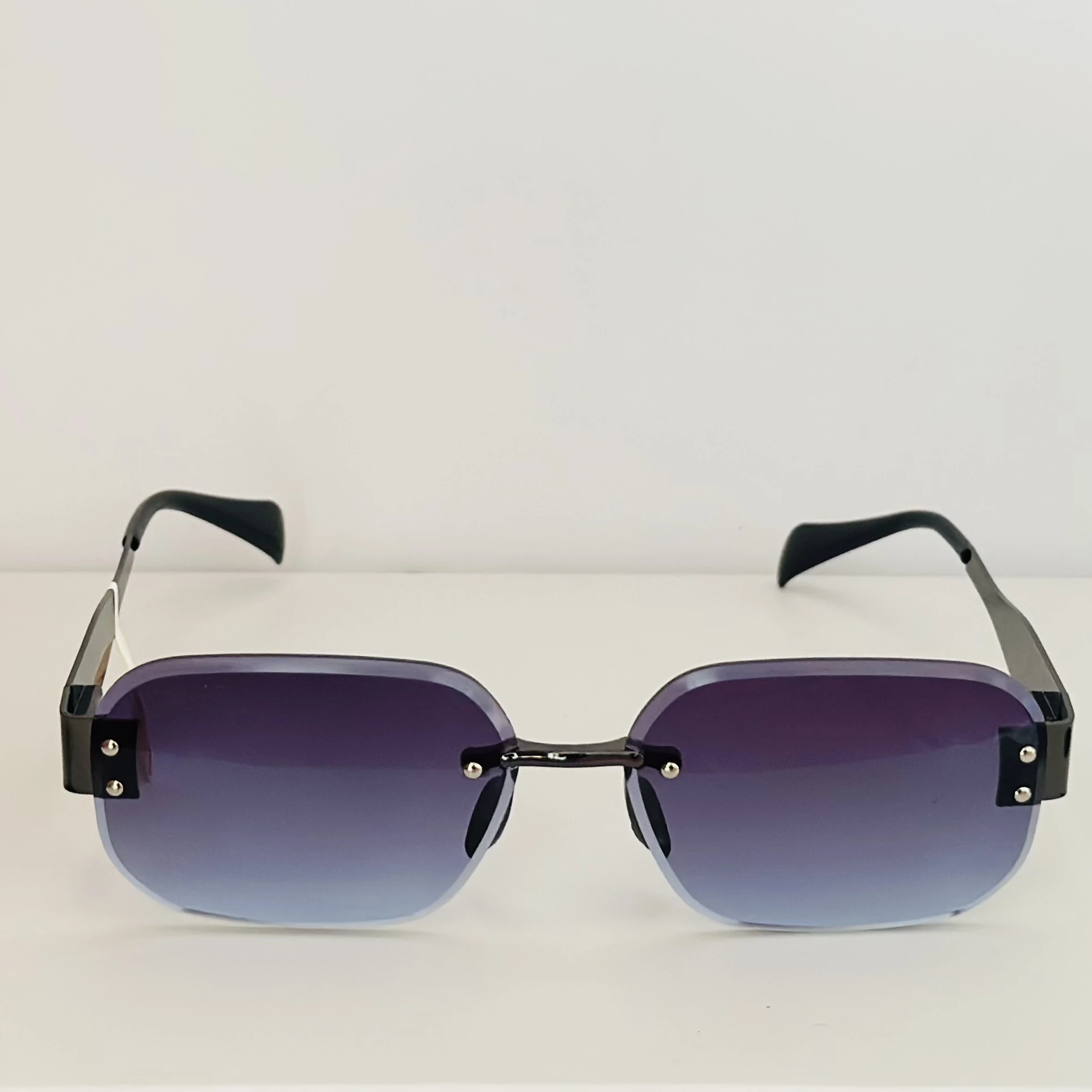 👉 Theme :- Fremeless cut-edge sunglasses with black temples and a gradient tint.