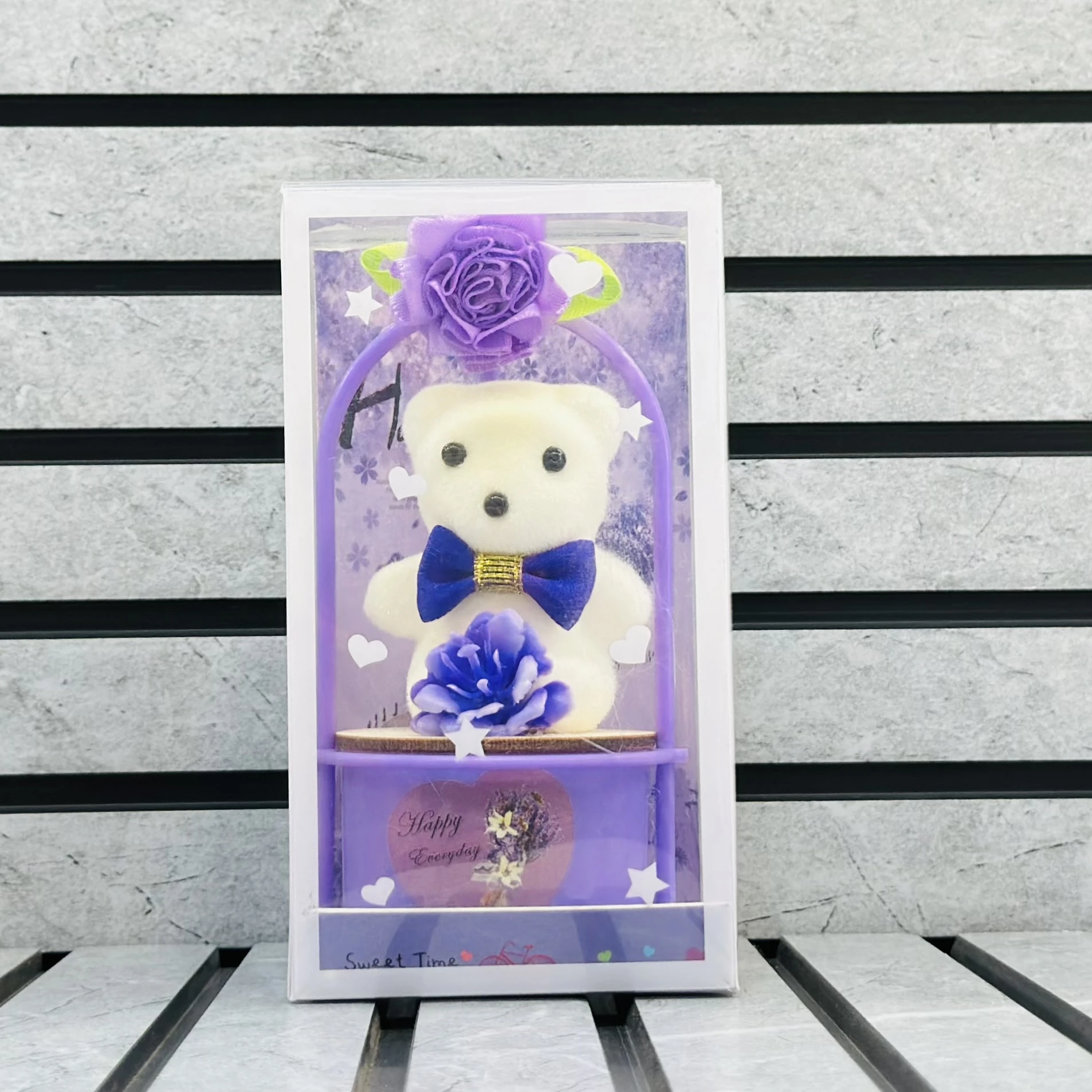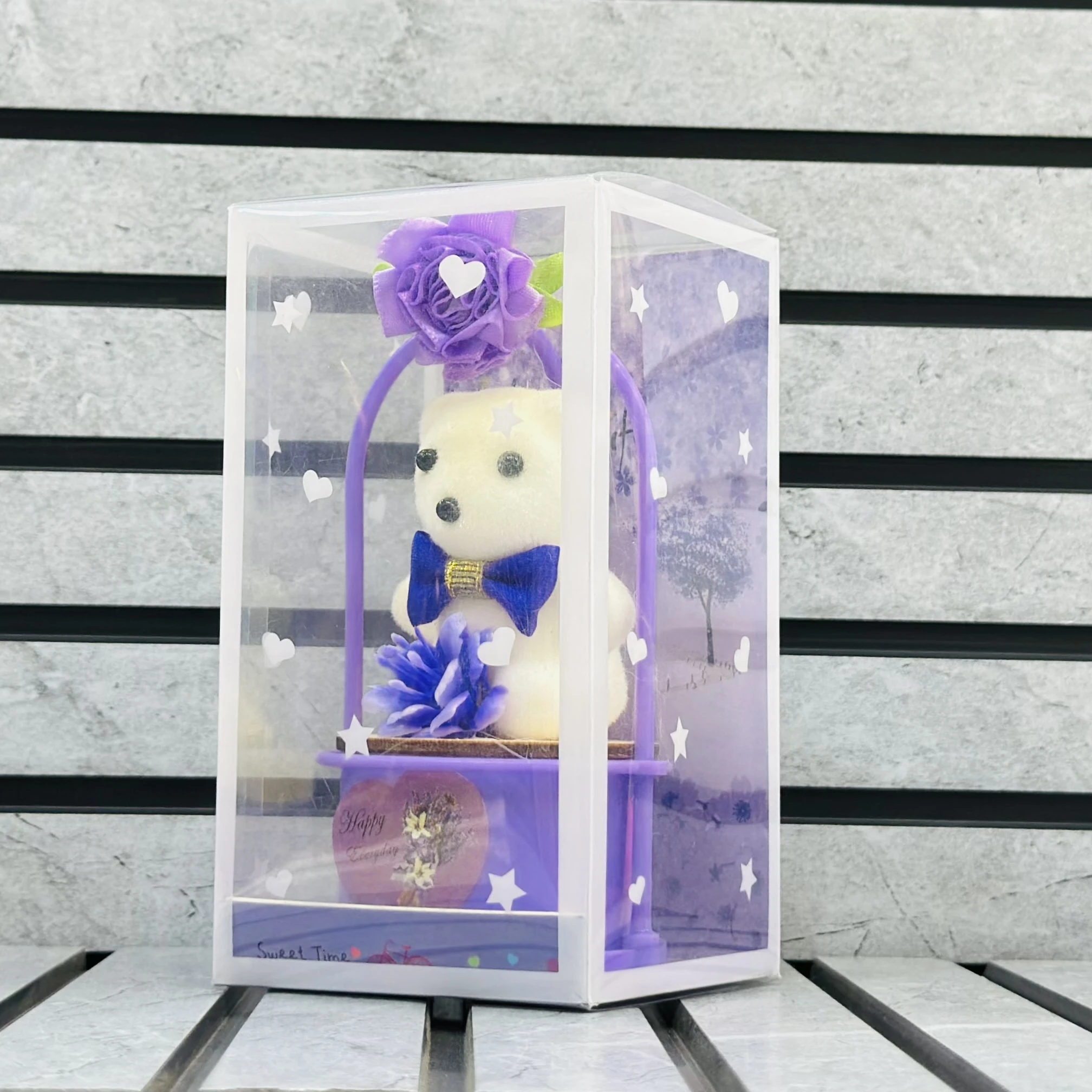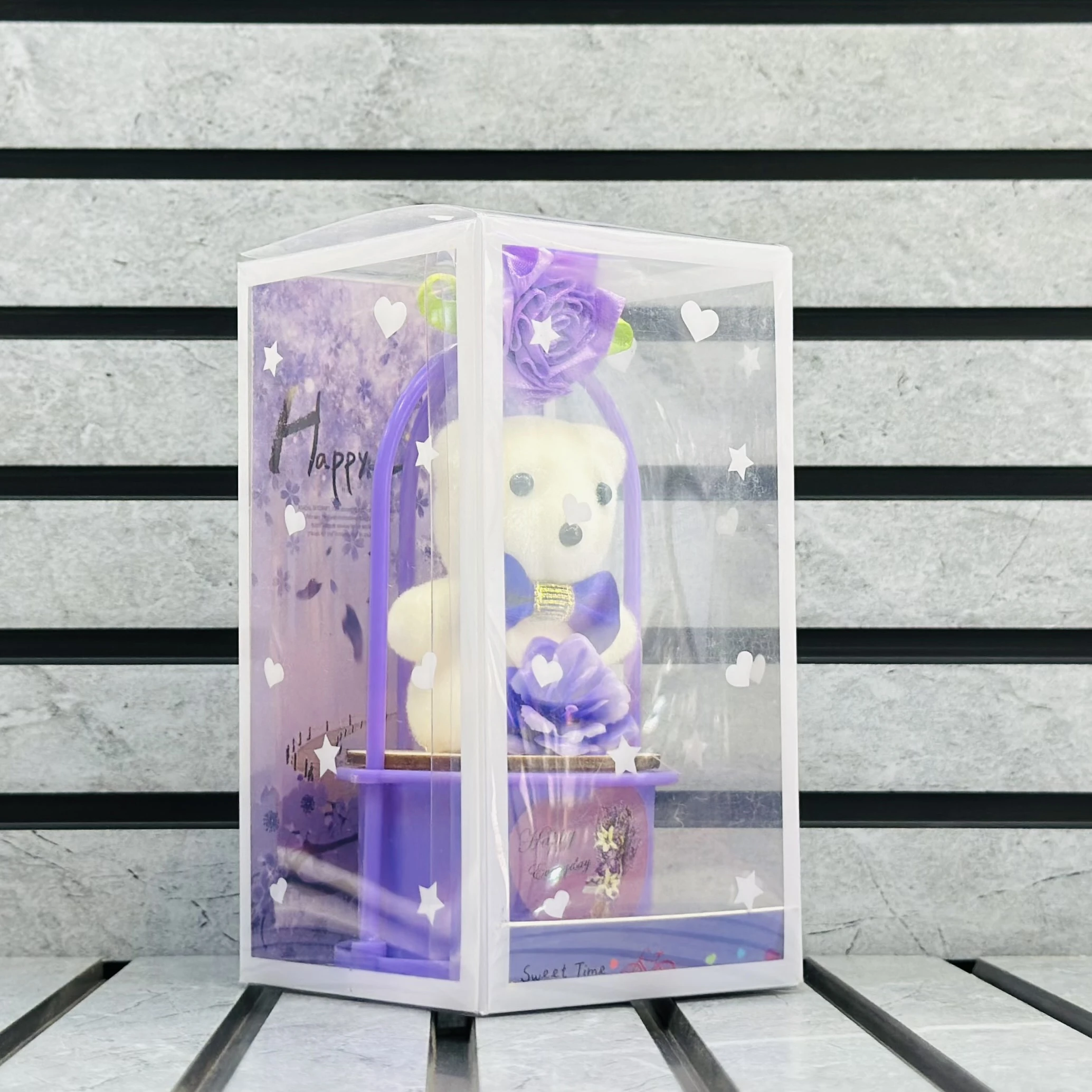 π Theme :- decorative gift set featuring a small white teddy bear in a purple display case or basket stand.